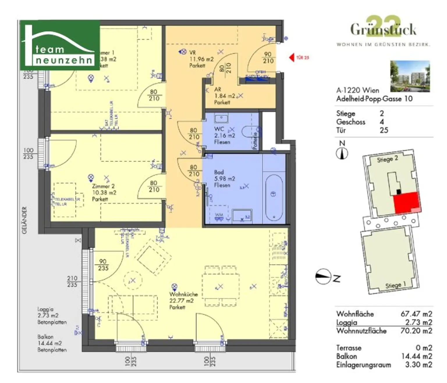 Die Wohnung mit ca. 67,47 m² Wohnfläche zzgl. ca. 14,44 m² Balkon und ca. 2,73 m² Loggia liegt im 4. Liftstock und gliedert sich in folgende tolle Raumaufteilung:
