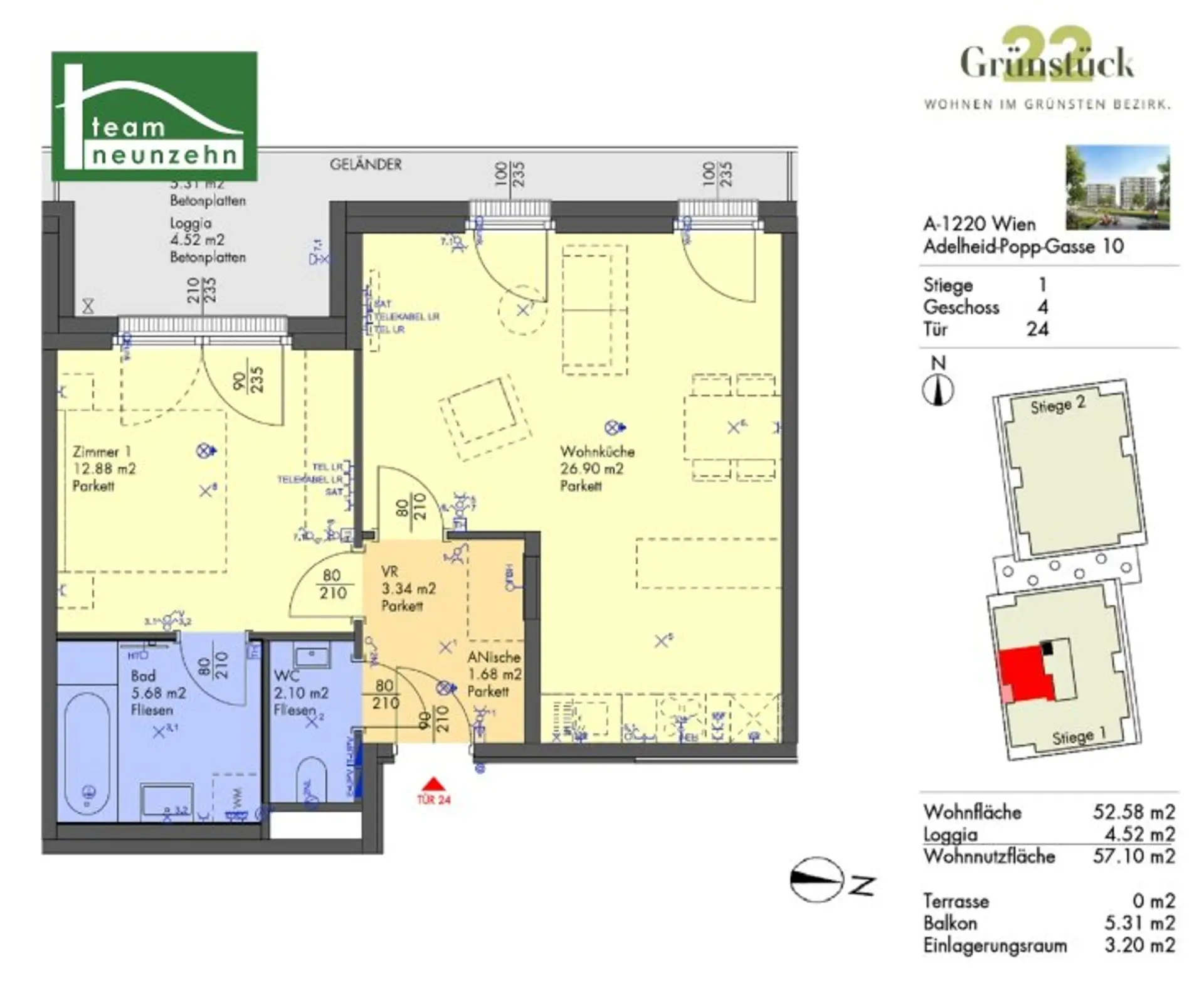Die 2-Zimmer-Wohnung mit ca. 52,58 m² Wohnfläche zzgl. ca. 5,31 m² Balkon und einer Loggia mit ca. 4,52 m² liegt im 4. Liftstock und gliedert sich in folgende tolle Raumaufteilung: