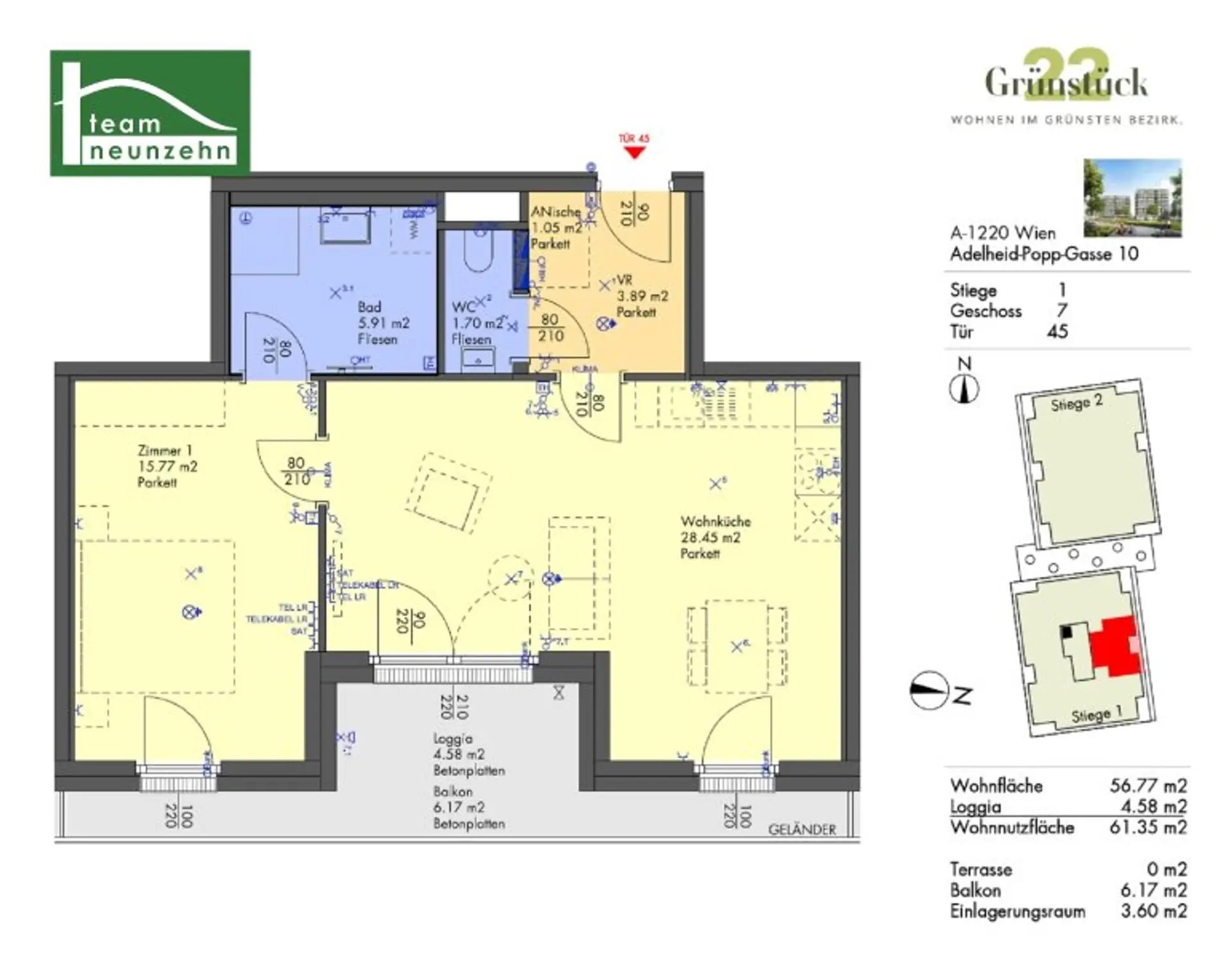 Die Wohnung mit ca. 56,77 m² Wohnfläche zzgl. ca. 6,17 m² Balkon und einer Loggia von ca. 4,58m² liegt im 7. Liftstock und gliedert sich in folgende tolle Raumaufteilung: