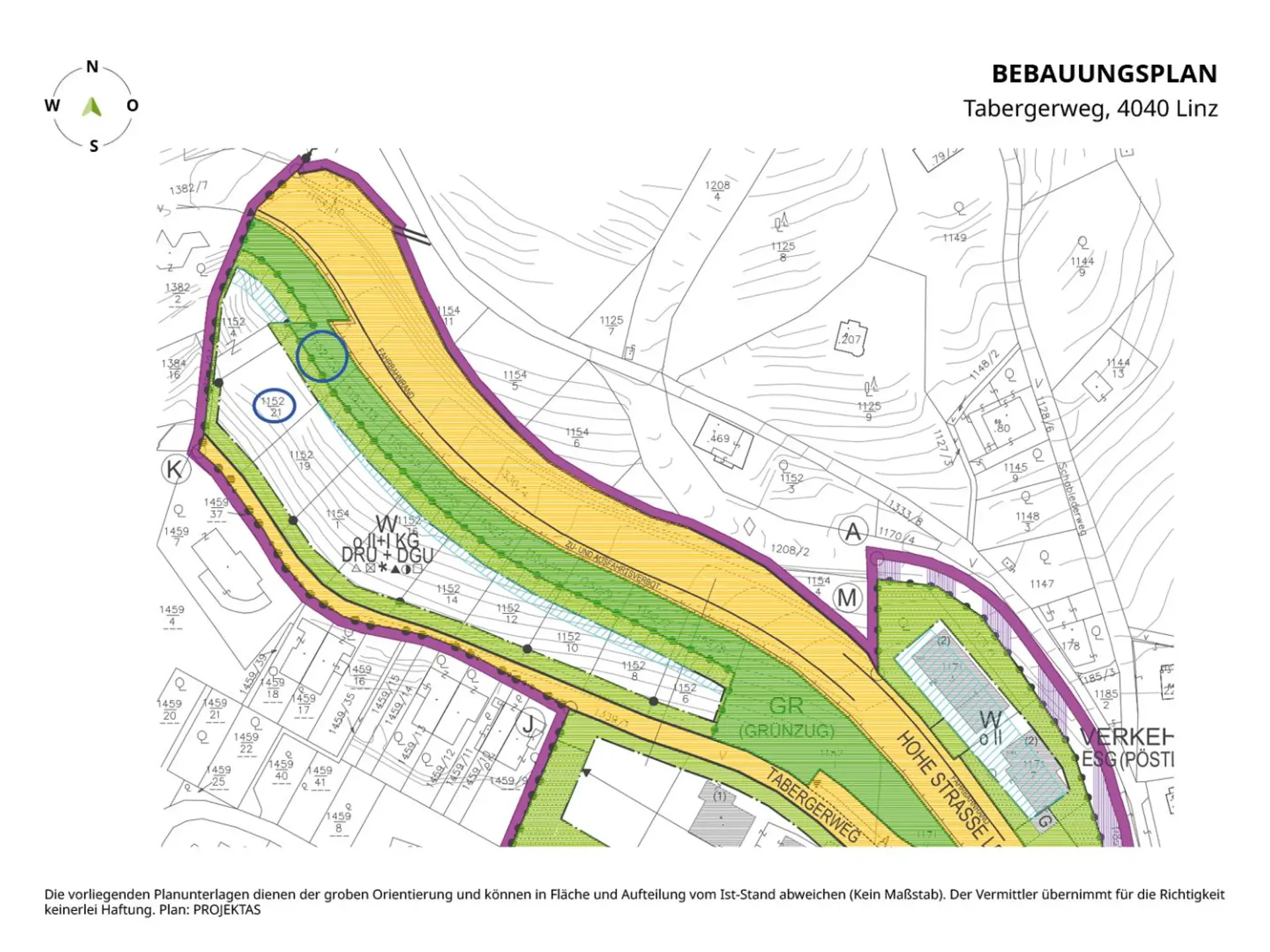 Das Grundstück selbst verfügt über eine Gesamtfläche von 969 m²: 784 m² davon sind als Wohngebiet gewidmet, der obere, kleine Teil mit 185 m² als Grünzug. Dem beiliegenden Bebauungsplan ist zu entnehmen, dass eine dreigeschossige Bebauung (zwei Vollgeschosse + ein Kellergeschoss) zulässig ist. Eine gute Orientierung über die mögliche Bebauung bieten die ostseitig gelegenen Neubauten der Nachbarschaft.
