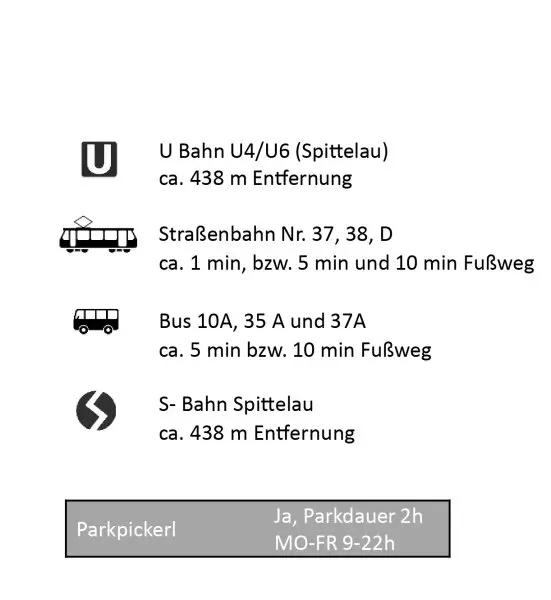 Die Anbindung an den öffentlichen Verkehr ist hervorragend – Straßenbahn, Bus, S-Bahn sowie die U-Bahnlinien U4 und U6 sind in kurzer Gehdistanz erreichbar. Die Wiener Innenstadt ist zudem in etwa zehn Minuten mit dem Auto erreichbar.