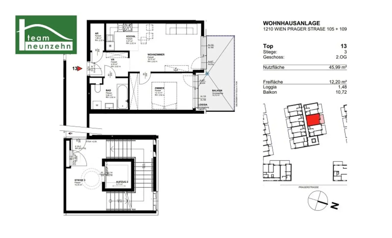 Die 2-Zimmer-Wohnung mit ca. 45,99 m² Wohnfläche sowie mit ca. 10,72 m² Balkon und ca. 1,48 m² Loggia befindet sich im 2. Obergeschoss und orientiert sich Richtung Norden.