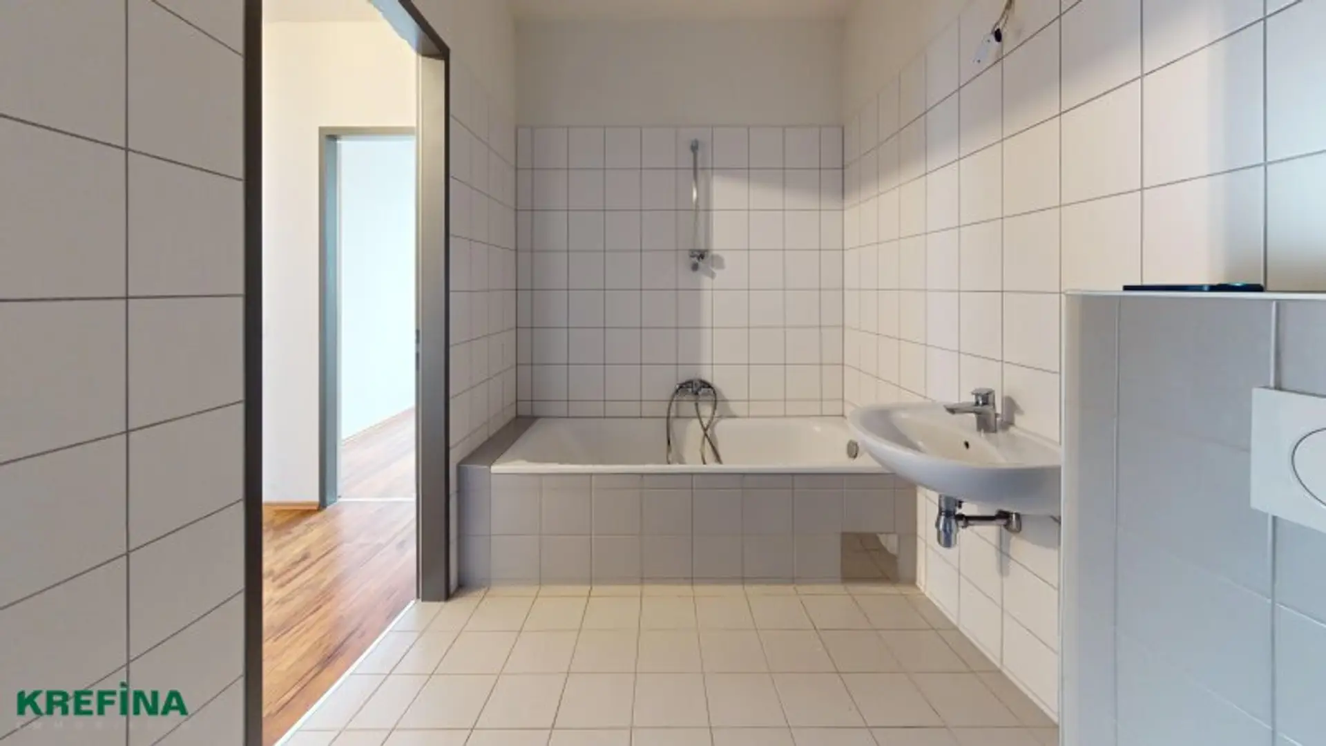 Das Badezimmer ist klassisch verfliest, verfügt über Badewanne, Waschmaschinenanschluss und WC. Die Warmwasser- und Heizungsaufbereitung wird zentral geregelt, der Verbrauch ist daher direkt mit dem Energielieferanten zu verrechnen.