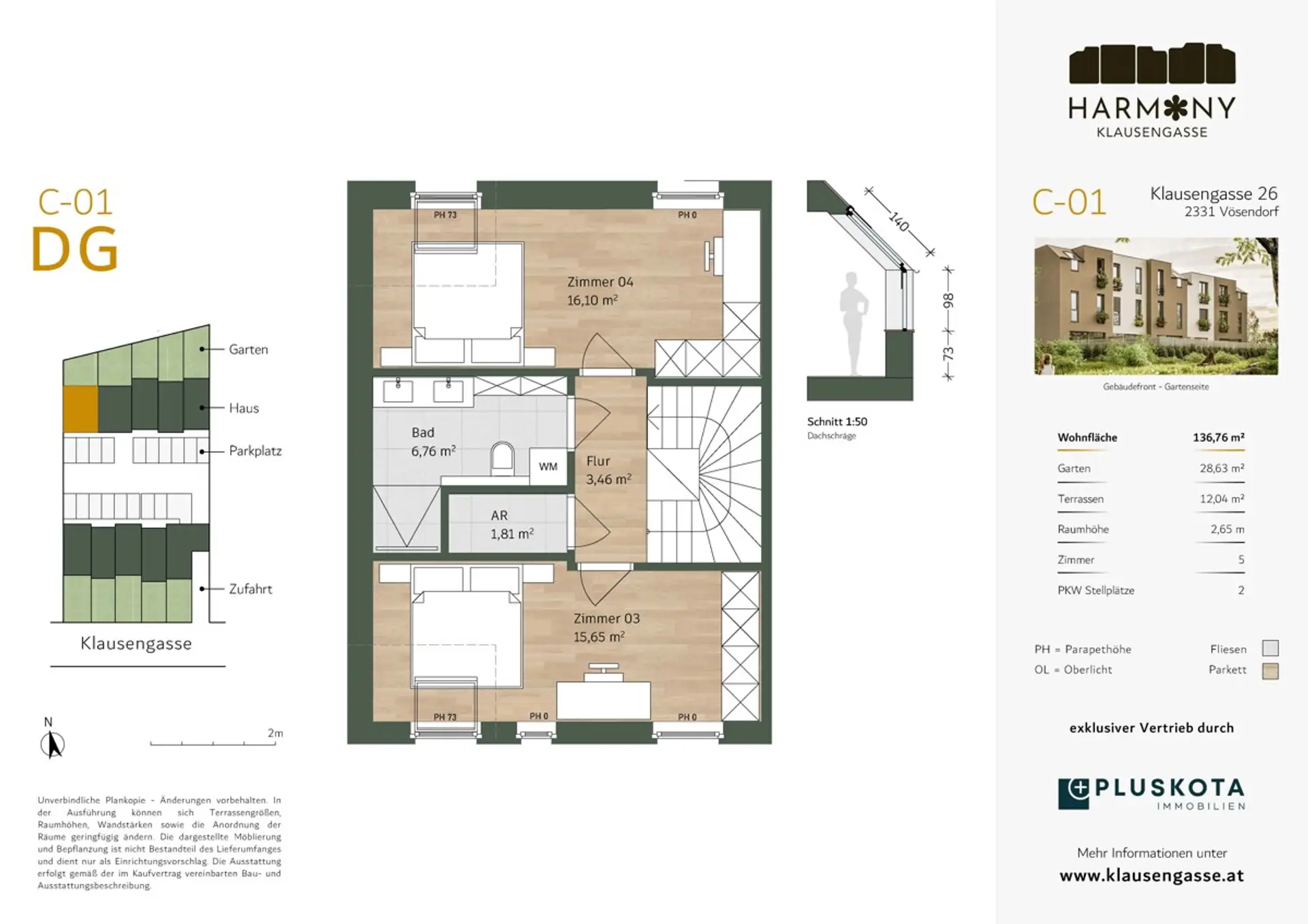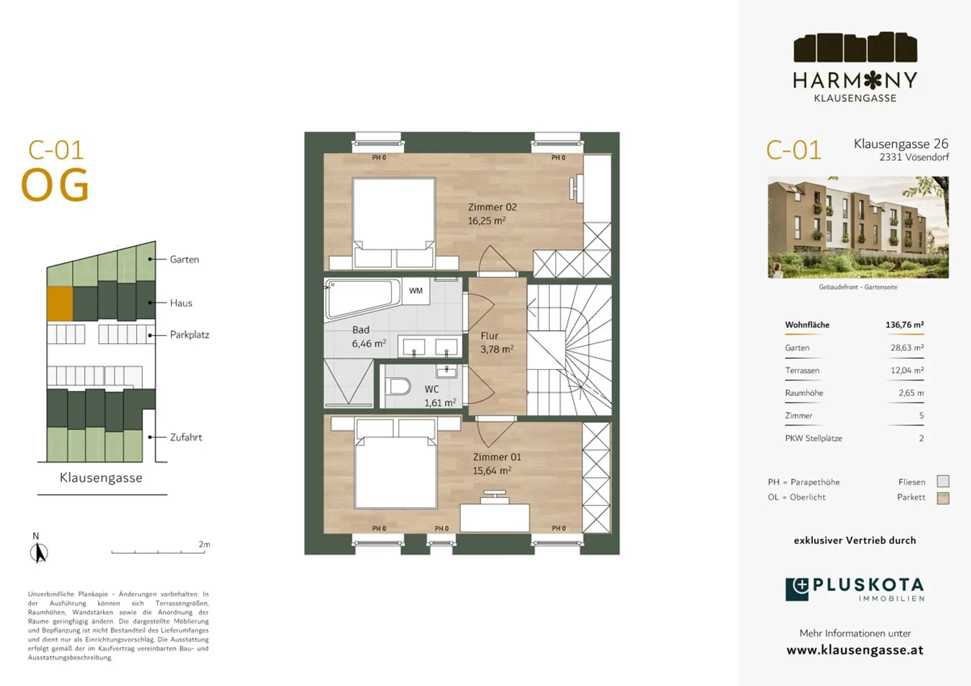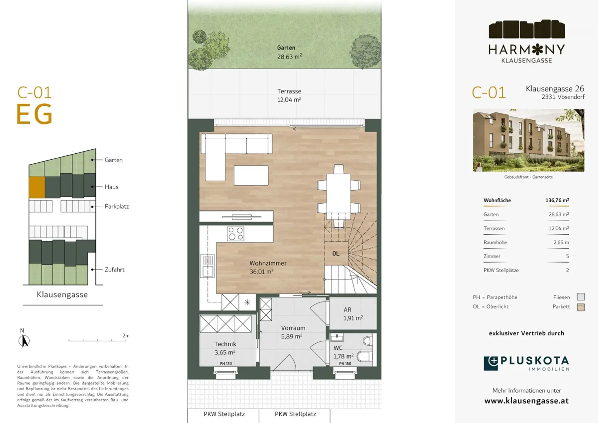 Mit dem Projekt HARMONY KLAUSENGASSE - STADTNAH WOHNEN. IM GRÜNEN LEBEN entsteht eines der exklusivsten Projekte in Vösendorf bestehend aus 10 Reihenhäusern, Terrassen, Gärten und 20 PKW Abstellplätzen. Besonderes Augenmerk liegt auf der gehobenen Ausstattung: Massive Ziegelbauweise, Fußbodenheizung für die Wintermonate und Kühldecken als beste Alternative zur Klimaanlage in den Sommermonaten. Edle Eichenparkettböden, zargenlose Innentüren sowie eine Alarmanlage sorgen für modernen Wohnkomfort und ein sicheres Zuhause. Das Haus 6 bietet eine ansprechende Raumhöhe von ca. 2,65m und empfängt Sie mit einem einladenden Eingangsbereich, der über eine Garderobe, einen praktischen Abstellraum und ein WC verfügt. Der offene Wohnbereich erstreckt sich über ca. 36m² und bietet Platz für eine stilvolle Küche sowie einen großen Esstisch und ein komfortables Sofa. Ein XXL Schiebeelement eröffnet den Zugang zum praktisch angelegten Garten. Über eine elegante Treppe gelangt man in das erste Obergeschoss, das zwei großzügige angelegte Zimmer, ein WC sowie ein Badezimmer mit Badewanne, Dusche und Doppelhandwaschbecken beherbergt. Ein weiteres Highlight ist das Dachgeschoss dieses mit zwei gemütlichen Zimmern einen praktischen Abstellraum sowie ein weiteres Badezimmer mit Dusche, Doppelhandwaschbecken und WC ausgestattet ist. Der Einheit stehen 2 PKW Abstellplätze zur Verfügung und können jeweils um EUR 11.500,- erworben werden.