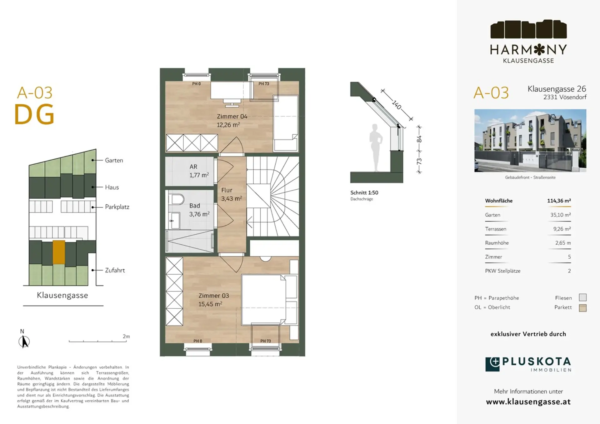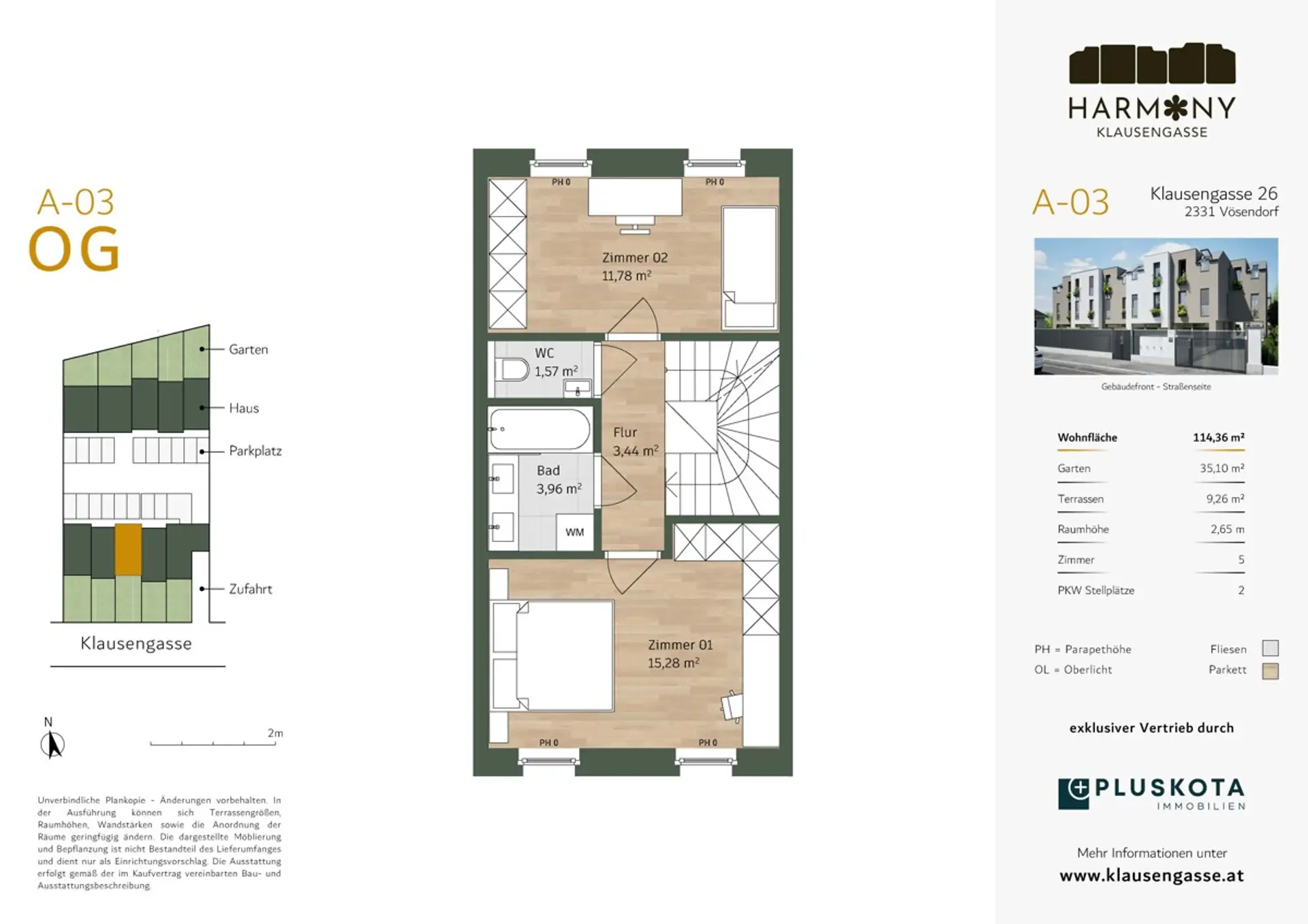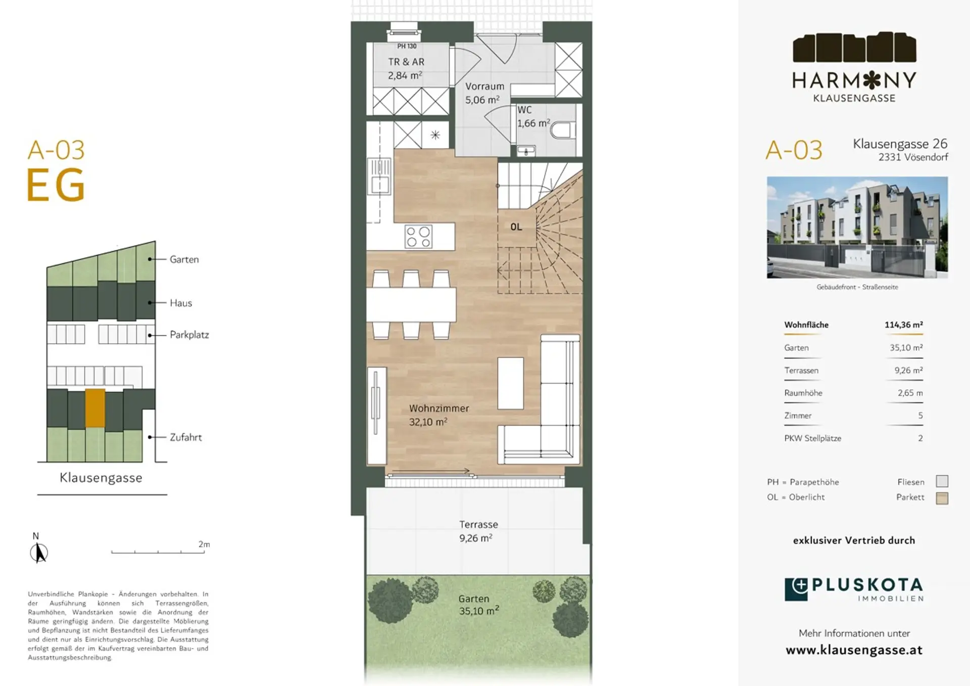 Mit dem Projekt HARMONY KLAUSENGASSE - STADTNAH WOHNEN. IM GRÜNEN LEBEN entsteht eines der exklusivsten Projekte in Vösendorf bestehend aus 10 Reihenhäusern, Terrassen, Gärten und 20 PKW Abstellplätzen. Besonderes Augenmerk liegt auf der gehobenen Ausstattung: Massive Ziegelbauweise, Fußbodenheizung für die Wintermonate und Kühldecken als beste Alternative zur Klimaanlage in den Sommermonaten. Edle Eichenparkettböden, zargenlose Innentüren sowie eine Alarmanlage sorgen für modernen Wohnkomfort und ein sicheres Zuhause. Das Haus 3 empfängt Sie mit einem einladenden Eingangsbereich, der über eine Garderobe und ein WC verfügt. Der offene Wohnbereich erstreckt sich über ca. 32m² und bietet Platz für eine stilvolle Küche sowie einen großen Esstisch und ein komfortables Sofa. Ein XXL Schiebeelement eröffnet den Zugang zum praktisch angelegten Garten. Über eine elegante Treppe gelangt man in das erste Obergeschoss, das zwei helle und freundliche Zimmer, ein WC sowie ein Badezimmer mit Badewanne und Doppelhandwaschbecken beherbergt. Ein weiteres Highlight ist das Dachgeschoss dieses mit zwei gemütlichen Schlafzimmern einen praktischen Abstellraum sowie einem weiteren Badezimmer mit Dusche, Handwaschbecken und WC ausgestattet ist. Der Einheit stehen 2 PKW Abstellplätze zur Verfügung und können jeweils um EUR 11.500,- erworben werden.