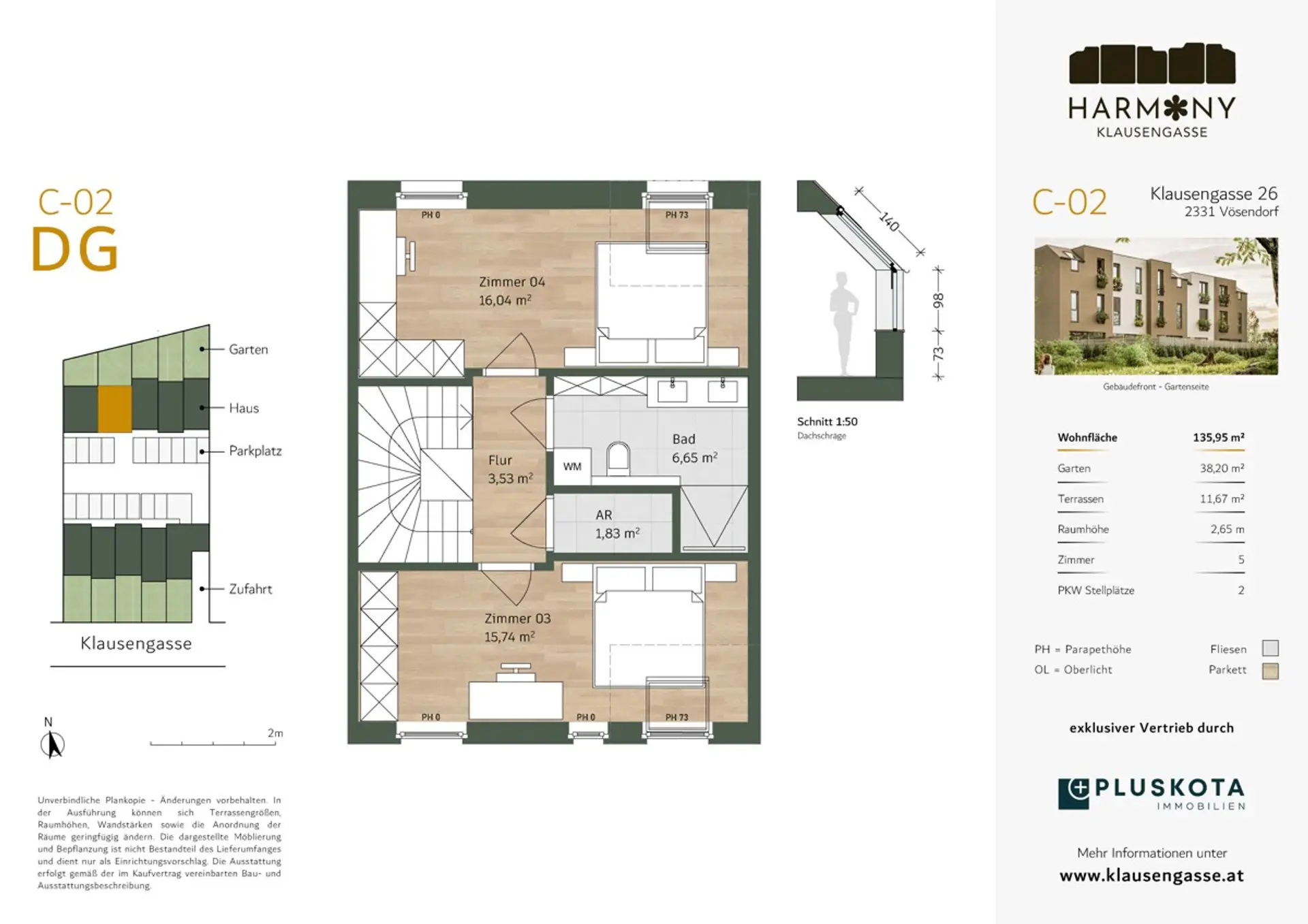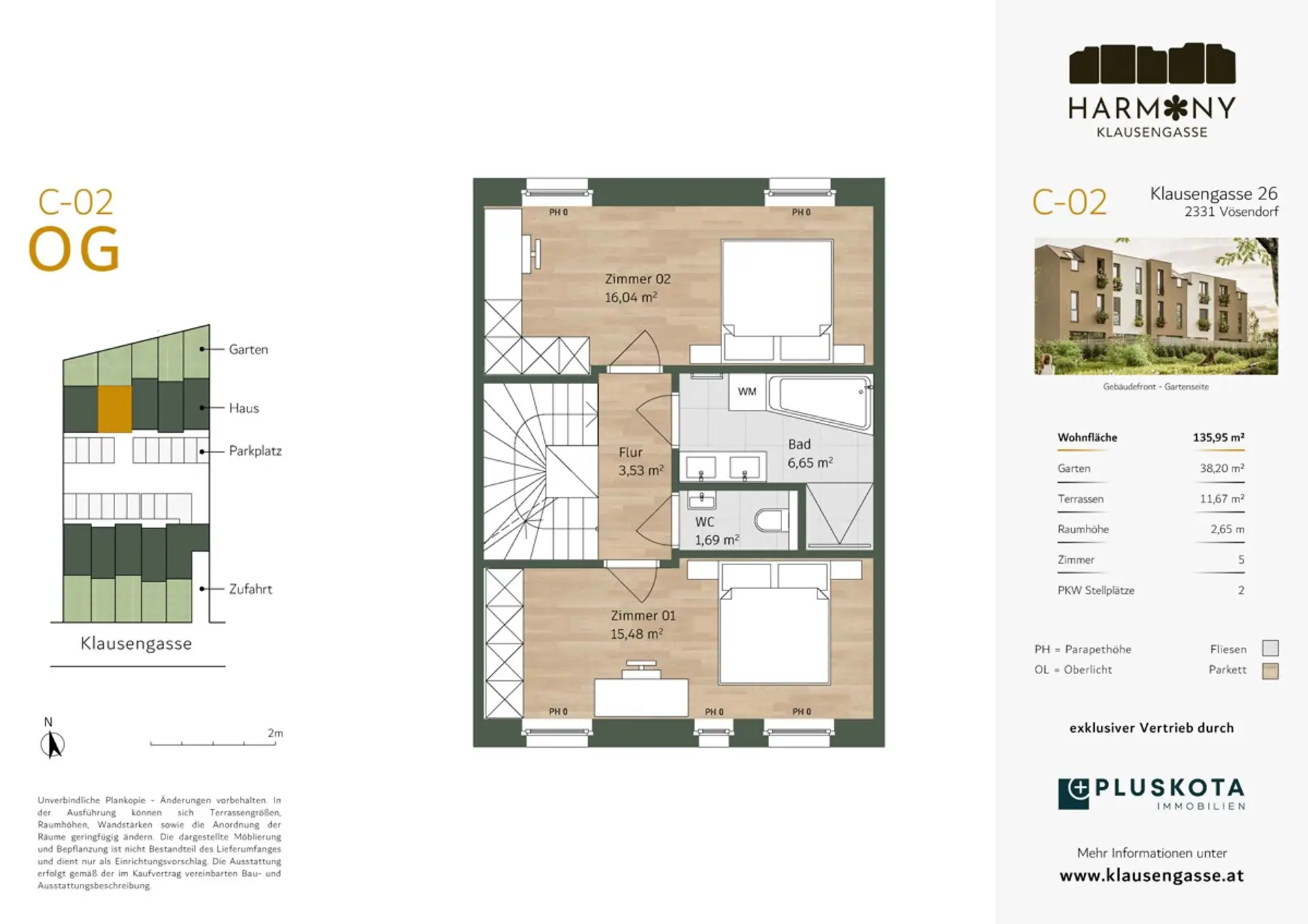 Mit dem Projekt HARMONY KLAUSENGASSE - STADTNAH WOHNEN. IM GRÜNEN LEBEN entsteht eines der exklusivsten Projekte in Vösendorf bestehend aus 10 Reihenhäusern, Terrassen, Gärten und 20 PKW Abstellplätzen. Besonderes Augenmerk liegt auf der gehobenen Ausstattung: Massive Ziegelbauweise, Fußbodenheizung für die Wintermonate und Kühldecken als beste Alternative zur Klimaanlage in den Sommermonaten. Edle Eichenparkettböden, zargenlose Innentüren sowie eine Alarmanlage sorgen für modernen Wohnkomfort und ein sicheres Zuhause. Das Haus 7 bietet eine ansprechende Raumhöhe von ca. 2,65m und empfängt Sie mit einem einladenden Eingangsbereich, der über eine Garderobe, ein WC und einen praktischen Abstellraum verfügt. Der offene Wohnbereich erstreckt sich über ca. 35,5m² und bietet Platz für eine stilvolle Küche sowie einen großen Esstisch und ein komfortables Sofa. Ein XXL Schiebeelement eröffnet den Zugang zum praktisch angelegten Garten. Über eine elegante Treppe gelangt man in das erste Obergeschoss, das zwei großzügige angelegte Zimmer, ein WC sowie ein Badezimmer mit Badewanne, Dusche und Doppelhandwaschbecken beherbergt. Ein weiteres Highlight ist das Dachgeschoss dieses mit zwei hellen und freundlichen Zimmern einen praktischen Abstellraum sowie einem weiteren Badezimmer mit Dusche, Doppelhandwaschbecken und WC ausgestattet ist. Der Einheit stehen 2 PKW Abstellplätze zur Verfügung und können jeweils um EUR 11.500,- erworben werden.