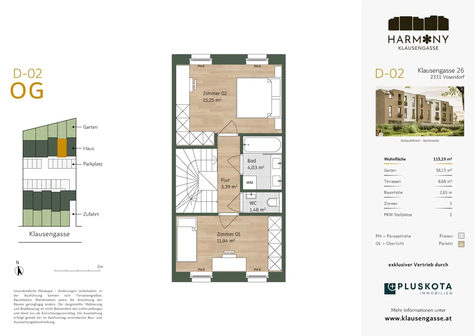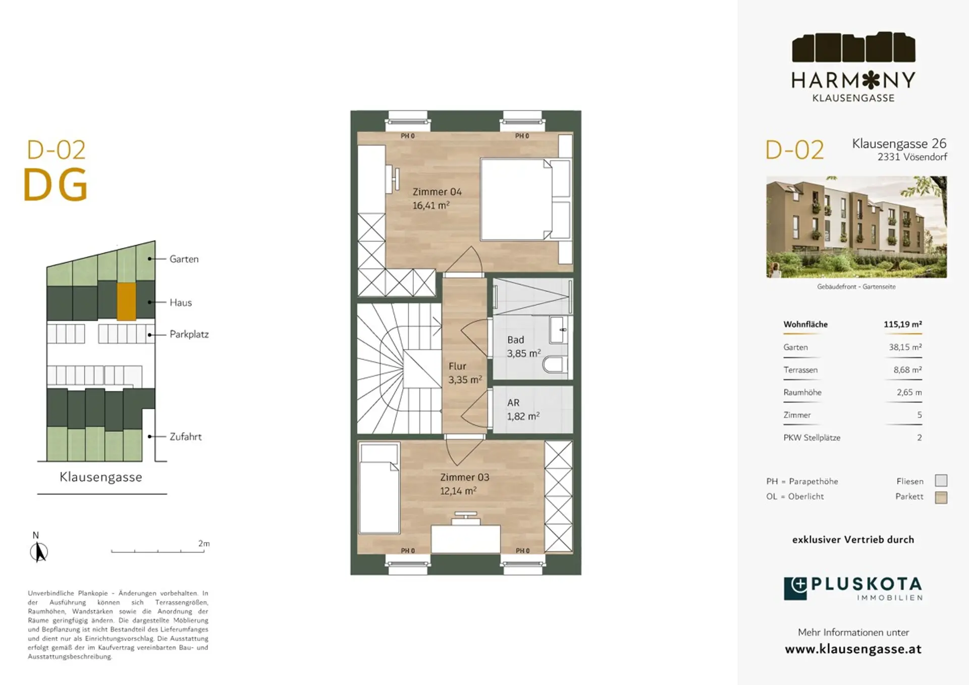 Mit dem Projekt HARMONY KLAUSENGASSE - STADTNAH WOHNEN. IM GRÜNEN LEBEN entsteht eines der exklusivsten Projekte in Vösendorf bestehend aus 10 Reihenhäusern, Terrassen, Gärten und 20 PKW Abstellplätzen. Besonderes Augenmerk liegt auf der gehobenen Ausstattung: Massive Ziegelbauweise, Fußbodenheizung für die Wintermonate und Kühldecken als beste Alternative zur Klimaanlage in den Sommermonaten. Edle Eichenparkettböden, zargenlose Innentüren sowie eine Alarmanlage sorgen für modernen Wohnkomfort und ein sicheres Zuhause. Das Haus 9 bietet eine ansprechende Raumhöhe von ca. 2,65m und empfängt Sie mit einem einladenden Eingangsbereich, der über eine Garderobe und ein WC verfügt. Der offene Wohnbereich erstreckt sich über ca. 32m² und bietet Platz für eine stilvolle Küche sowie einen großen Esstisch und ein komfortables Sofa. Ein XXL Schiebeelement eröffnet den Zugang zum praktisch angelegten Garten. Über eine elegante Treppe gelangt man in das erste Obergeschoss, das zwei gemütliche Zimmer, ein WC sowie ein Badezimmer mit Badewanne und Doppelhandwaschbecken beherbergt. Ein weiteres Highlight ist das Dachgeschoss dieses mit zwei hellen und freundlichen Zimmern einen praktischen Abstellraum sowie einem weiteren Badezimmer mit Dusche, Handwaschbecken und WC ausgestattet ist. Der Einheit stehen 2 PKW Abstellplätze zur Verfügung und können jeweils um EUR 11.500,- erworben werden.
