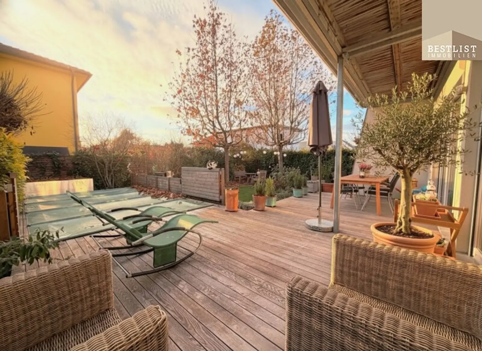 Bezugsfertige Doppelhaushälfte mit eingewachsener Garten und Altbaumbestand und Privatsphäre, neuwertige Terrasse aus Thermoesche mit Markise, Kindersicheres Pool, Doppelcarport, Fernwärme