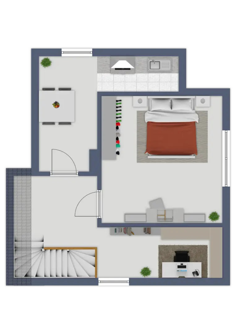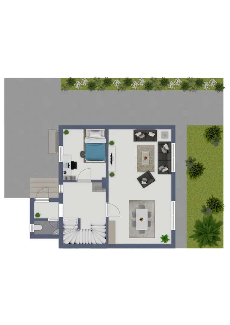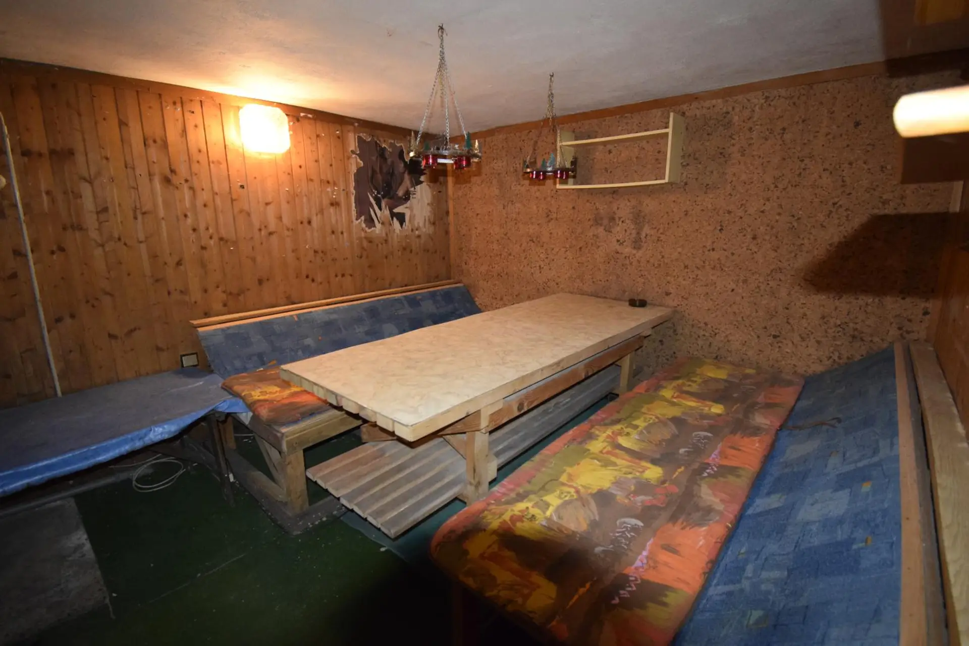 Das Erdgeschoß besteht aus Vorraum, Wohnzimmer, einem weiteren Zimmer und Wc.