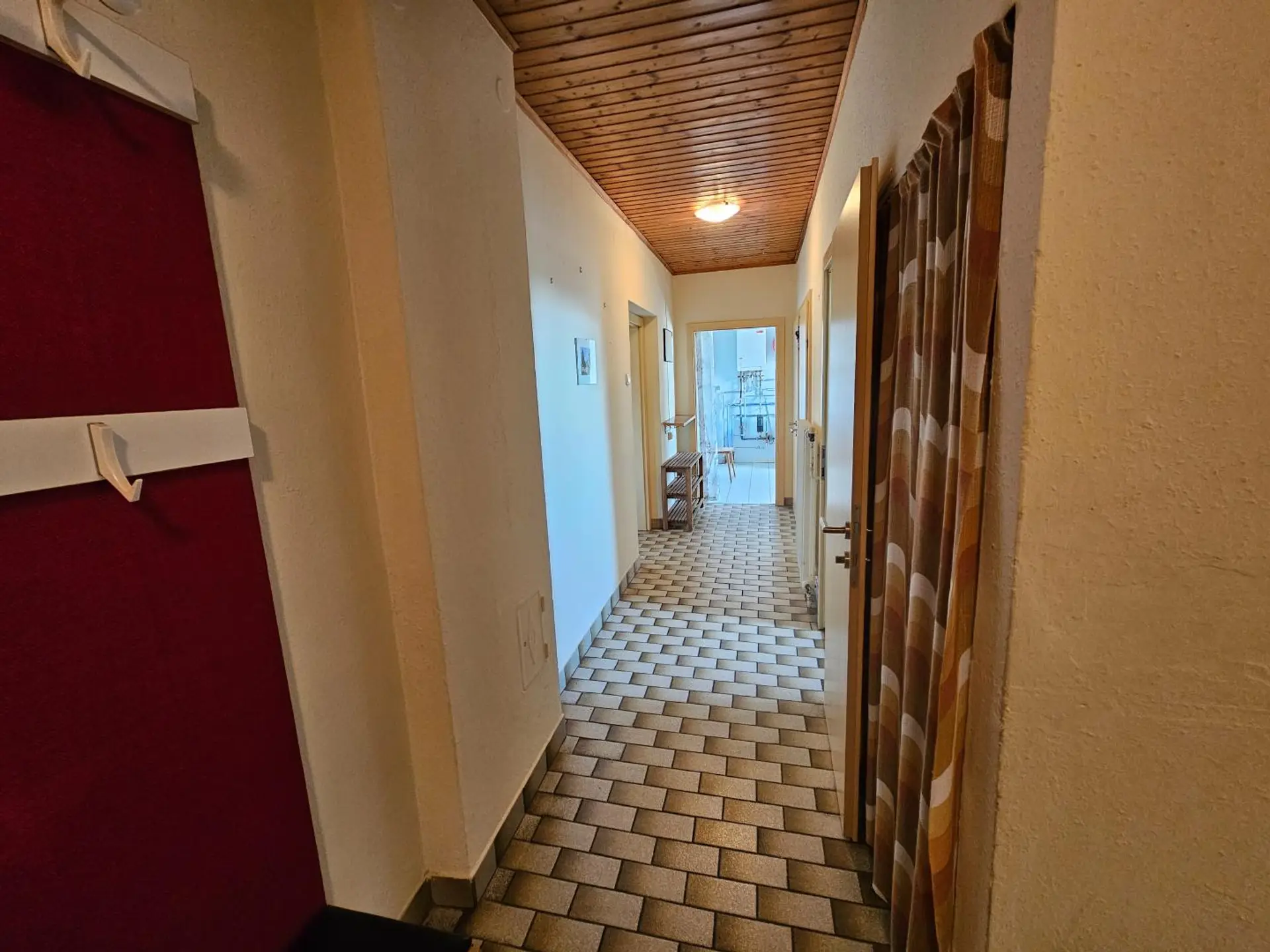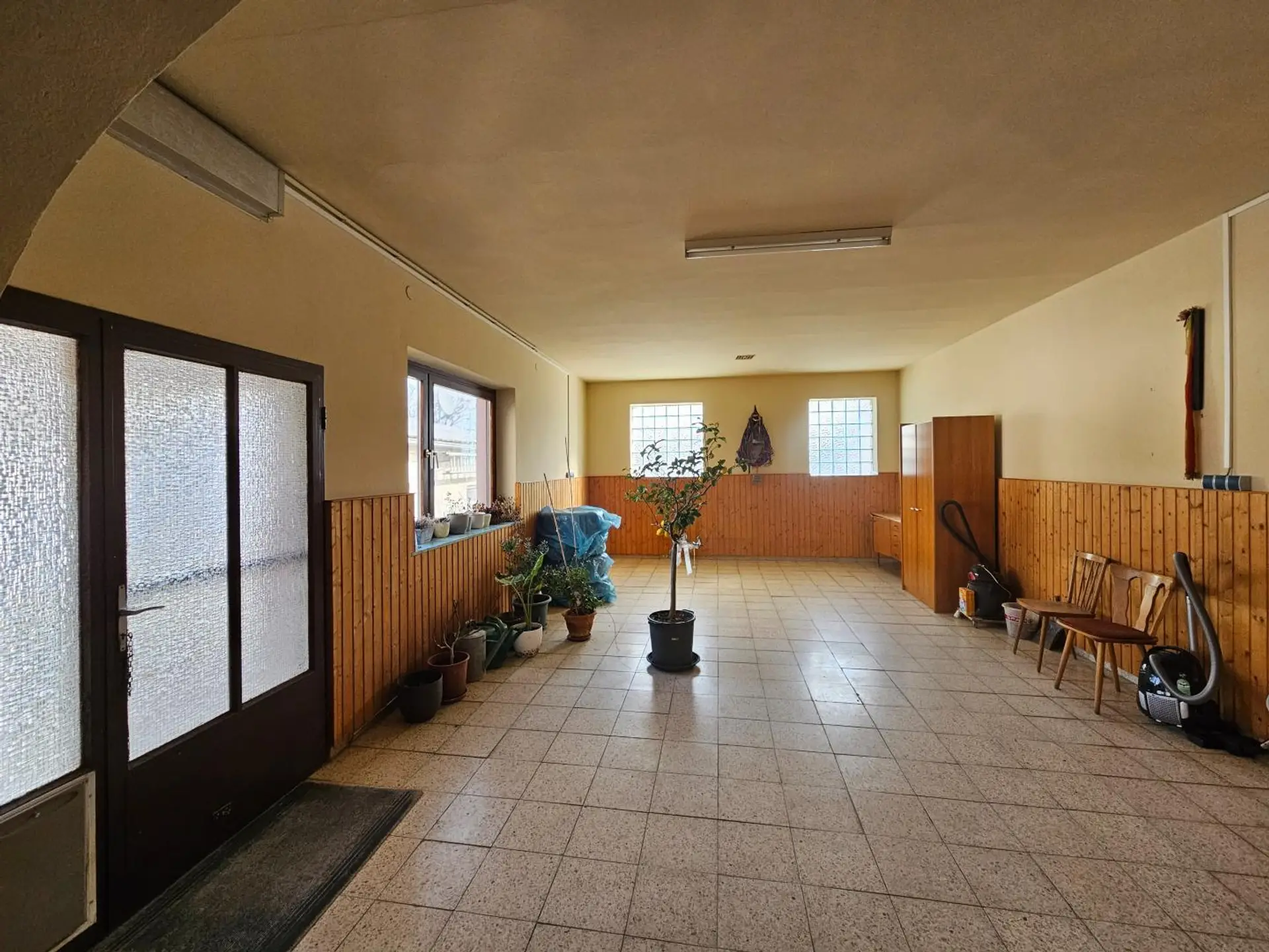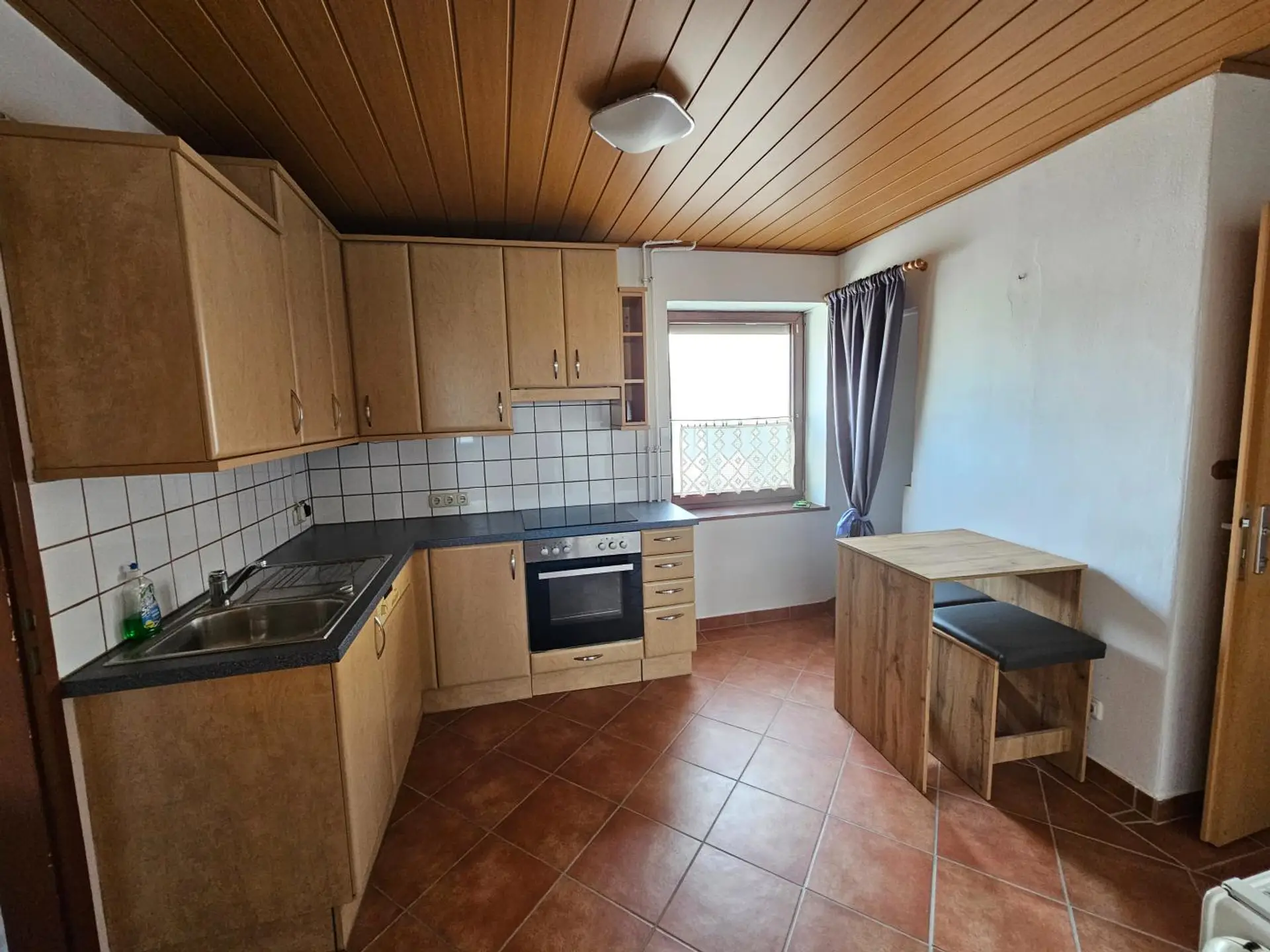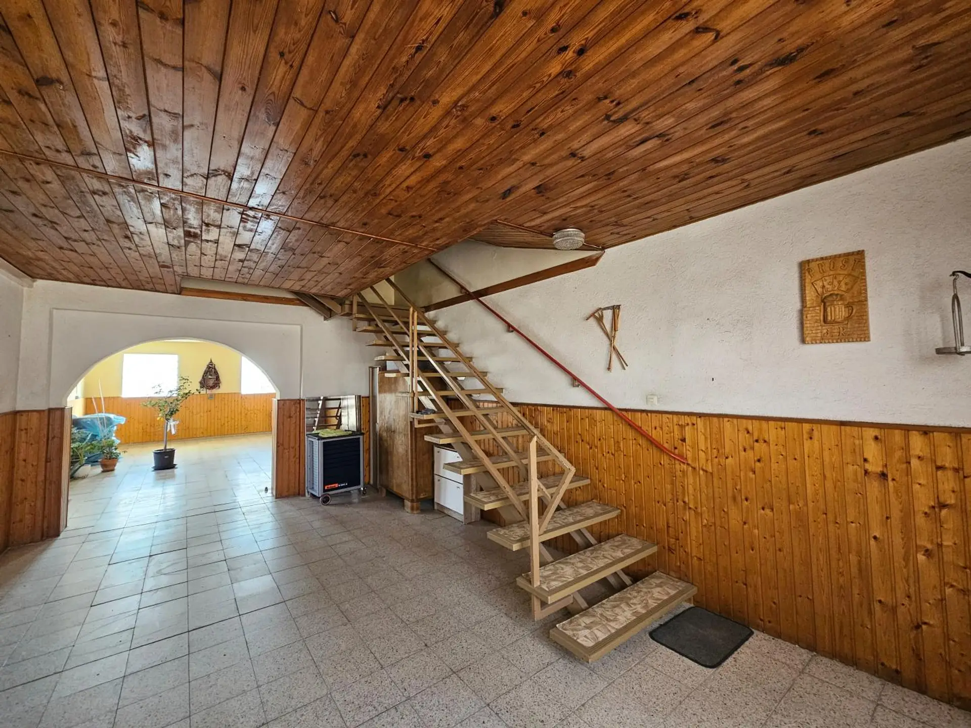 Durch die große Einfahrt kommt man über Stiegen ins Obergeschoß und linkerhand in die untere Wohnung. Sie ist voll ausgestattet mit Küche, Bad/WC mit Dusche und 2 Zimmer.