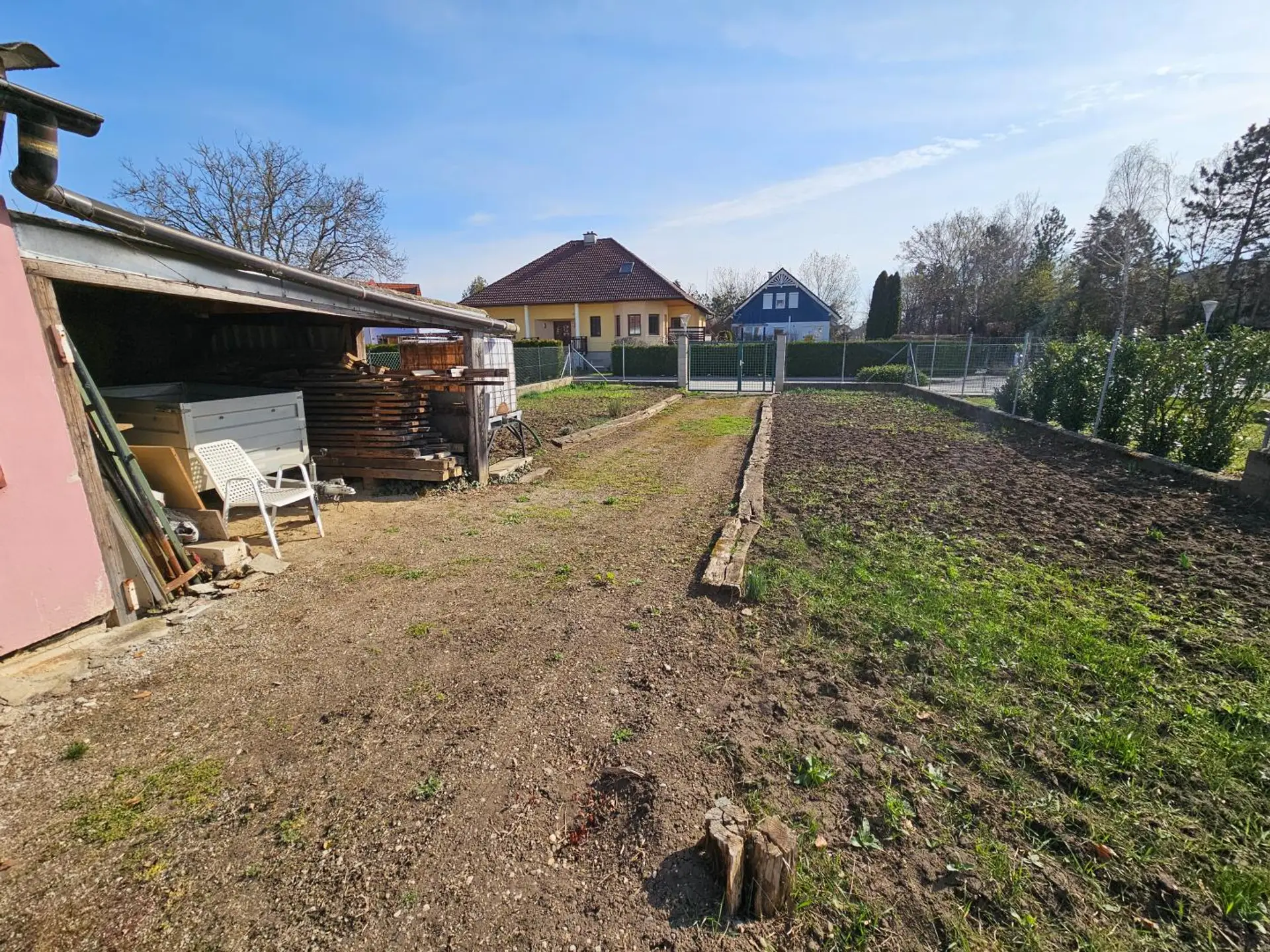 Es steht auf ca. 645 m² Eigengrund, der Grund kann auch von hinten befahren werden.