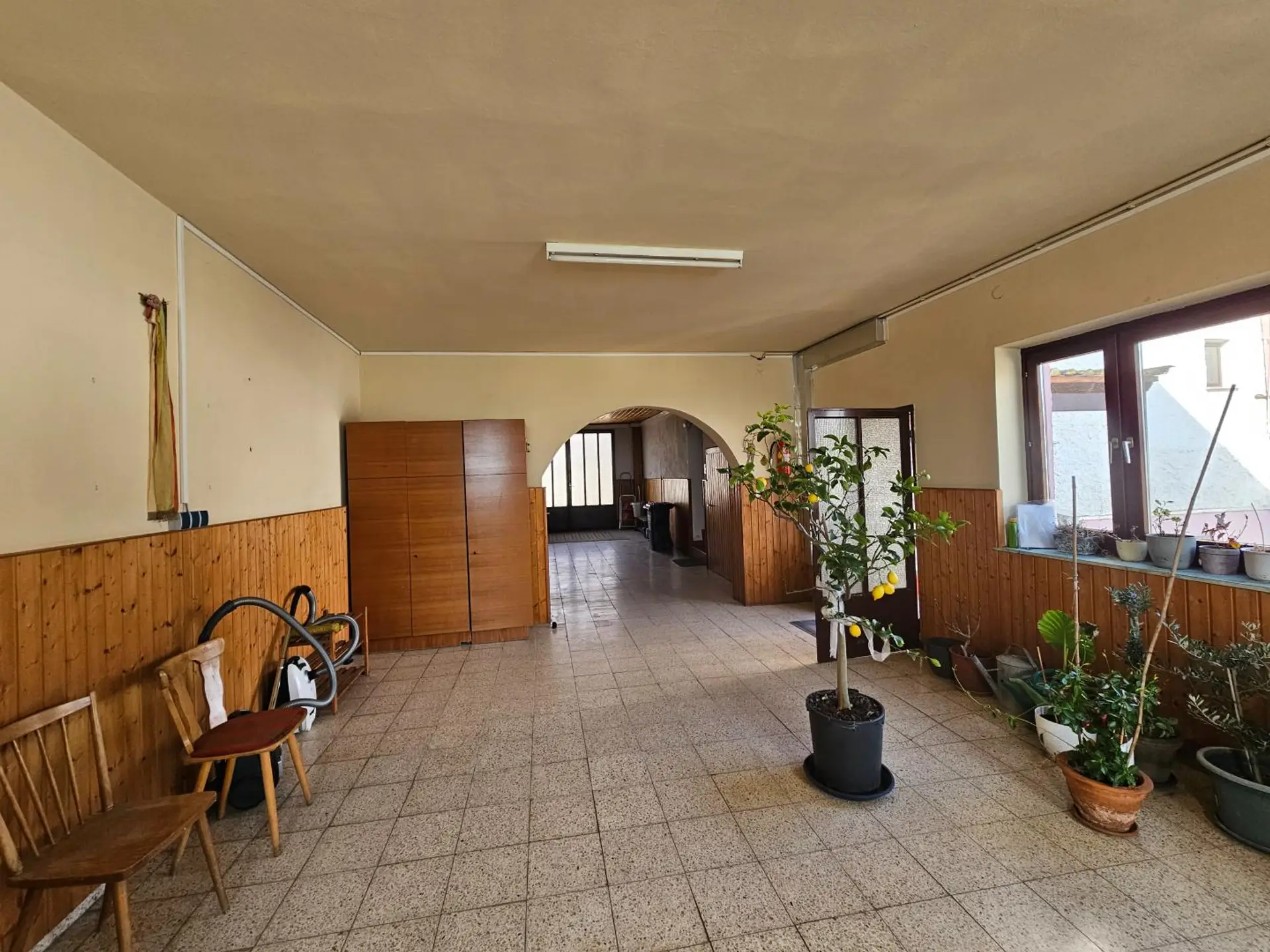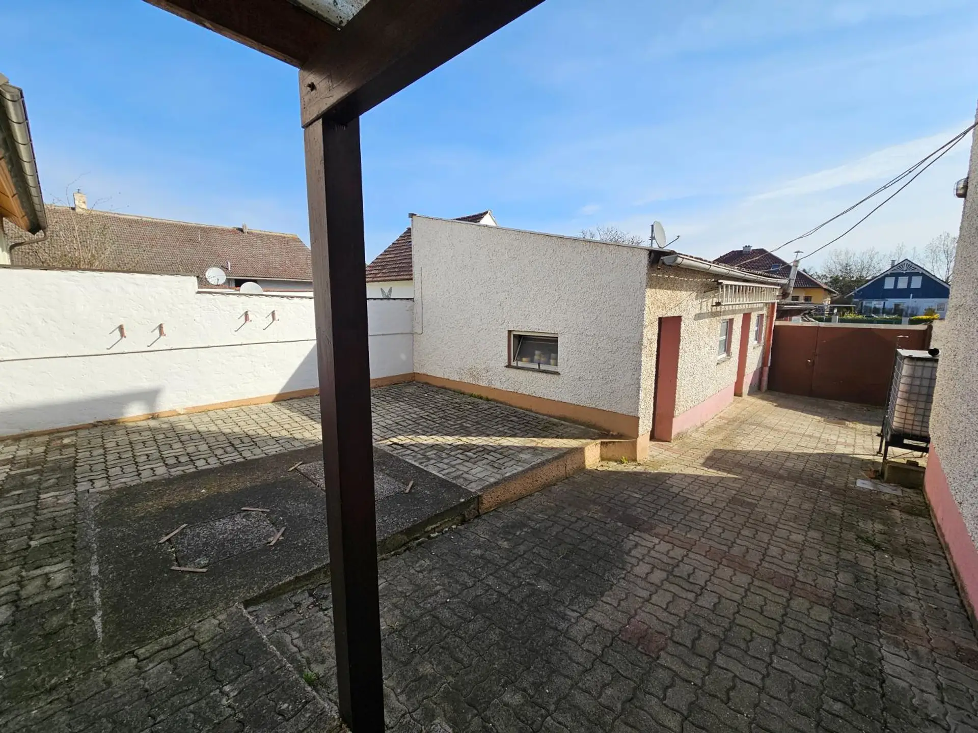 Durch die Einfahrt kommt man noch in den Hof mit Nebenräumen und in den sonnigen Garten, der noch schön angelegt werden kann.