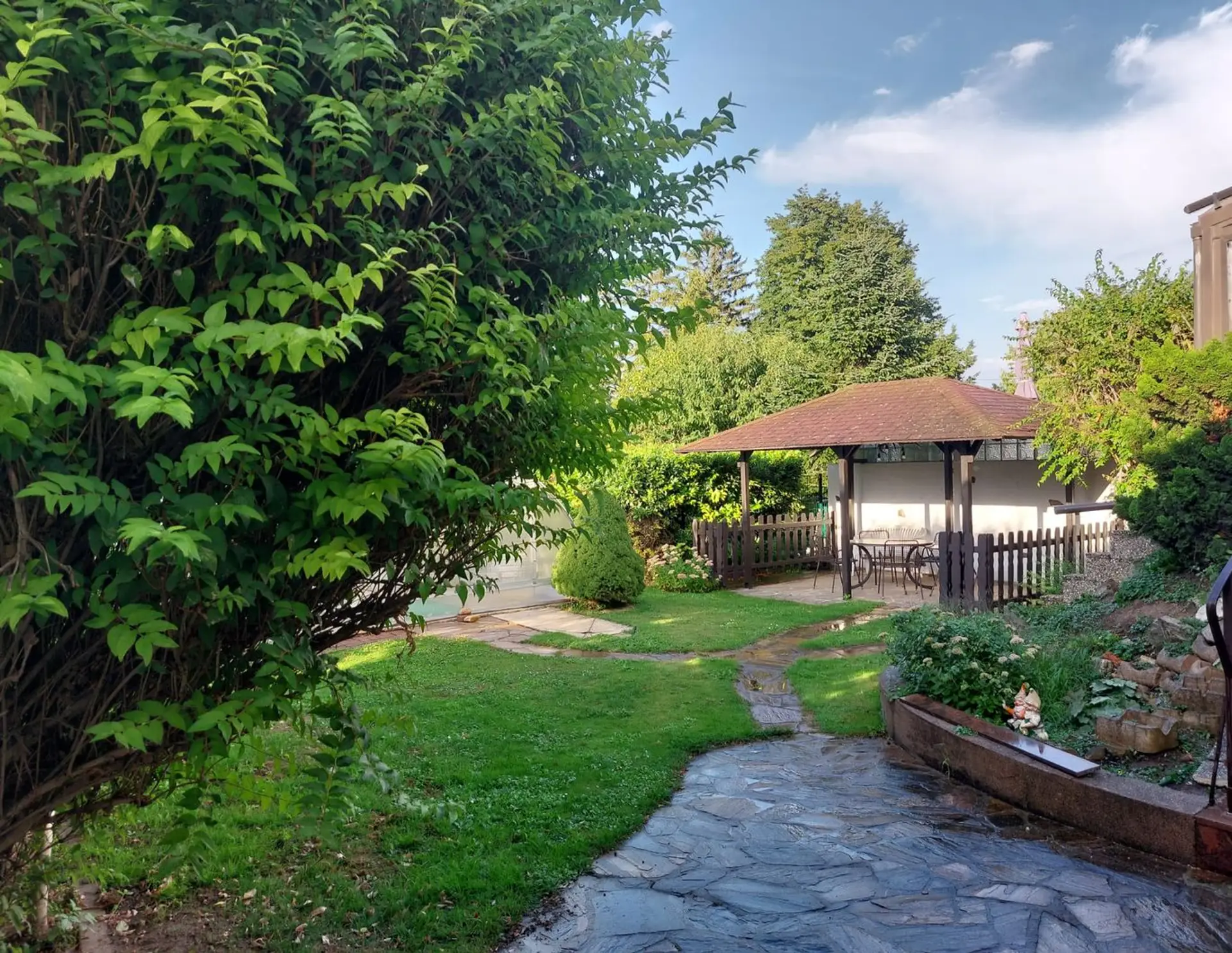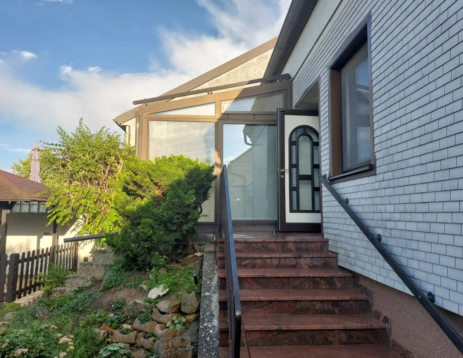Massiv gebautes Haus, Baujahr 1971, mit Garten und Pool (3,7 m x 7,2 m) mit aufschiebbarer Überdachung. Im Erdgeschoss des Hauses stehen dem zukünftigen Mieter Küche, Esszimmer, Wintergarten, Wohnzimmer mit Kachelofen,…