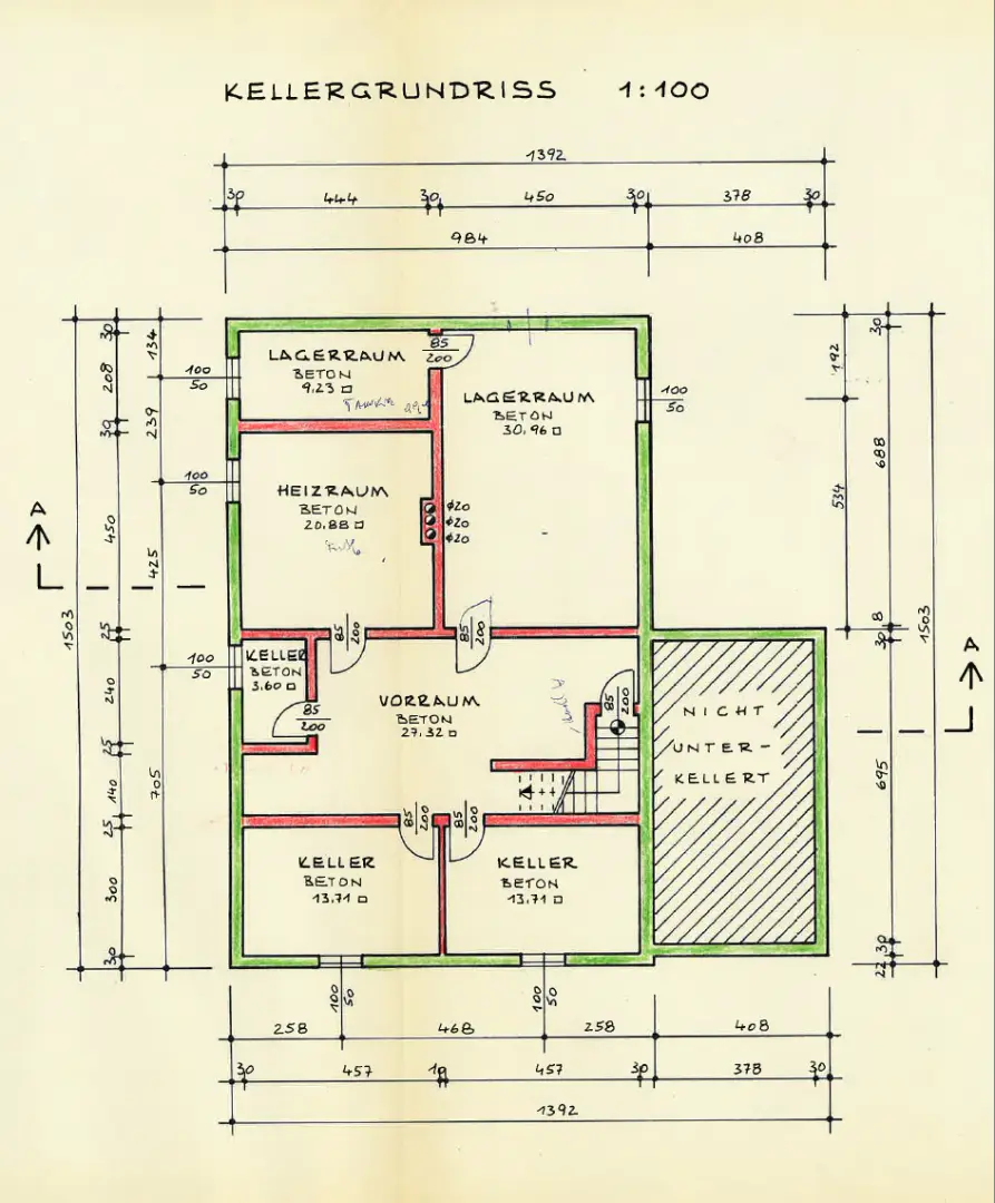 Keller (ca. 119 m² - siehe Plan bei Fotos): Im Keller findet man den Heizraum, Wirtschaftsraum und diverse Keller- und Lagerräume mit Ausgang in den Garten.