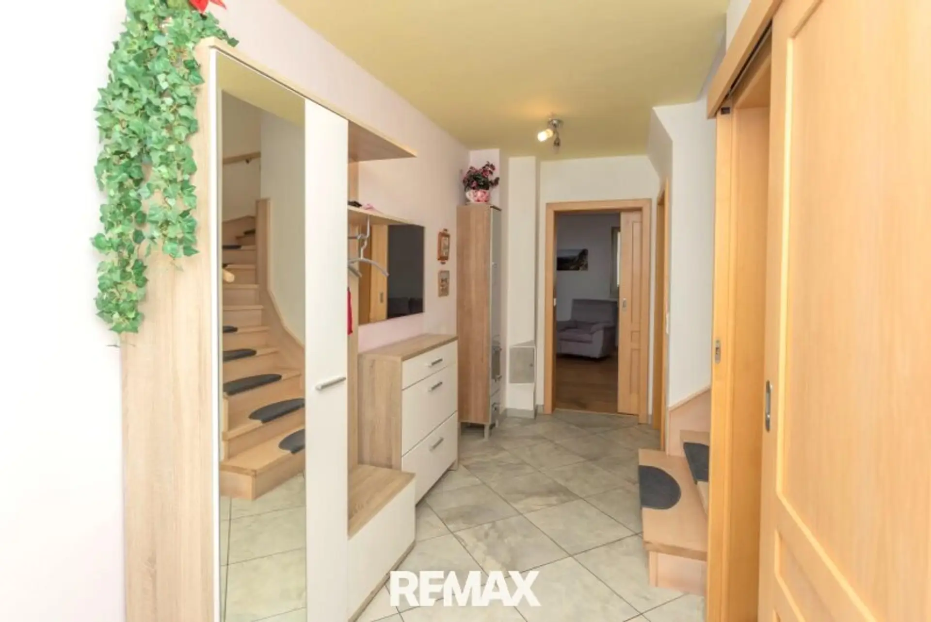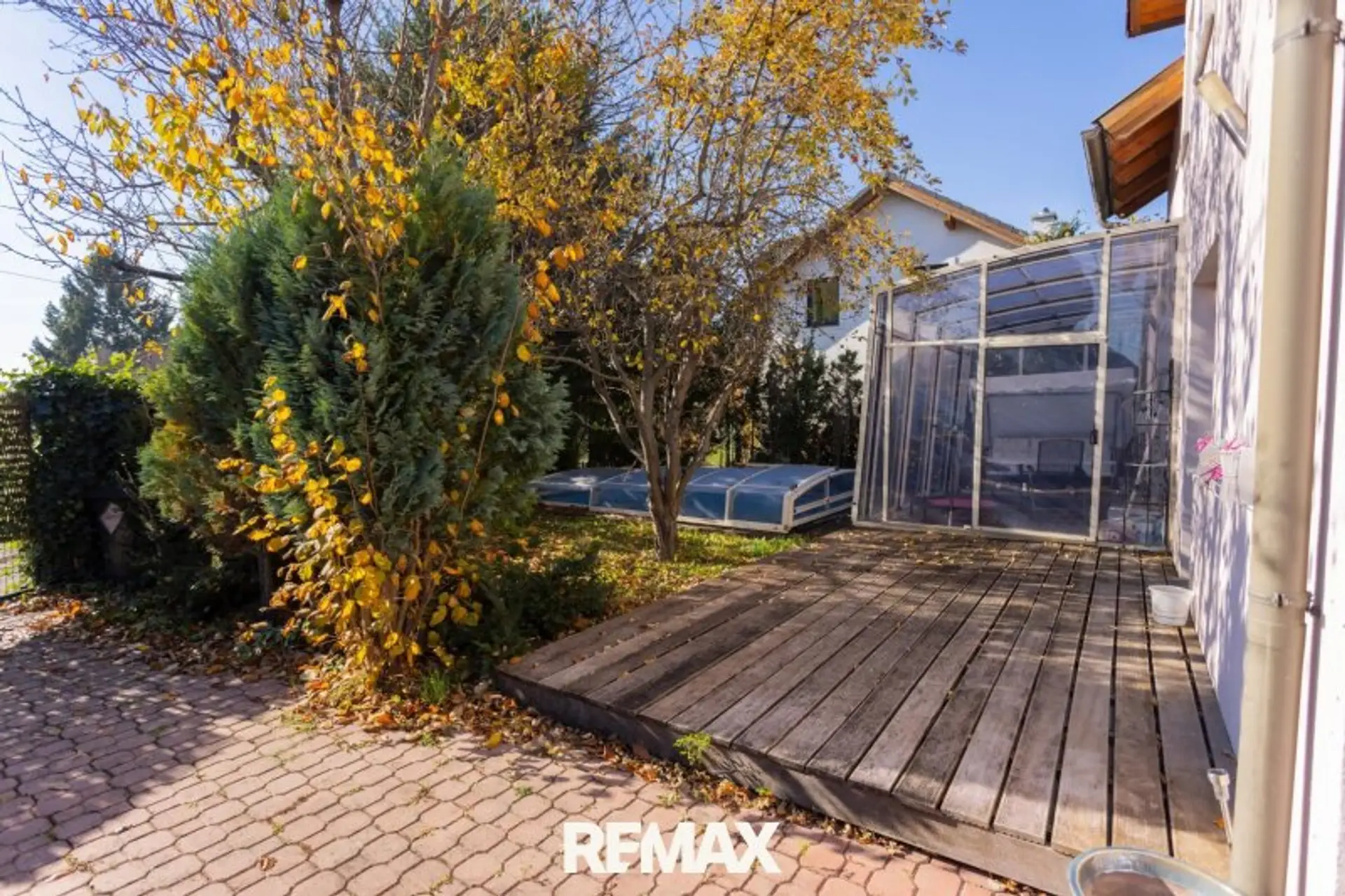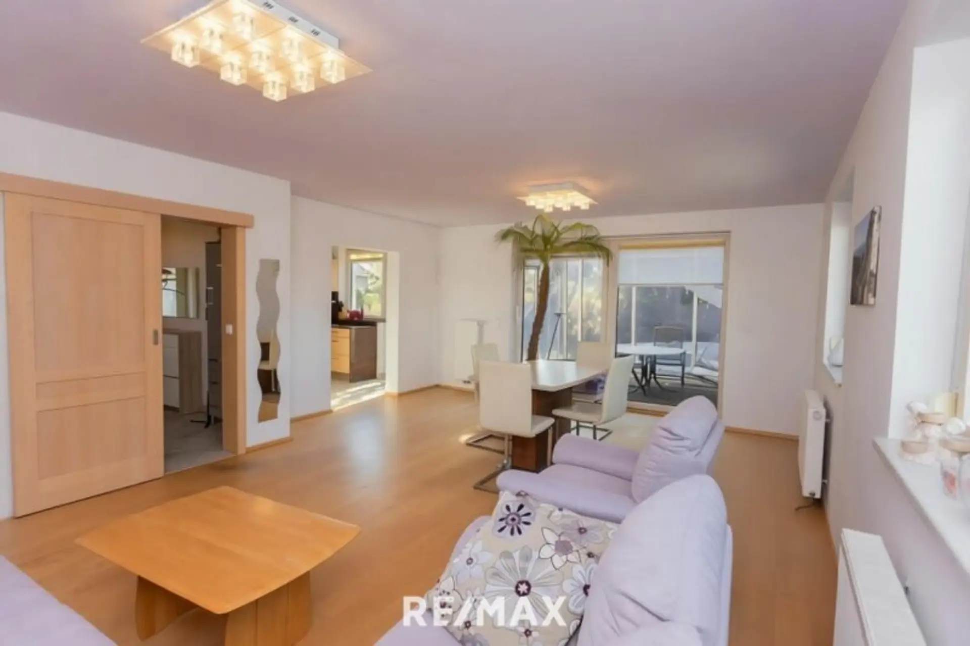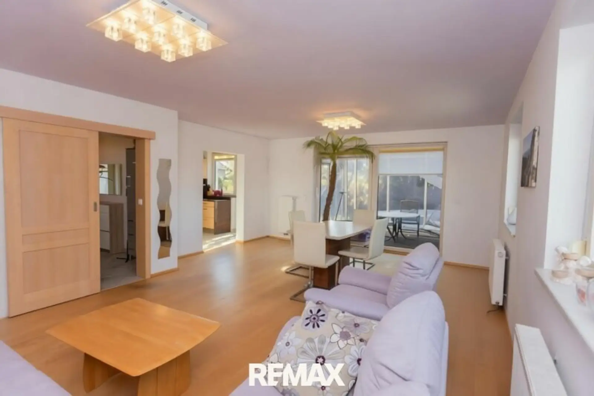 Über den zentralen Vorraum gelangen Sie in das ca. 30 m² große Wohnzimmer und die ca. 14 m² offene Küche. Der Wohnraum verfügt auch über einen Zugang zu Wintergarten, Terrasse und Garten mit Pool. Auf dieser Ebene finde Sie auch noch ein Bad mit Dusche und WC.