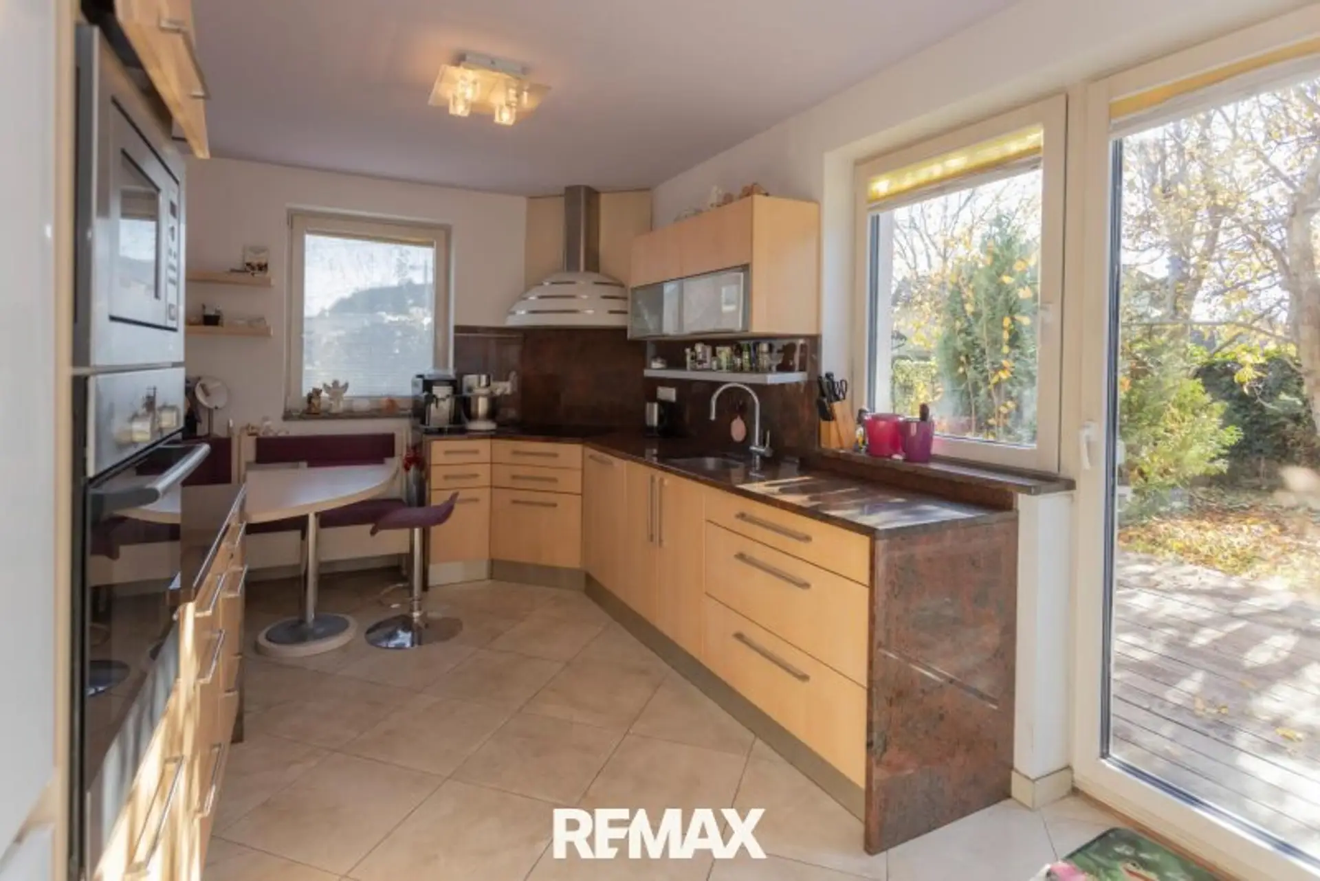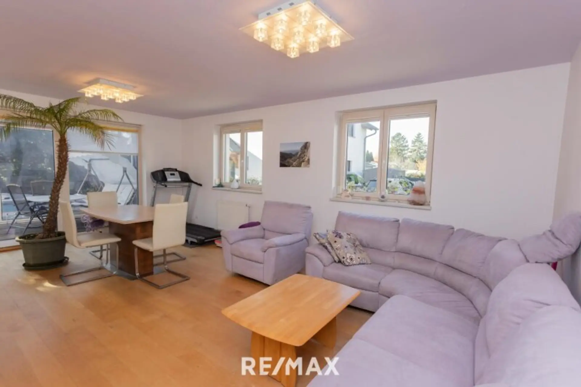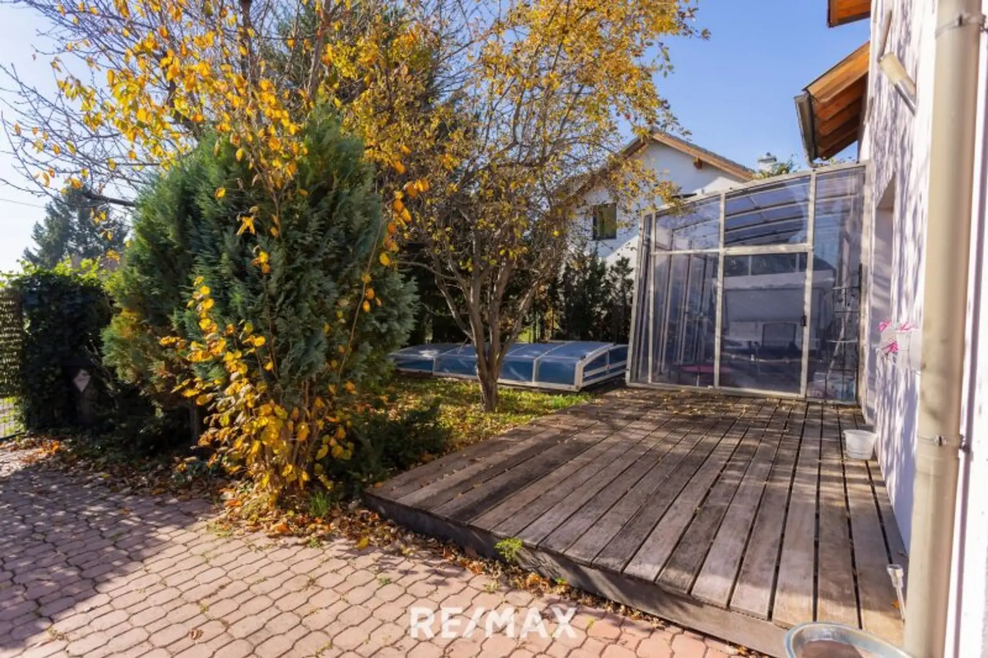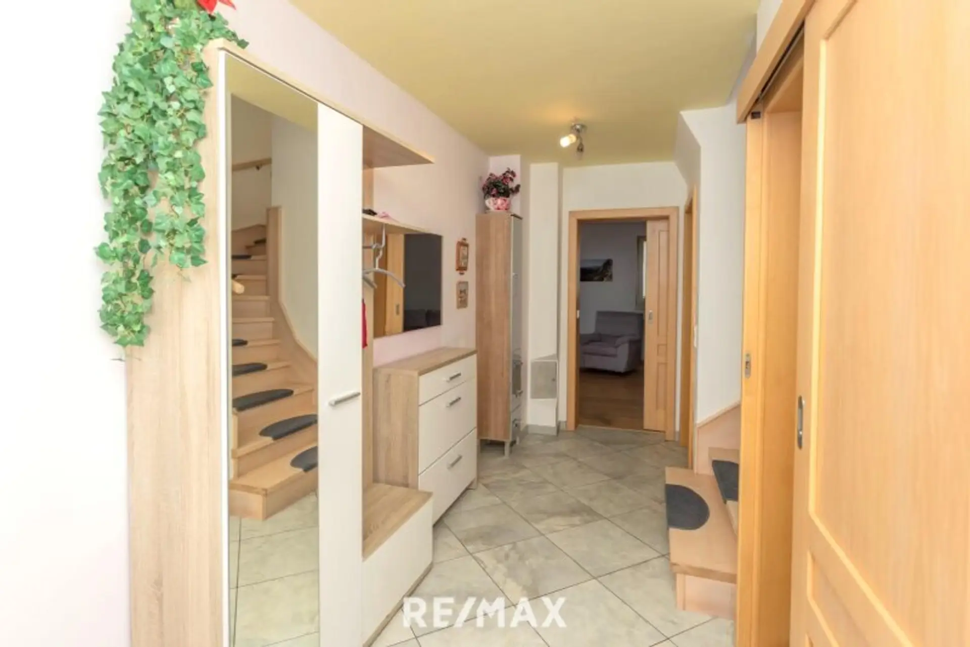 Über den zentralen Vorraum gelangen Sie in das ca. 30 m² große Wohnzimmer und die ca. 14 m² offene Küche. Der Wohnraum verfügt auch über einen Zugang zu Wintergarten, Terrasse und Garten mit Pool. Auf dieser Ebene finde Sie auch noch ein Bad mit Dusche und WC.