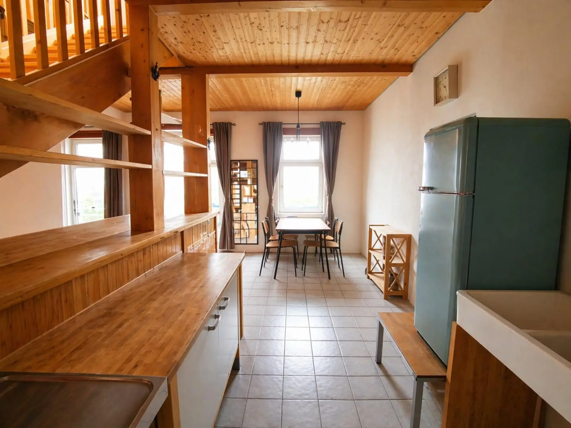Erdgeschoss: Vorzimmer, Badezimmer mit Wanne und WC, offene Küche, loftartiger Wohnbereich mit Holztreppe zum Dachboden
