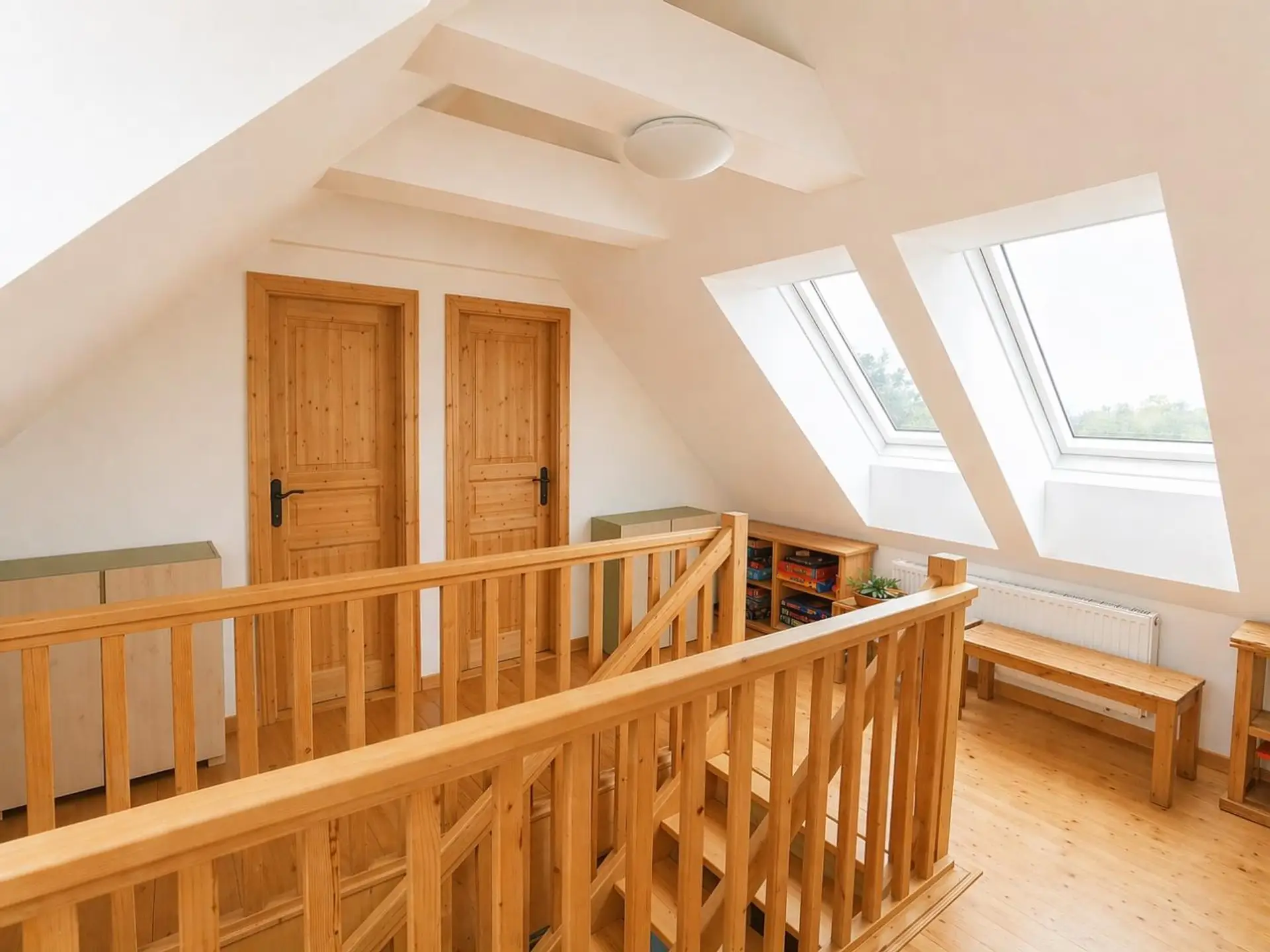 Dachboden: Vorraum, kleines Schlafzimmer mit Zugang zum Balkon, zwei sehr kompakte, flexibel nutzbare Schlafkojen (Hinweis: Dachgeschossausbau nicht baubewilligt, starke Dachschrägen prägen den Raumcharakter)
