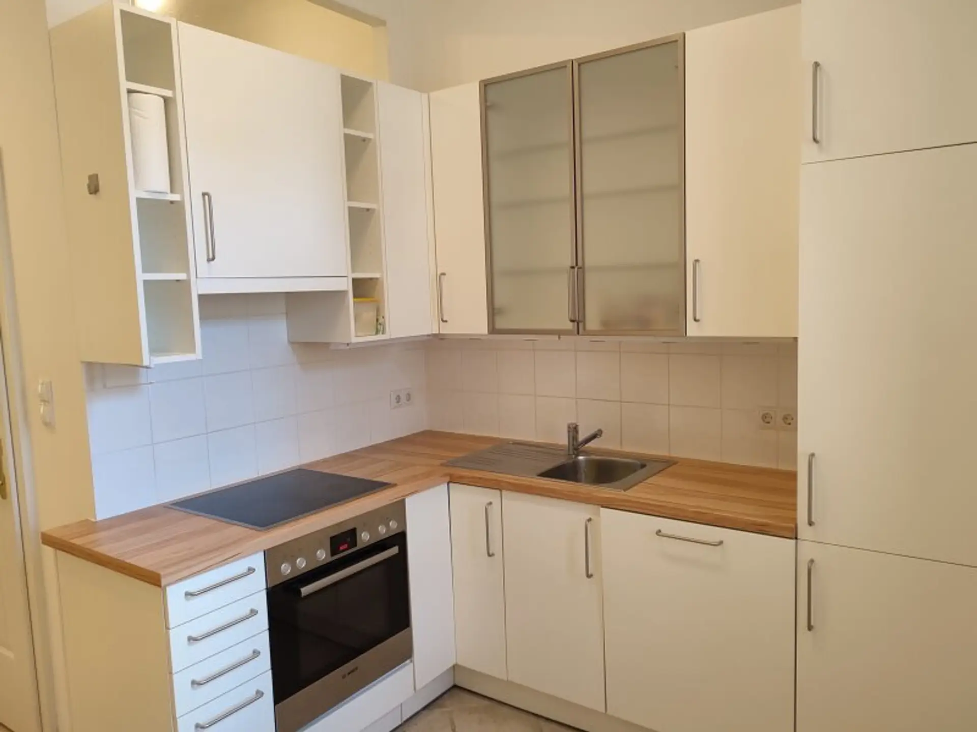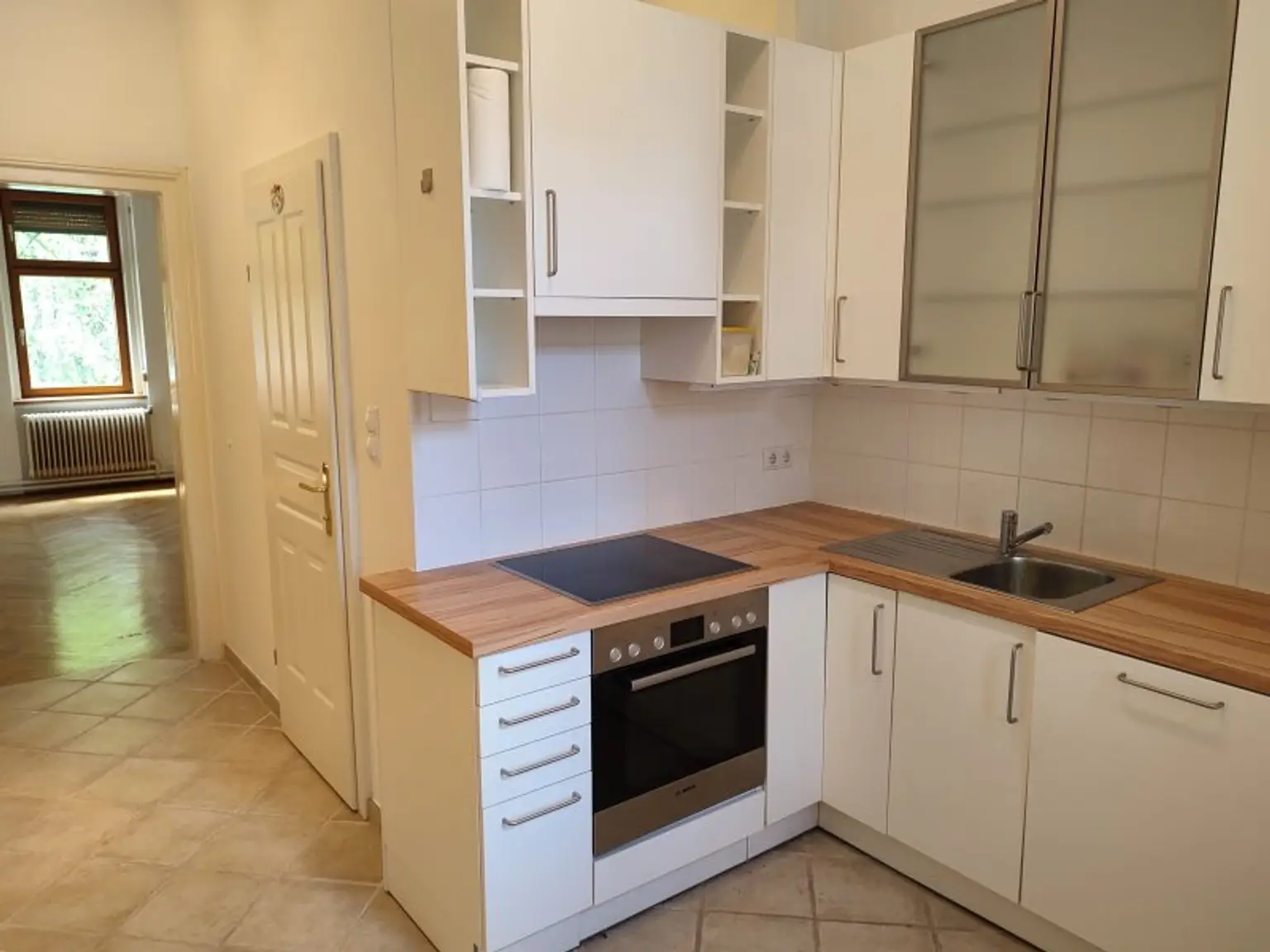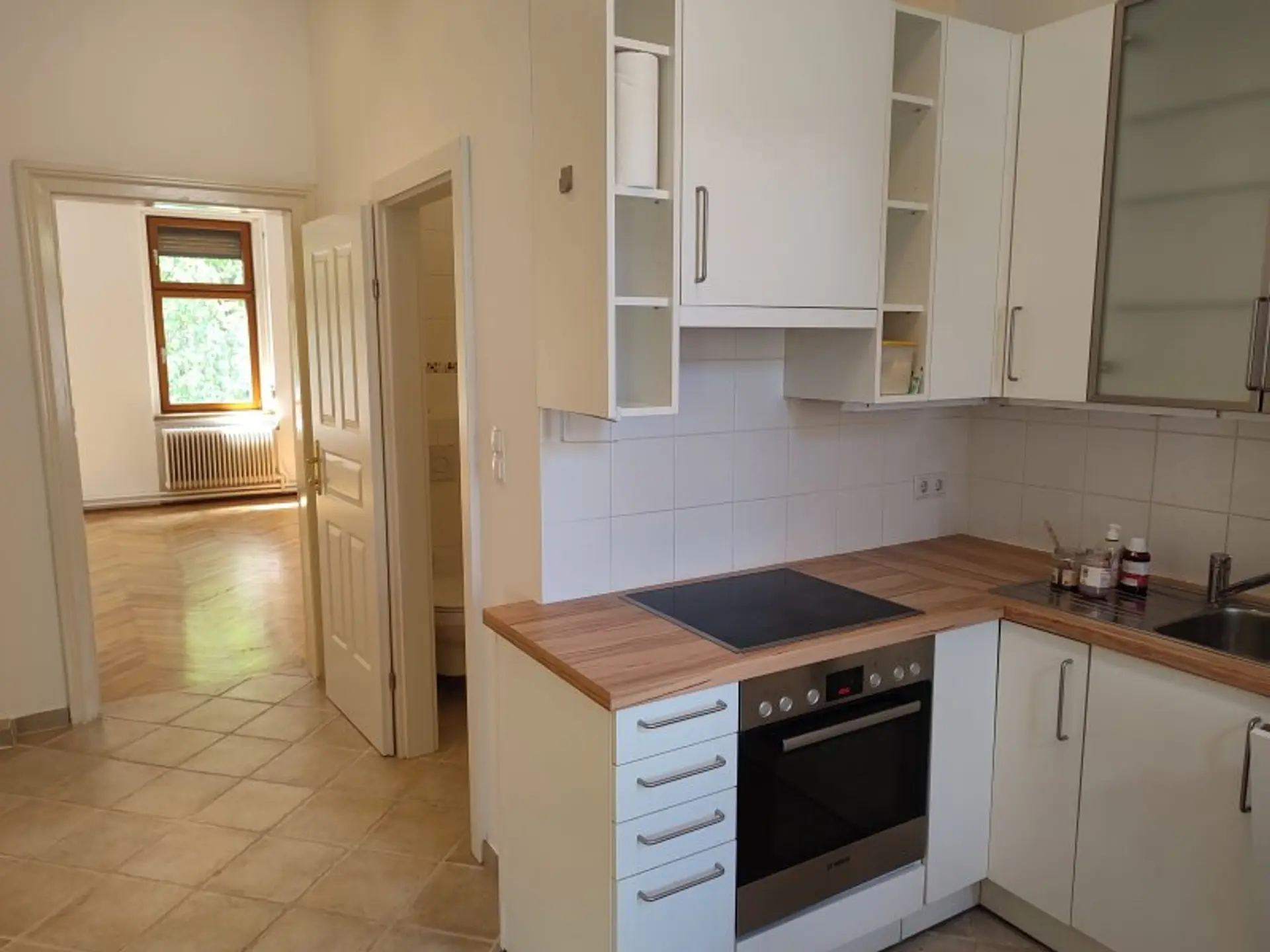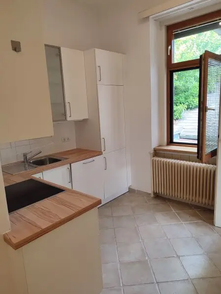 Schöne Ausstattung mit kompletter DAN-Einbauküche. Fischgrätparkettböden, neuwertig verfliestem Sanitärbereich.