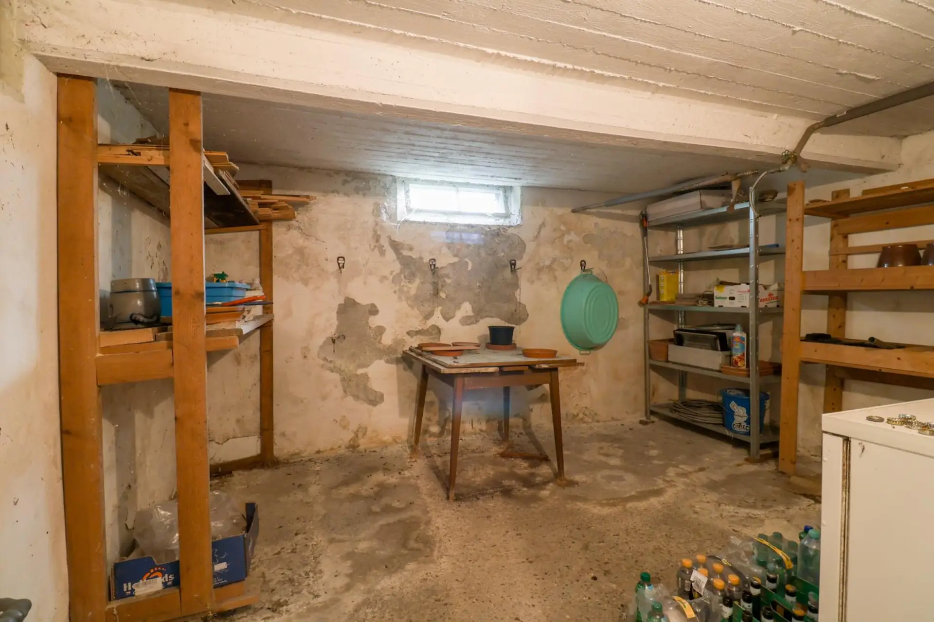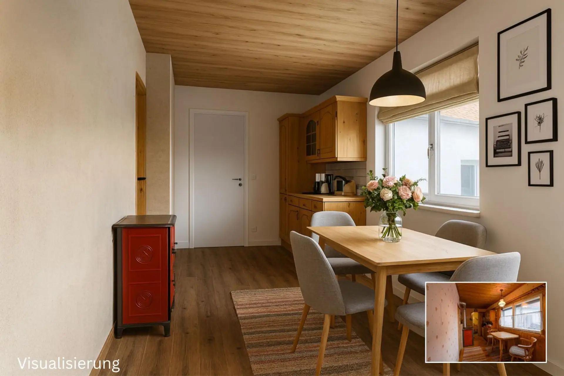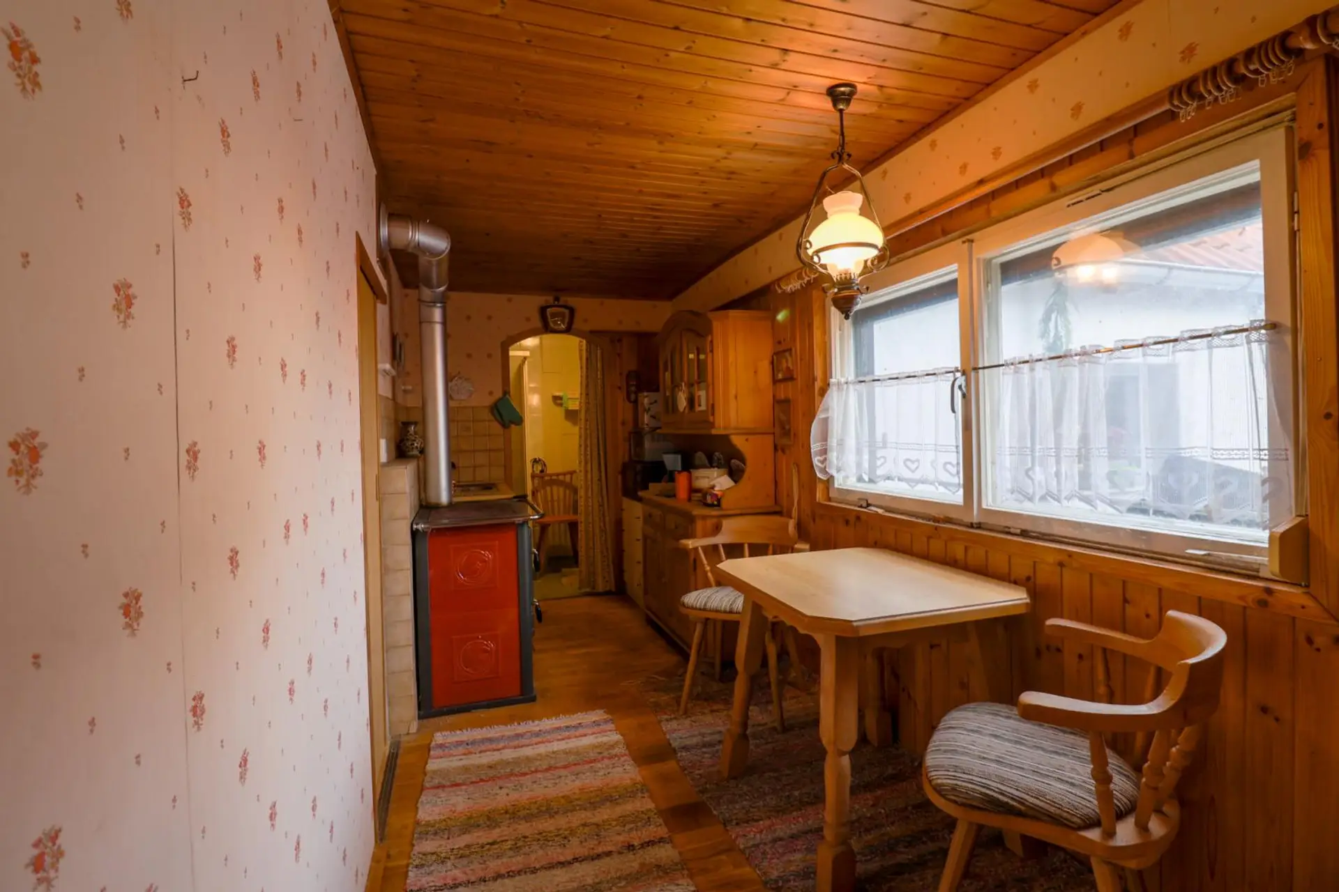 Im Erdgeschoss betritt man das Haus über einen kleinen Windfang, von dem aus man in den Vorraum gelangt. Von hier aus öffnen sich die Küche, das Wohnzimmer sowie der Zugang ins Dachgeschoss. Die Küche besticht durch ihren Tischherd, während im Wohnzimmer ein Kaminofen steht, der allerdings nicht mehr funktionstüchtig ist. Die Räume wirken vertraut und bodenständig, sind aber deutlich renovierungsbedürftig. Das Dachgeschoss bietet mit einem Schlafzimmer von etwa 16 m² und einem kleineren Kabinett zusätzlichen Platz für ein kompaktes, gut strukturiertes Wohnkonzept. Auch der Keller bietet praktische Nutzfläche, wie man sie von Häusern dieser Zeit kennt.