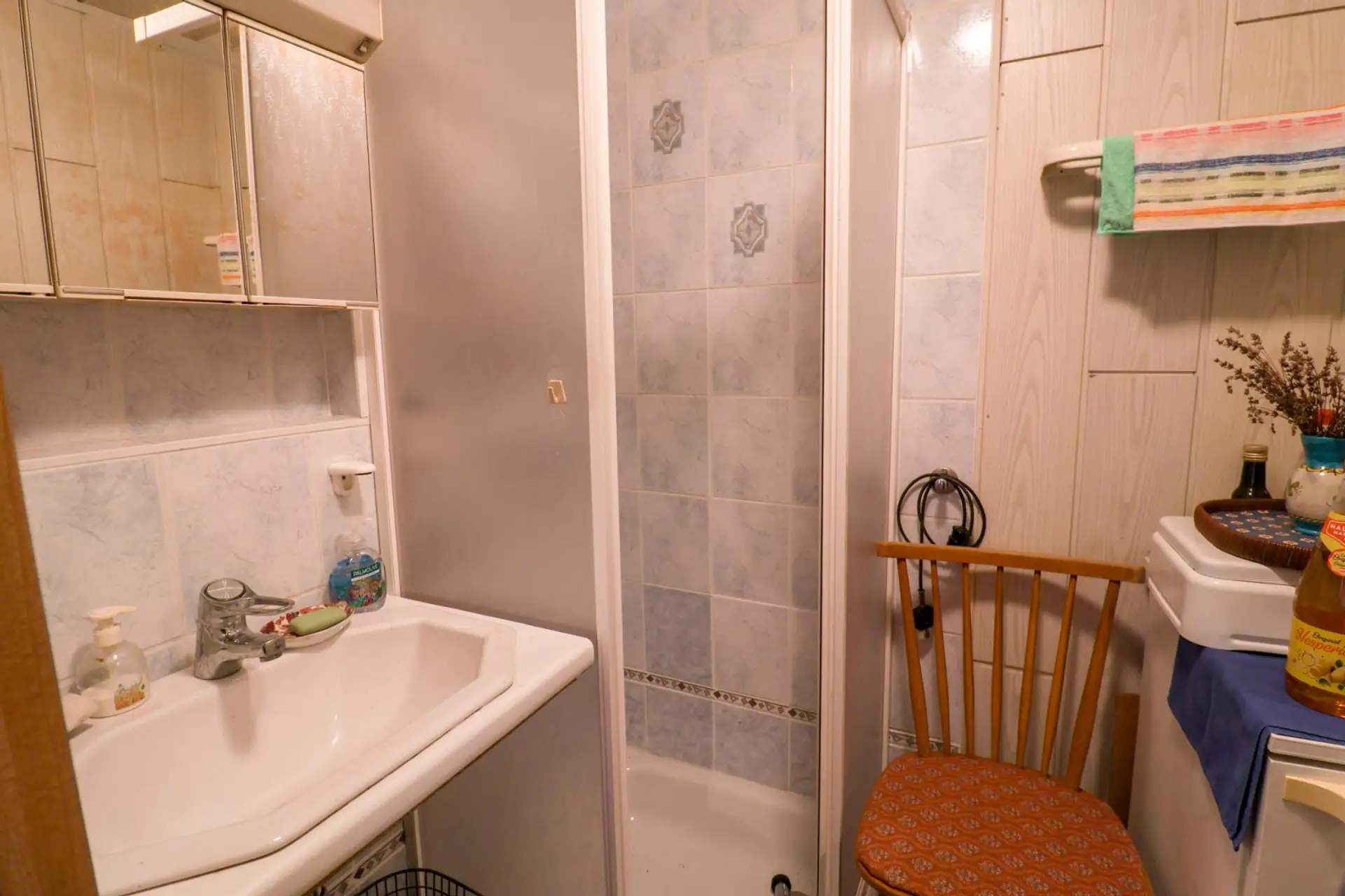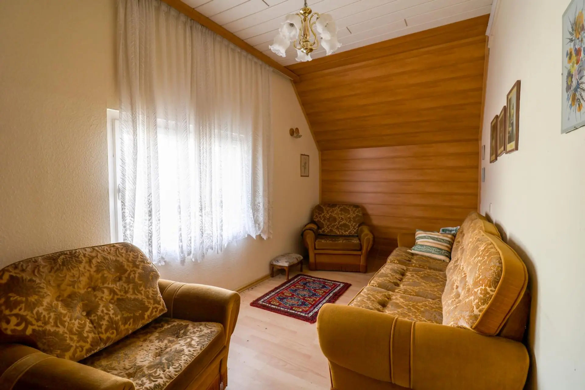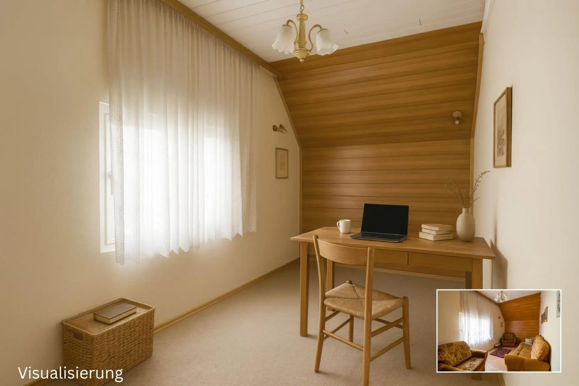 Im Erdgeschoss betritt man das Haus über einen kleinen Windfang, von dem aus man in den Vorraum gelangt. Von hier aus öffnen sich die Küche, das Wohnzimmer sowie der Zugang ins Dachgeschoss. Die Küche besticht durch ihren Tischherd, während im Wohnzimmer ein Kaminofen steht, der allerdings nicht mehr funktionstüchtig ist. Die Räume wirken vertraut und bodenständig, sind aber deutlich renovierungsbedürftig. Das Dachgeschoss bietet mit einem Schlafzimmer von etwa 16 m² und einem kleineren Kabinett zusätzlichen Platz für ein kompaktes, gut strukturiertes Wohnkonzept. Auch der Keller bietet praktische Nutzfläche, wie man sie von Häusern dieser Zeit kennt.