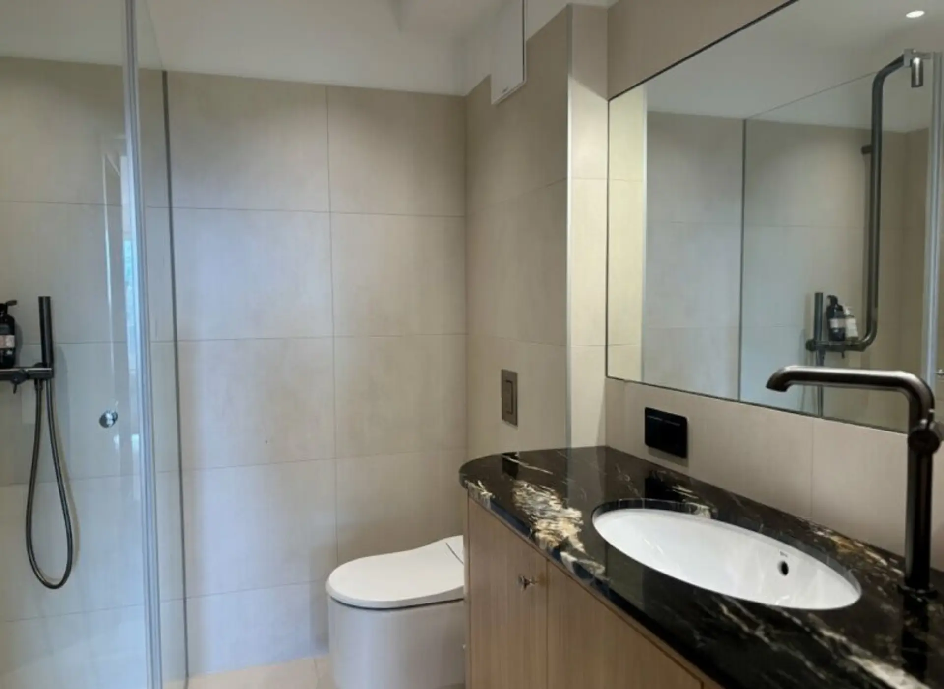 From here, you can access the adjoining bathroom with a shower, sink, and shower toilet.