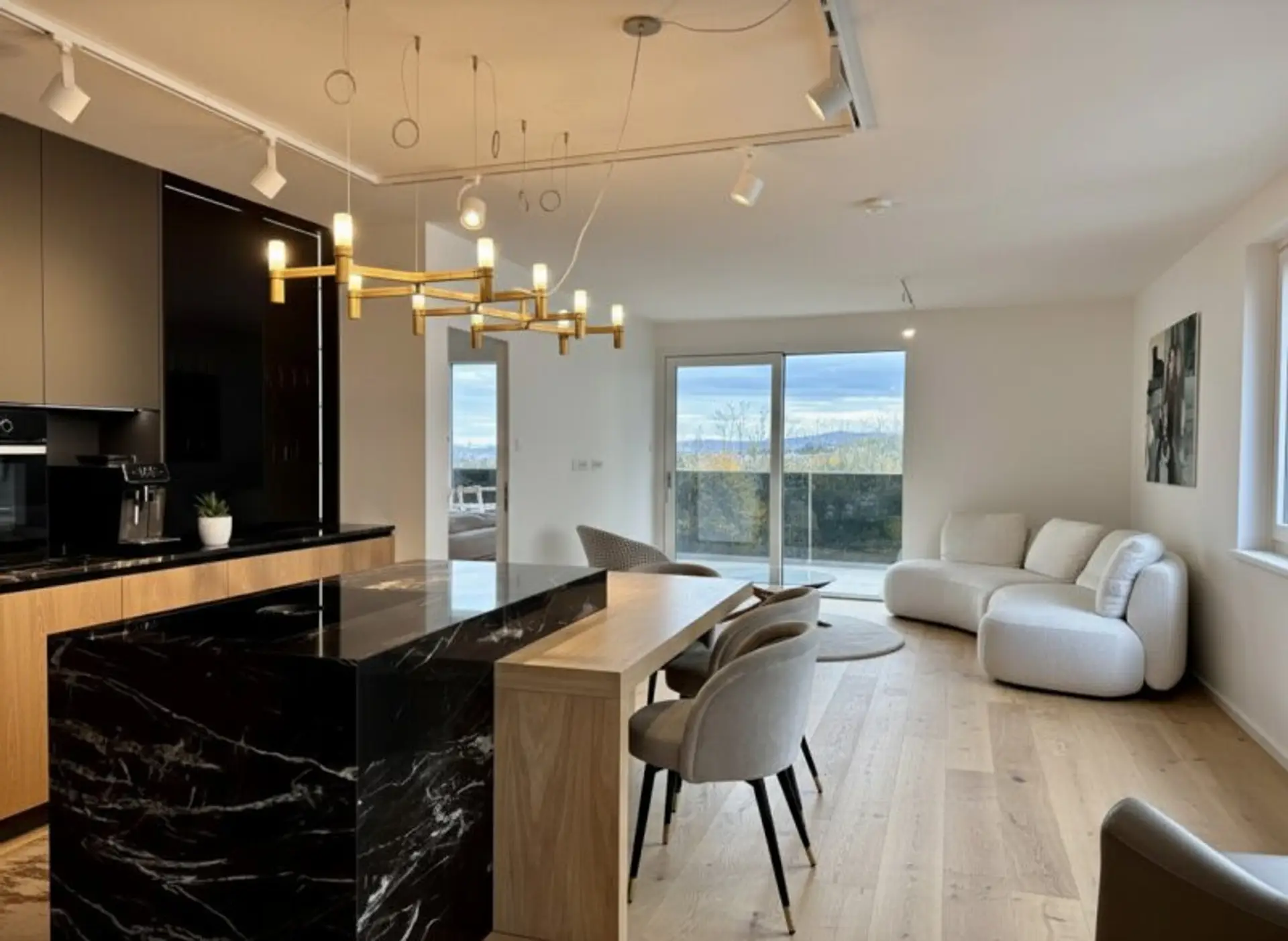 Die hochwertige Küche ist mit modernen Markengeräten ausgestattet und lässt das Herz eines jeden Hobbykochs höher schlagen. Der Wohnraum ist mit eleganten Möbeln ausgestattet und vermittelt sofort ein Gefühl von Zuhause.