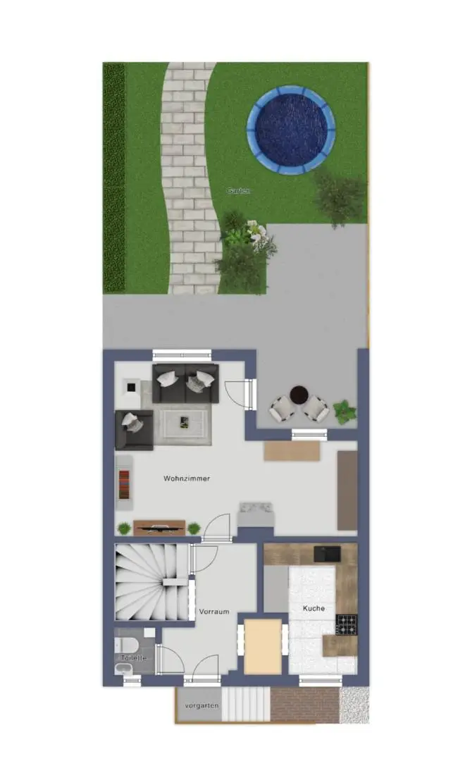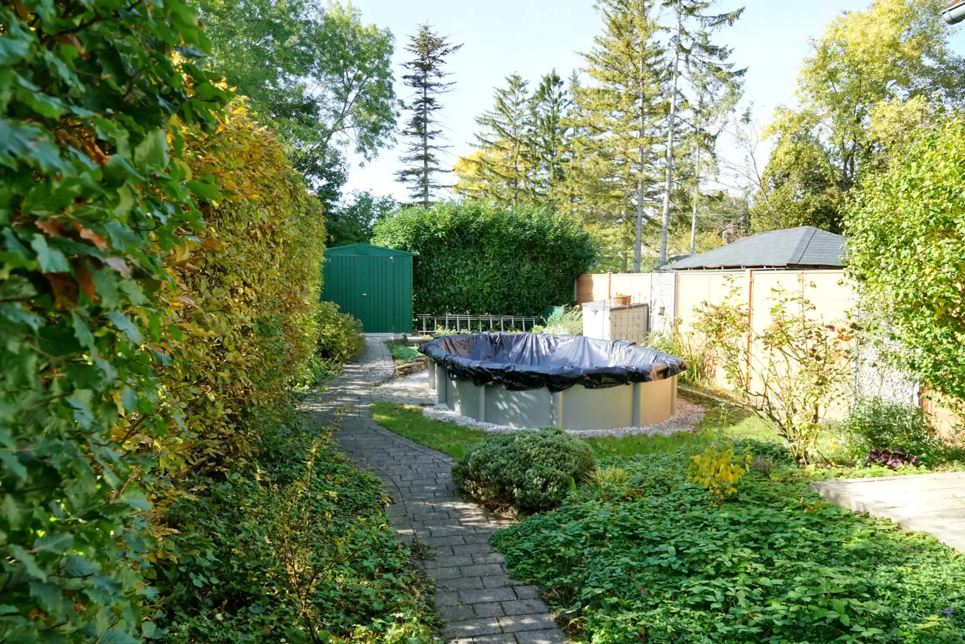 Der südwestseitig ausgerichtete Garten ist eine kleine Wohlfühloase – mit einem gepflegten Grünbereich, einem erfrischenden Pool und einer teilüberdachten Terrasse mit Markise, die zum Entspannen und Verweilen einlädt.