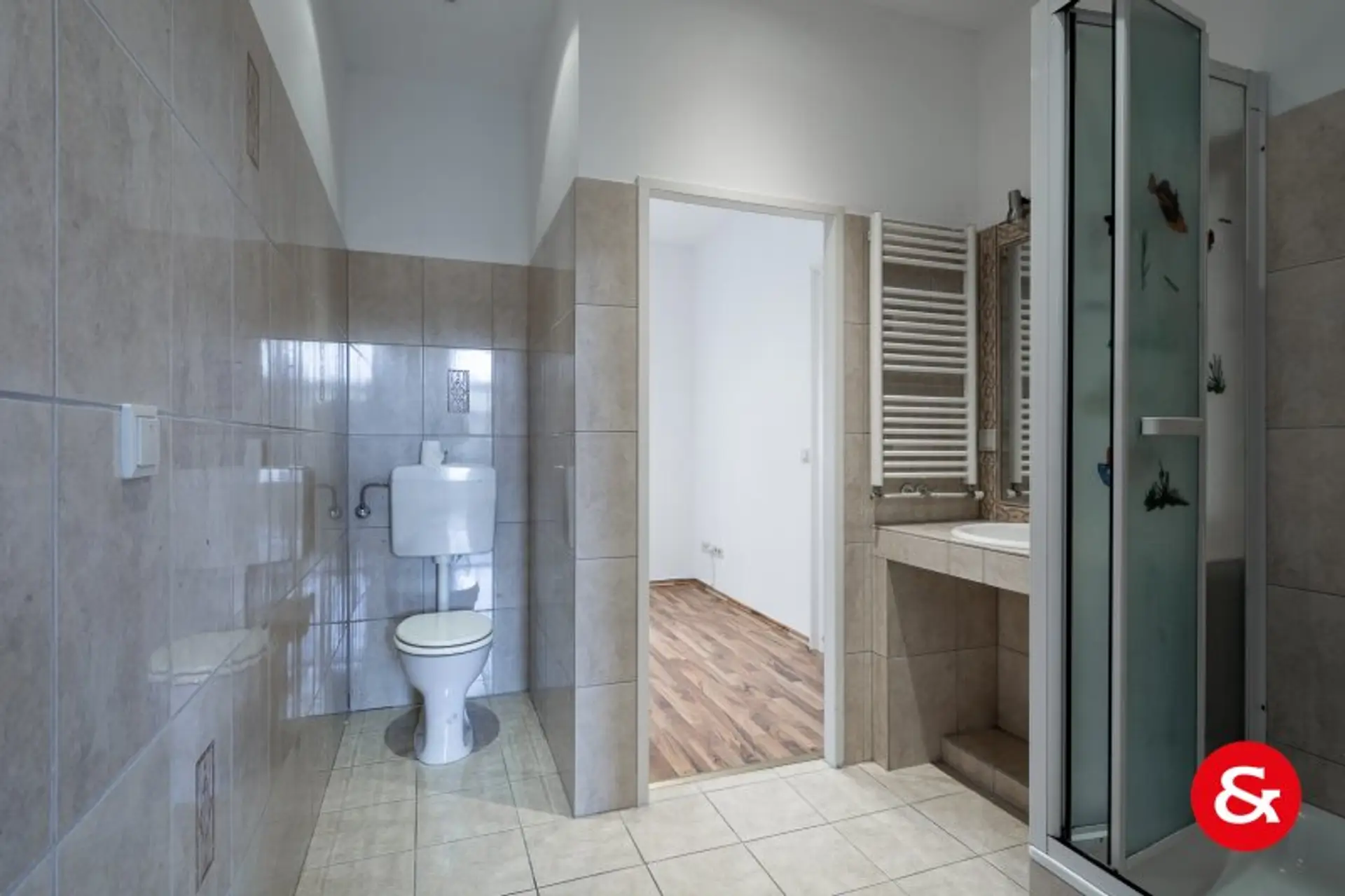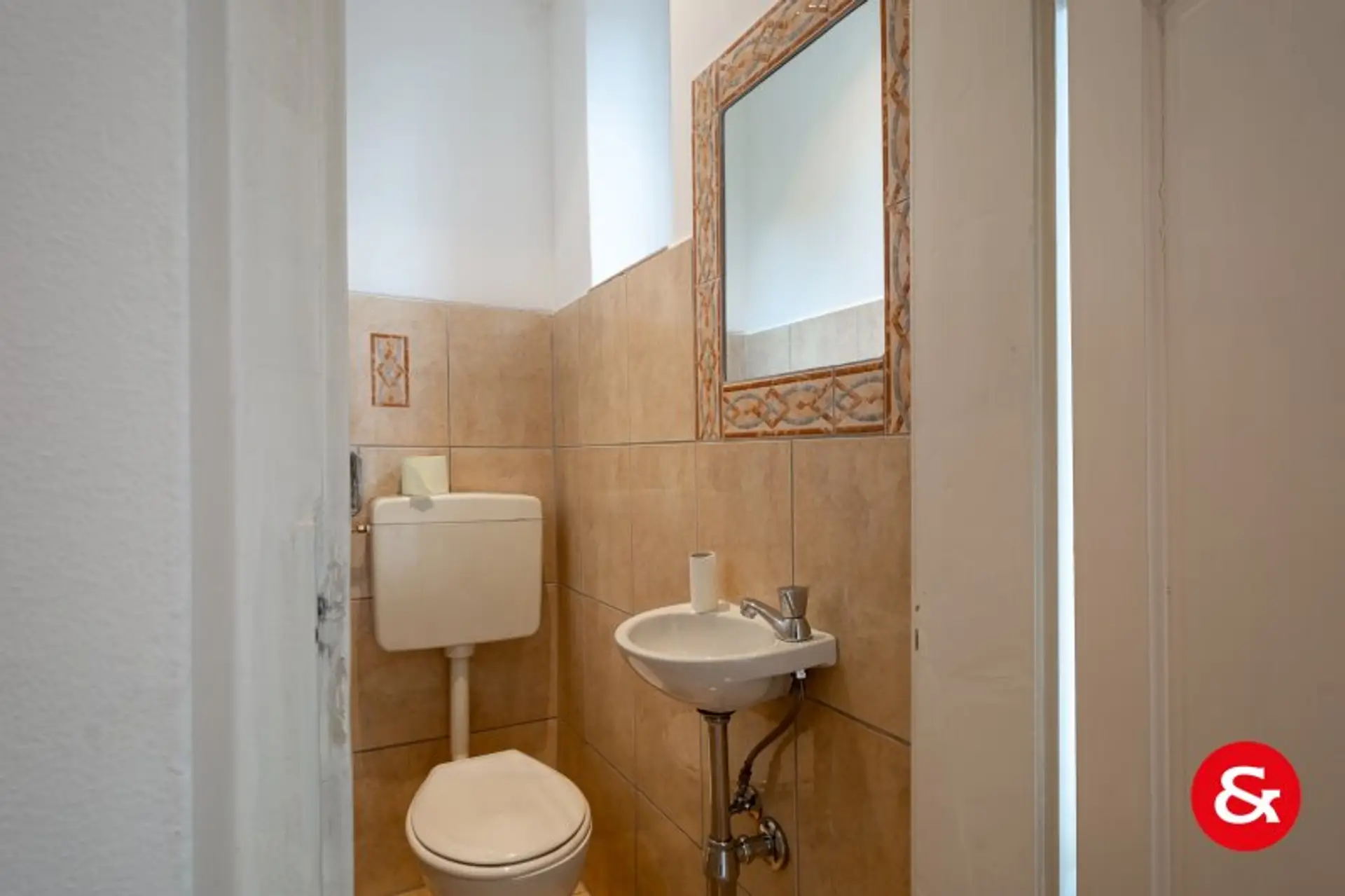 Das von zwei Seiten begehbare Bad mit Dusche und WC teilt die 3 Zimmer-Altbauwohnung in zwei Teile.