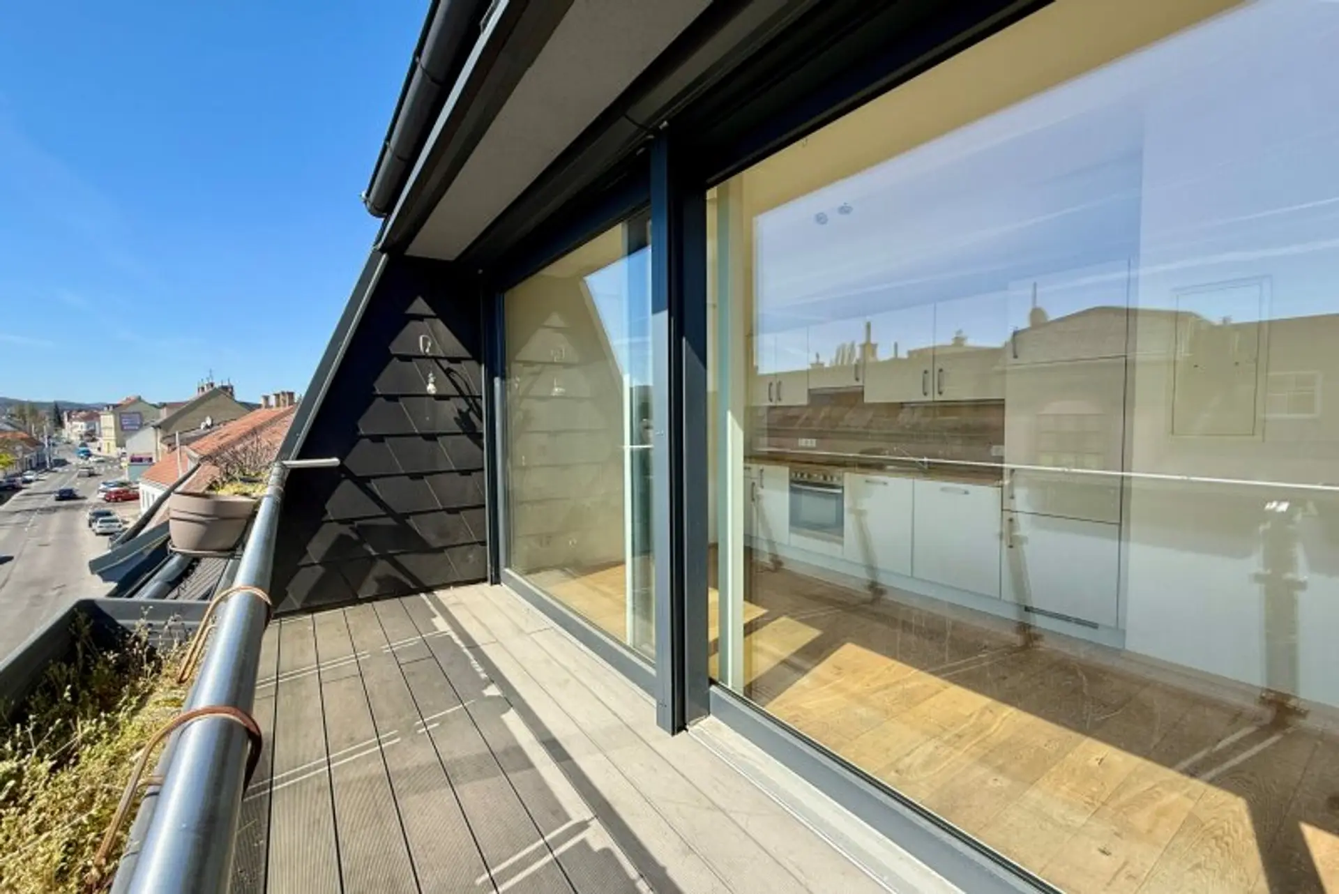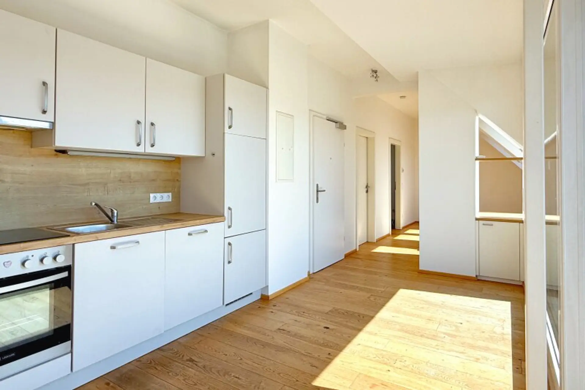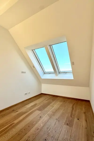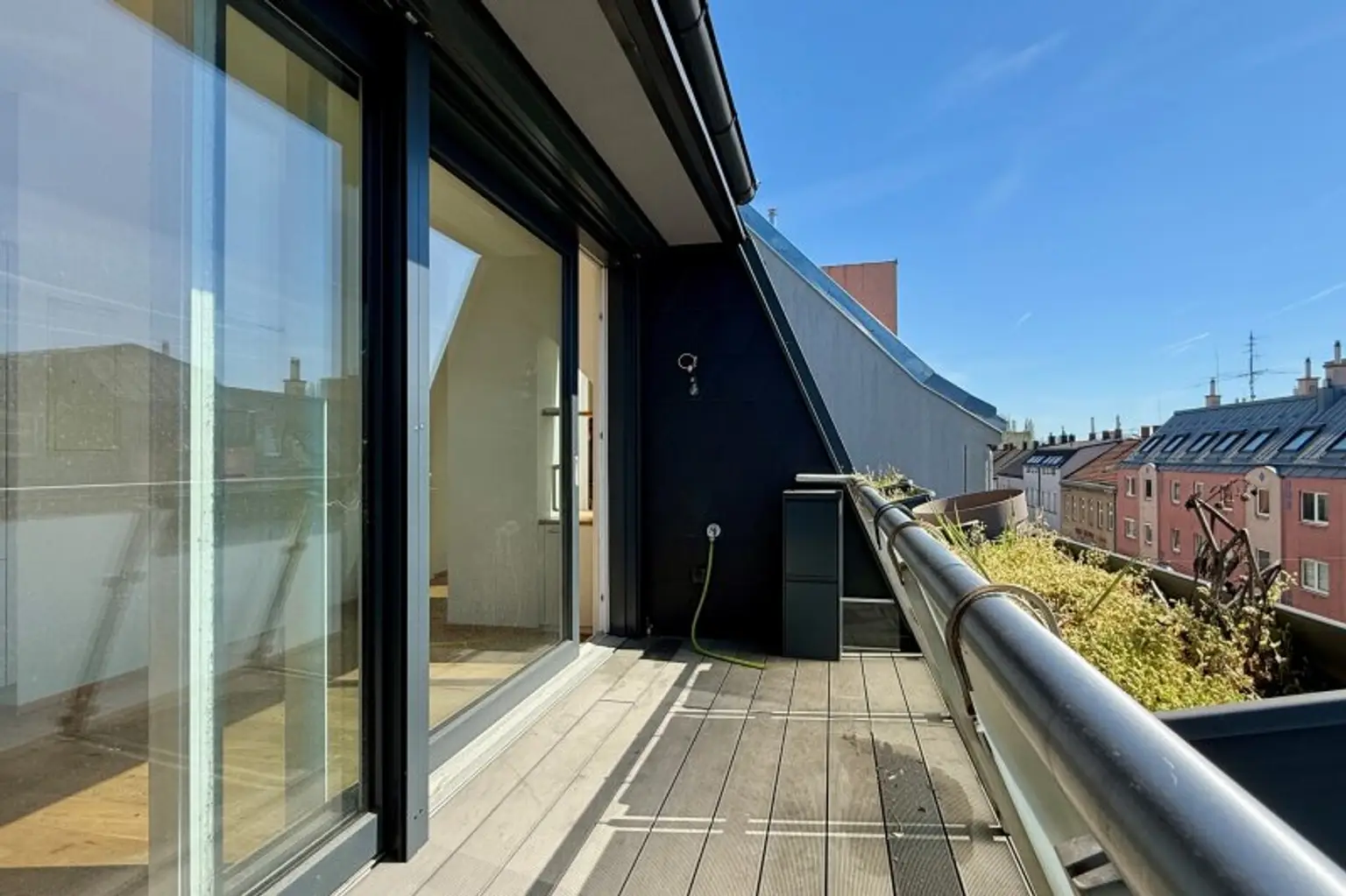Die Wohnung befindet sich im Dachgeschoß (4. Liftstock) und ist Straßenseitig (Wohnzimmer/Terrasse) und Hofseitig (Badezimmer und Schlafzimmer) ausgerichtet. Über den Eingangsbereich gelangt man direkt in die große Wohnküche, welche optisch in einen Wohnbereich und Küchenbereich mit Platz für den Esstisch, unterteilt ist. Die teilweise überdachte Terrasse (Loggia) erschließt sich über eine große Fensterfläche mit Schiebetür. Das Schlafzimmer und das Badezimmer (mit Dusche und WC) sind separat begehbar. Die Wohnung verfügt über eine elektrisch und einzeln steuerbare Außenbeschattung. Die Böden sind als Parkettböden im Wohnbereich und Fliesen im Nassbereich ausgeführt. Die Wohnung wird unmöbliert, aber mit voll ausgestatteter Küche übergeben.