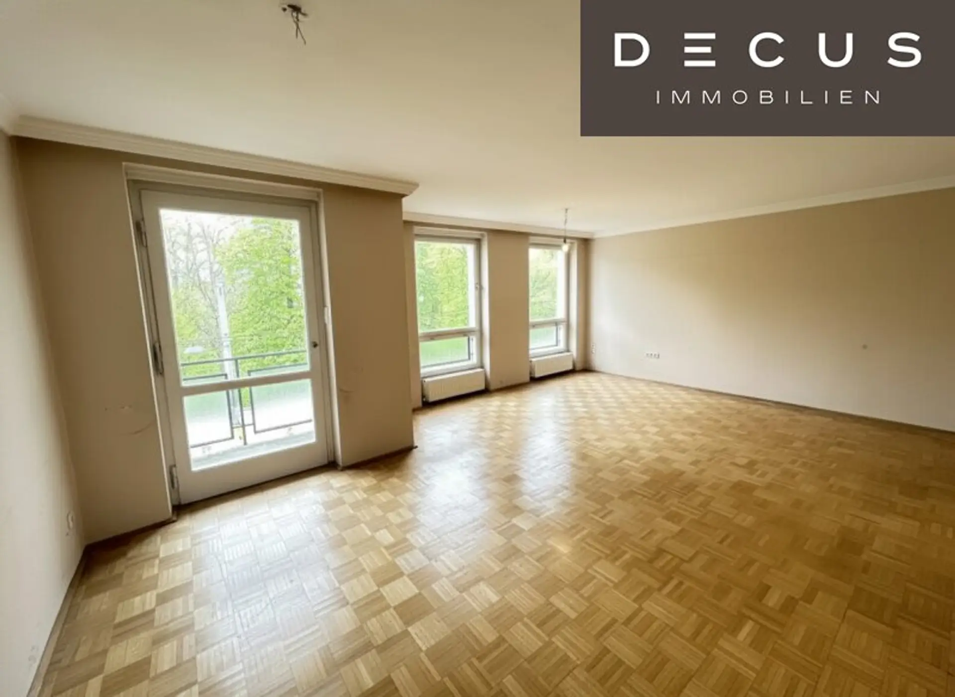 Das großzügige Wohnzimmer mit rund 35 m² ist straßenseitig sowie nordöstlich ausgerichtet und bietet einen schönen Blick in den Garten des Palais Schwarzenberg, was der Wohnung einen besonderen, repräsentativen Charakter verleiht.