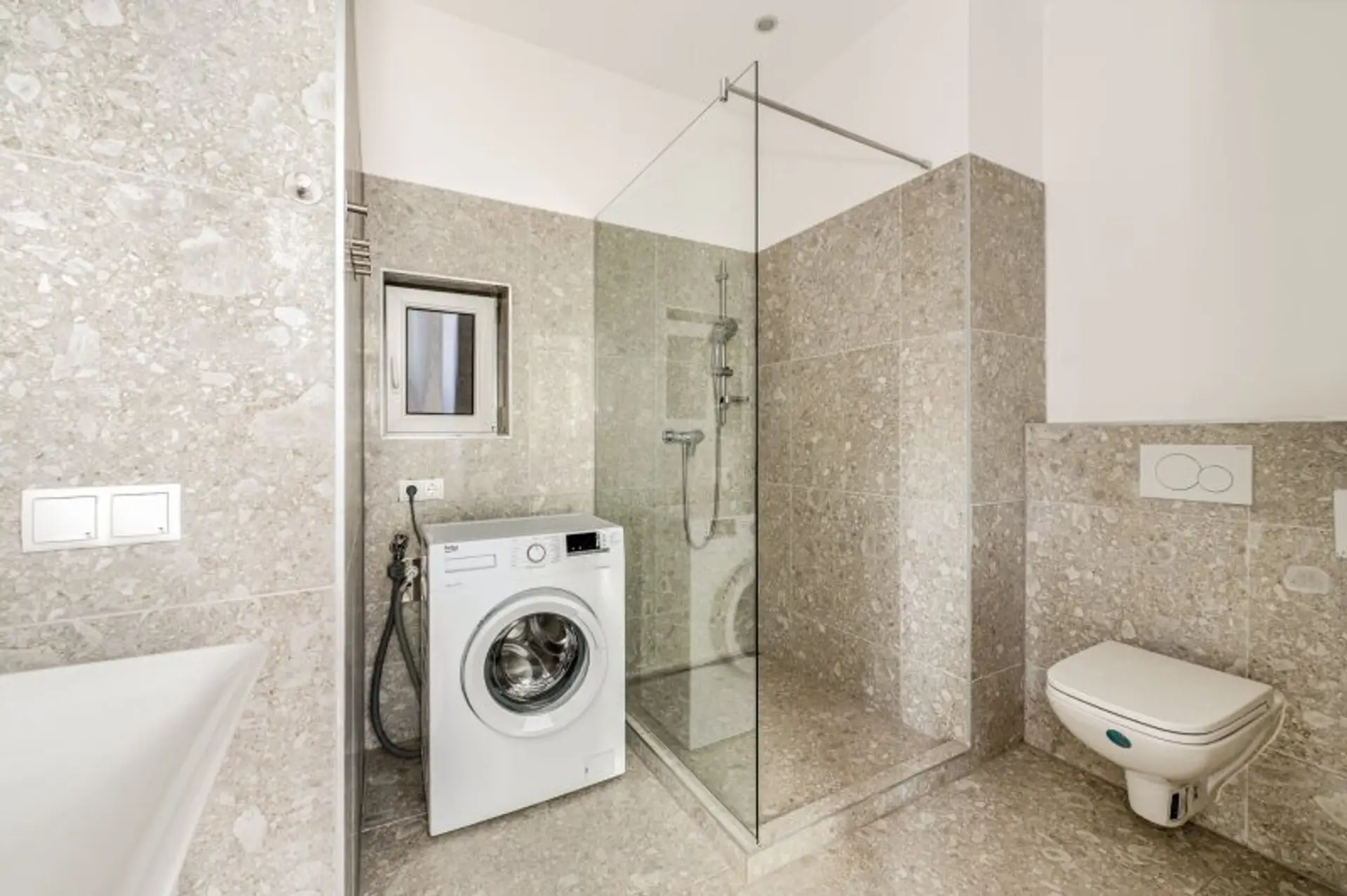 Das Badezimmer ist modern gestaltet und mit stilvollen Sanitäreinrichtungen ausgestattet - eine komfortable Dusche und ein WC fügen sich dabei nahtlos in das durchdachte Gesamtbild der Wohnung ein.