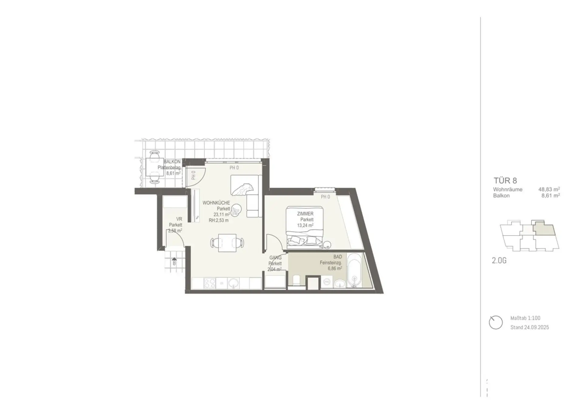 Fußläufige Anbindung an die U1 950 m (Kaisermühlen-VIC), Bus- und Straßenbahnnetz – schnelle Verbindung in die City und zu Einkaufszentren.