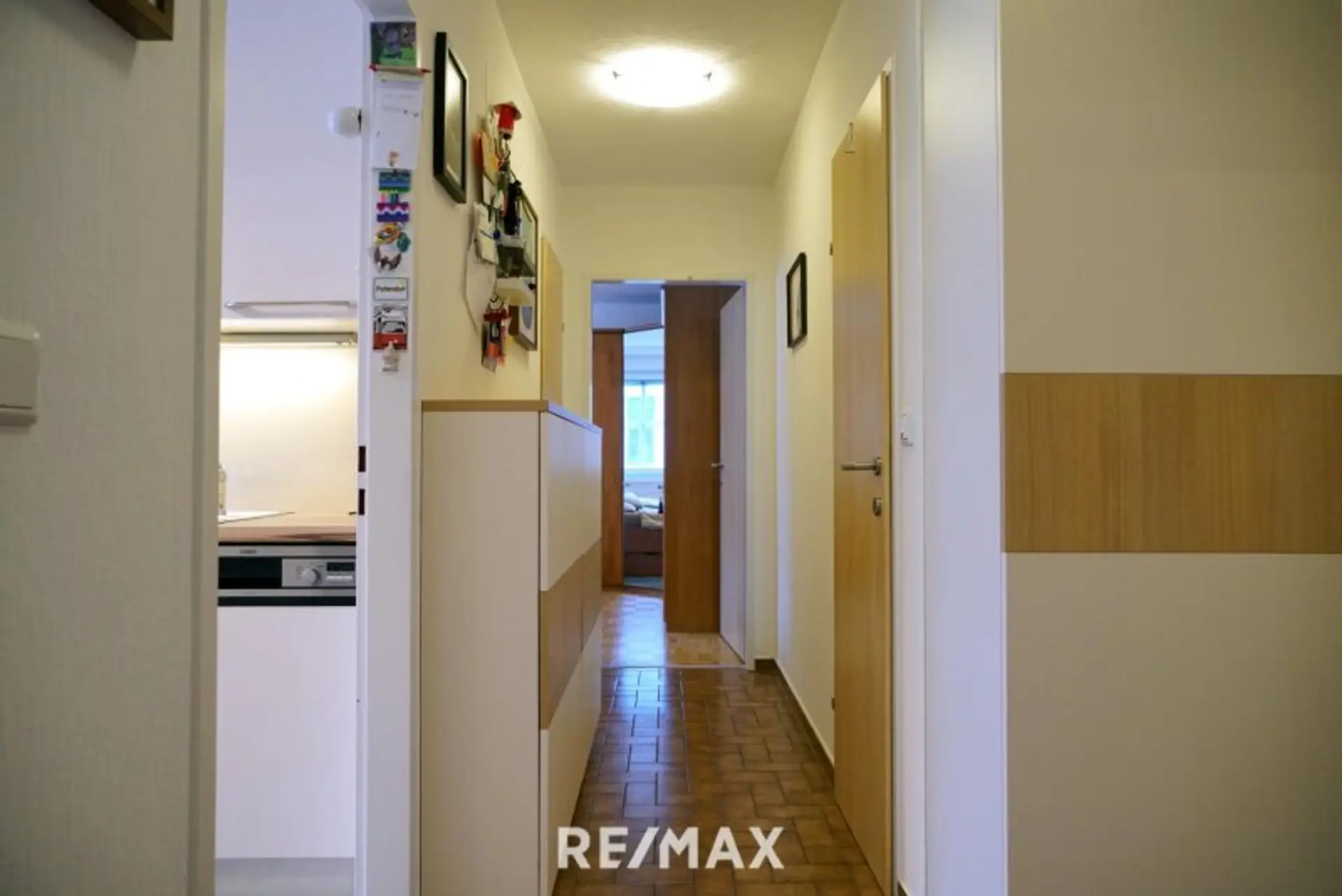 Über den zentralen Vorraum erreichen Sie das großzügige Wohnzimmer, die separate Küche, die Toilette, den praktischen Abstellraum sowie das Schlafzimmer. Vom Schlafzimmer aus gelangen Sie in das Badezimmer.
