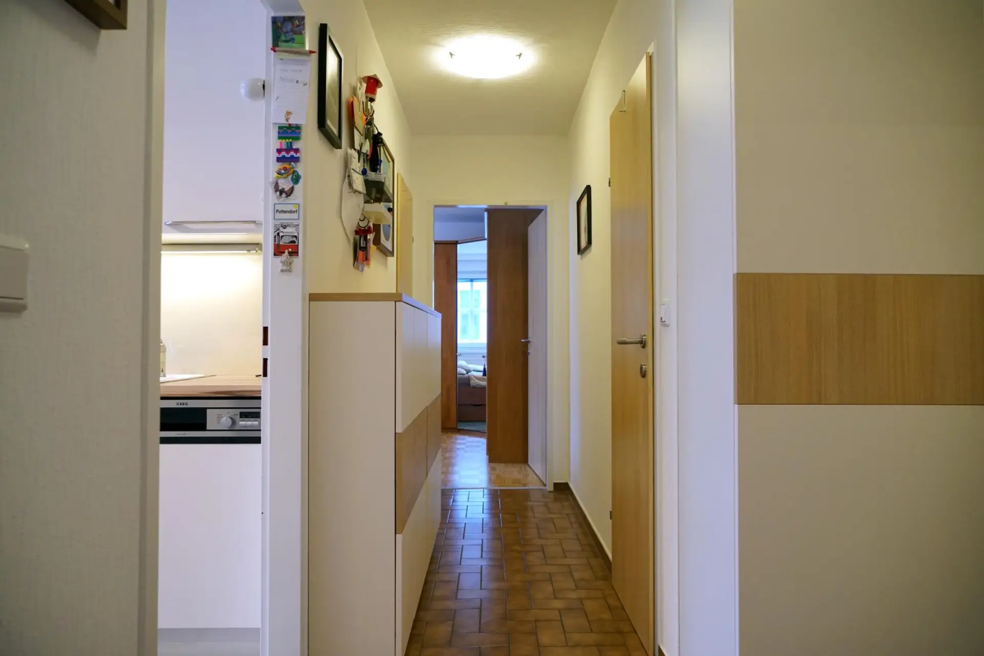 Über den zentralen Vorraum erreichen Sie das großzügige Wohnzimmer, die separate Küche, die Toilette, den praktischen Abstellraum sowie das Schlafzimmer. Vom Schlafzimmer aus gelangen Sie in das Badezimmer.