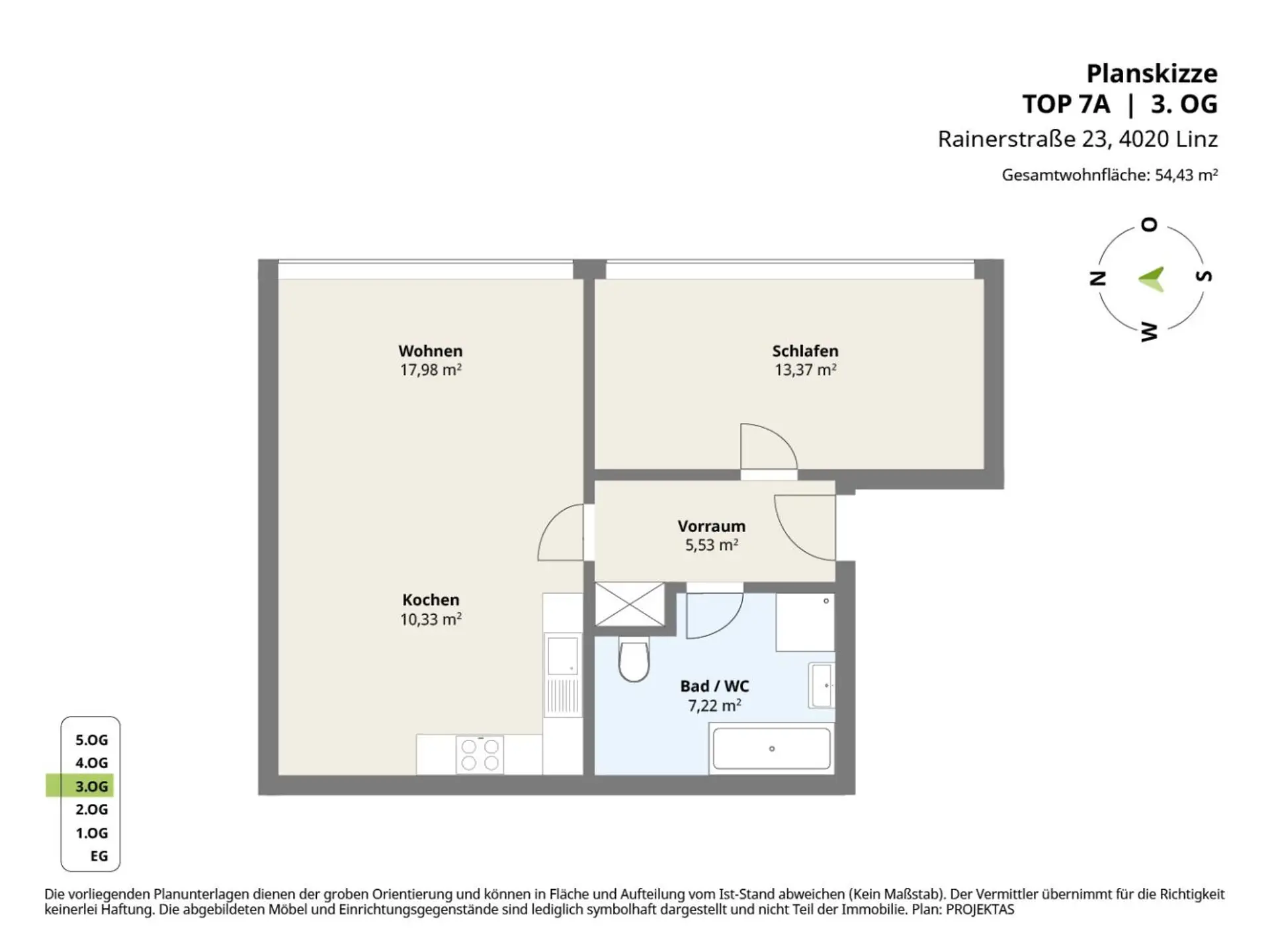 Raumaufteilung der Top 7a mit ca. 54,43 m² Wohnfläche: