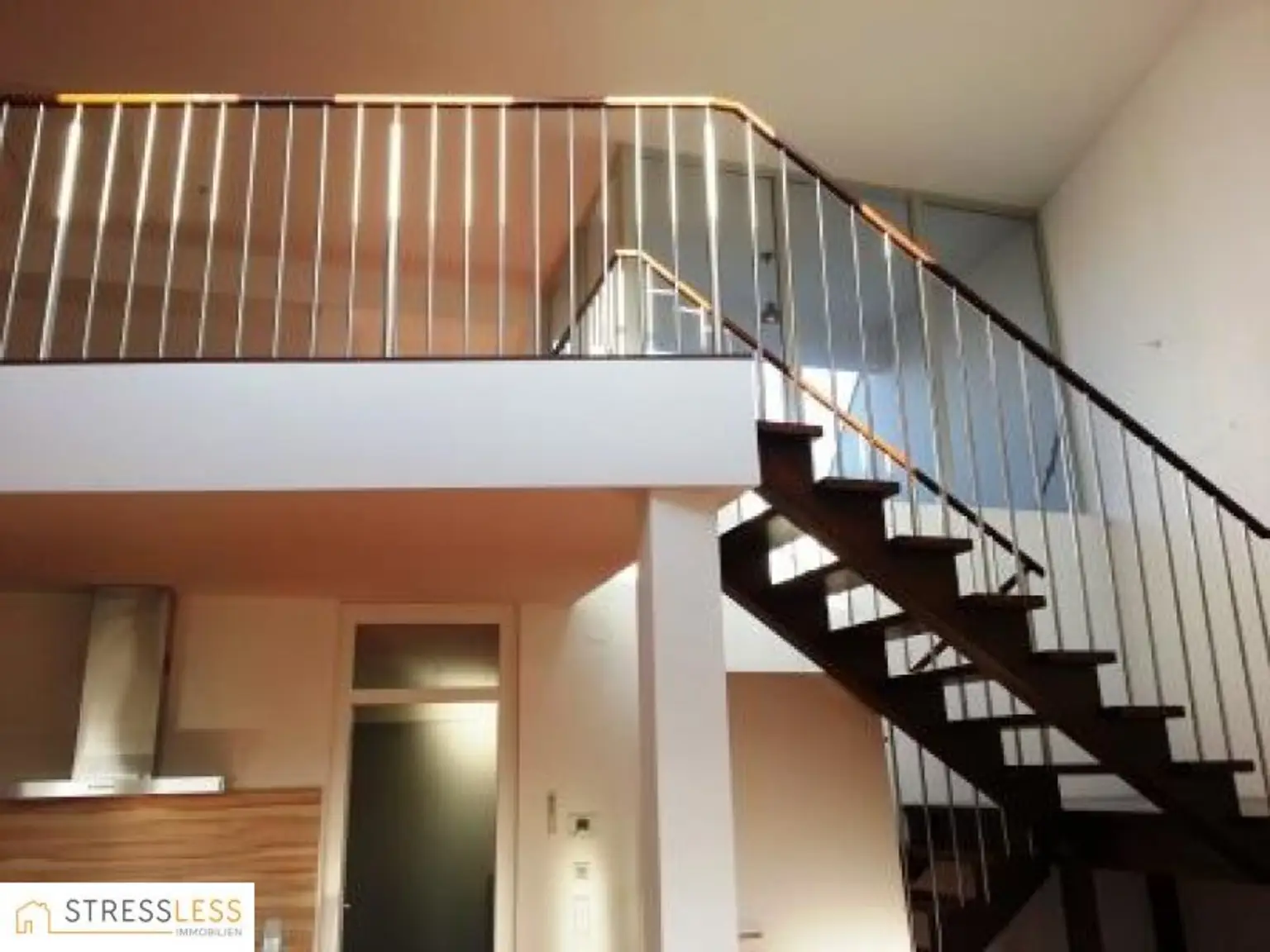 Über eine geschwungene Holztreppe gelangt man vom Wohnzimmer aus auf die obere Etage, hier befindet sich eine luftige Galerie, ein rund 35 m² großer Dachboden (Stauraum), sowie der Ausgang auf die Loggia, bzw. vorgelagerte Terrasse (13 m²).
