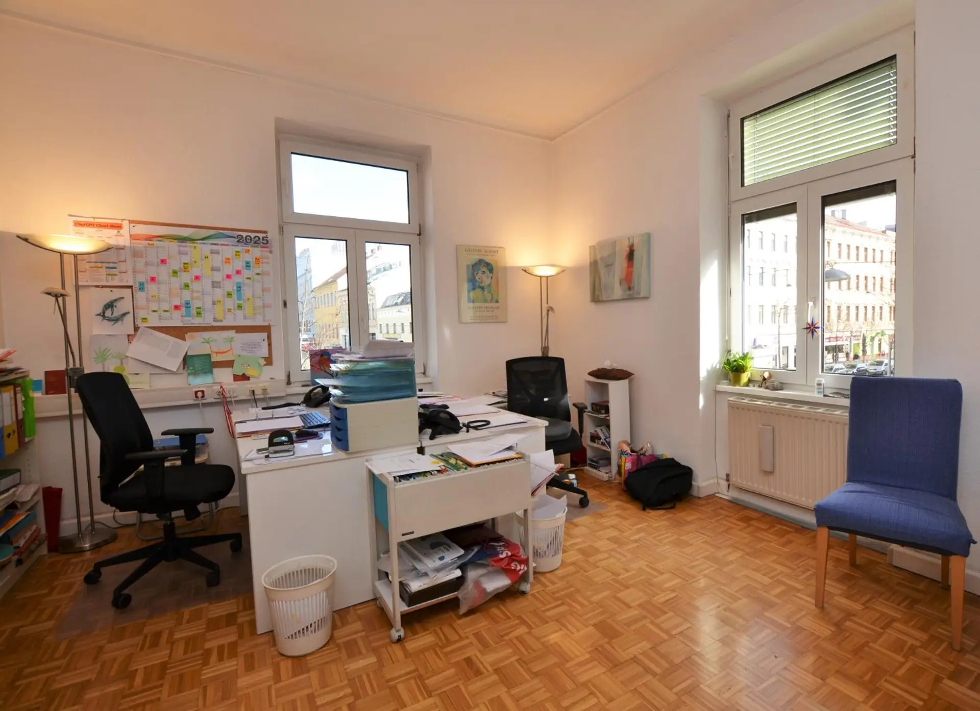Große Fenster sorgen für eine angenehme Belichtung und schaffen eine freundliche Arbeitsatmosphäre. Parkettböden unterstreichen den repräsentativen Charakter der Räume und verleihen der Einheit eine wertige Ausstrahlung.