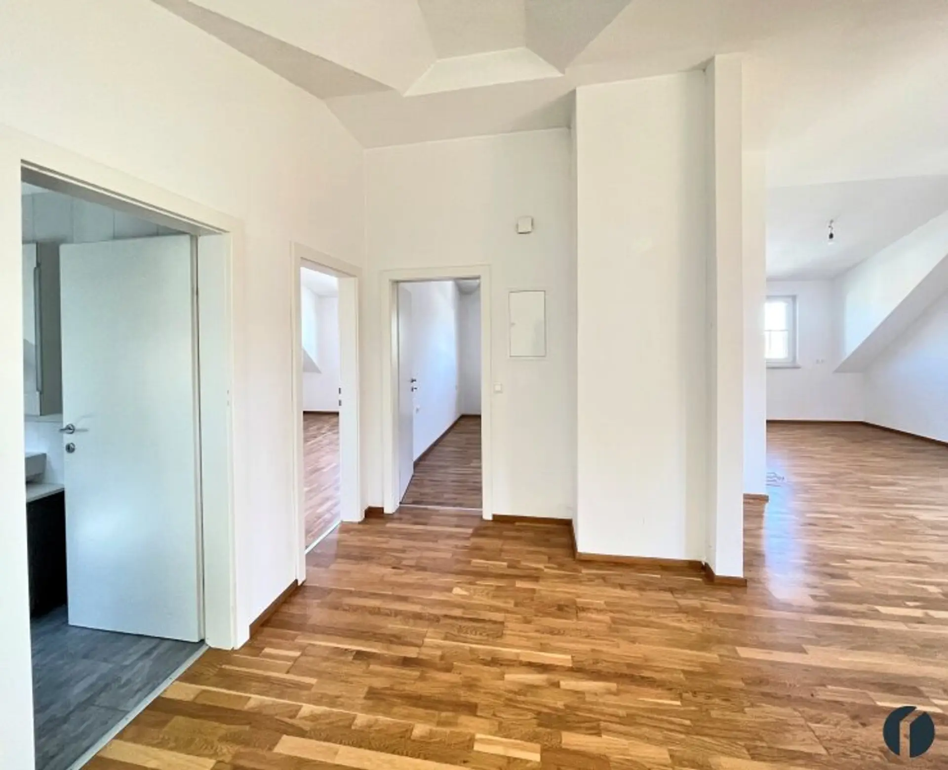 Die Wohnung besticht durch seine durchdachte Raumaufteilung die ein behagliches Raumgefühl schafft. Der separate Eingang zur Wohnung befindet sich im Erdgeschoss. Ein kleiner Vorraum bietet Platz für eine Garderobe, unter dem Stiegenaufgang gibt es Stauraum etwa für Schuhe oder weniger oft benutzte Sachen.