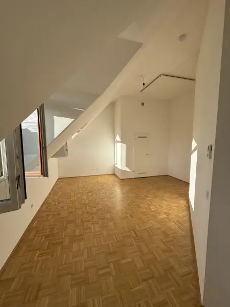 Die Dachschrägen im 6. Stock verleihen der Wohnung Charakter und eine gemütliche, urbane Atmosphäre.