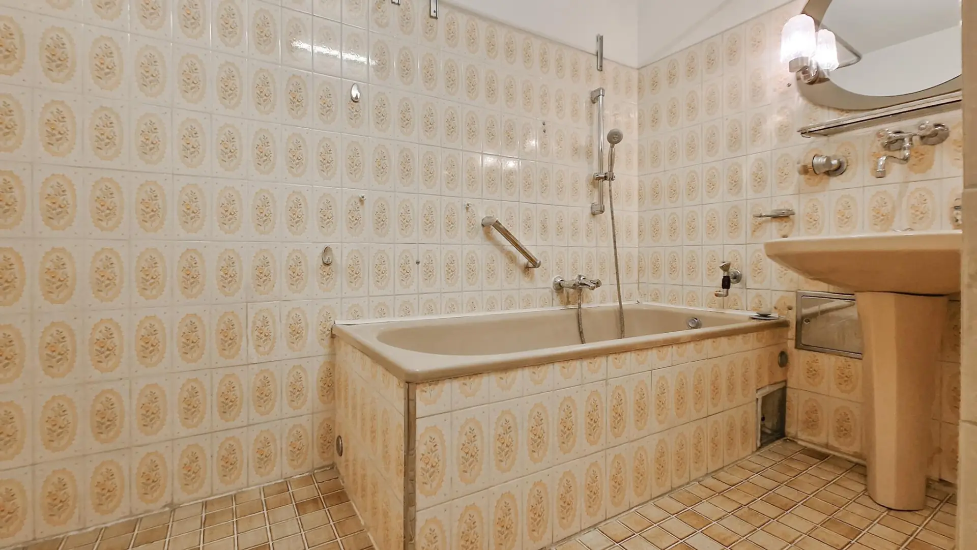 • Badezimmer mit Wanne, Waschbecken und Platz für eine Waschmaschine