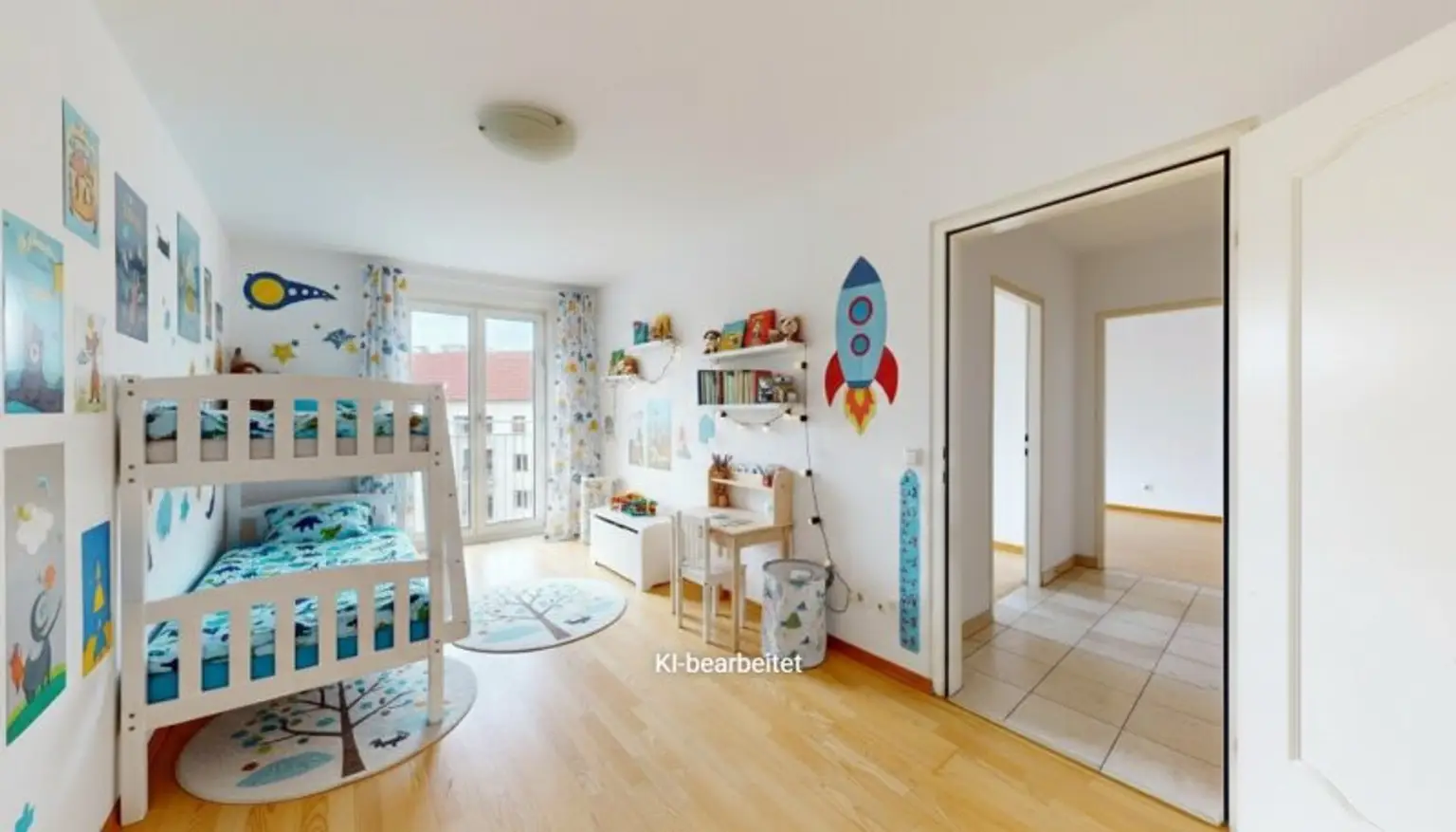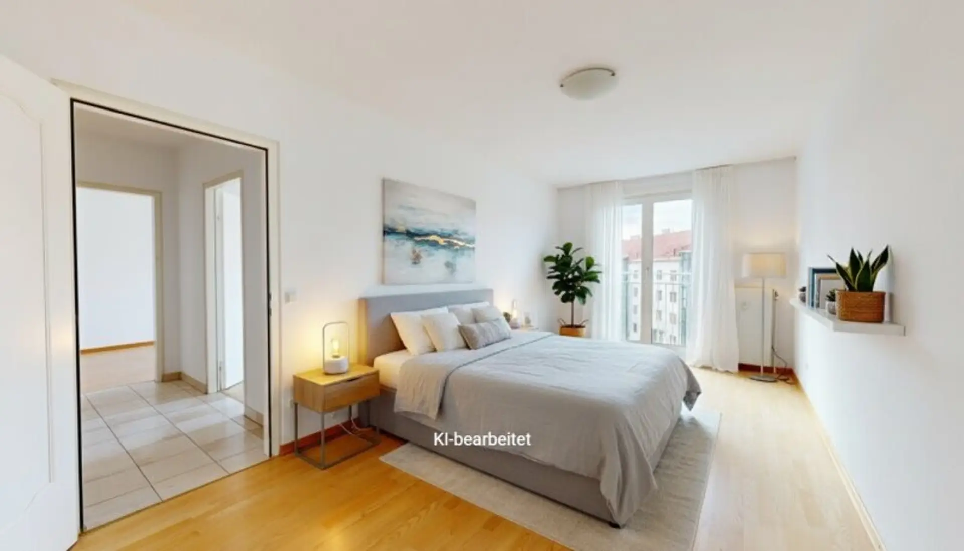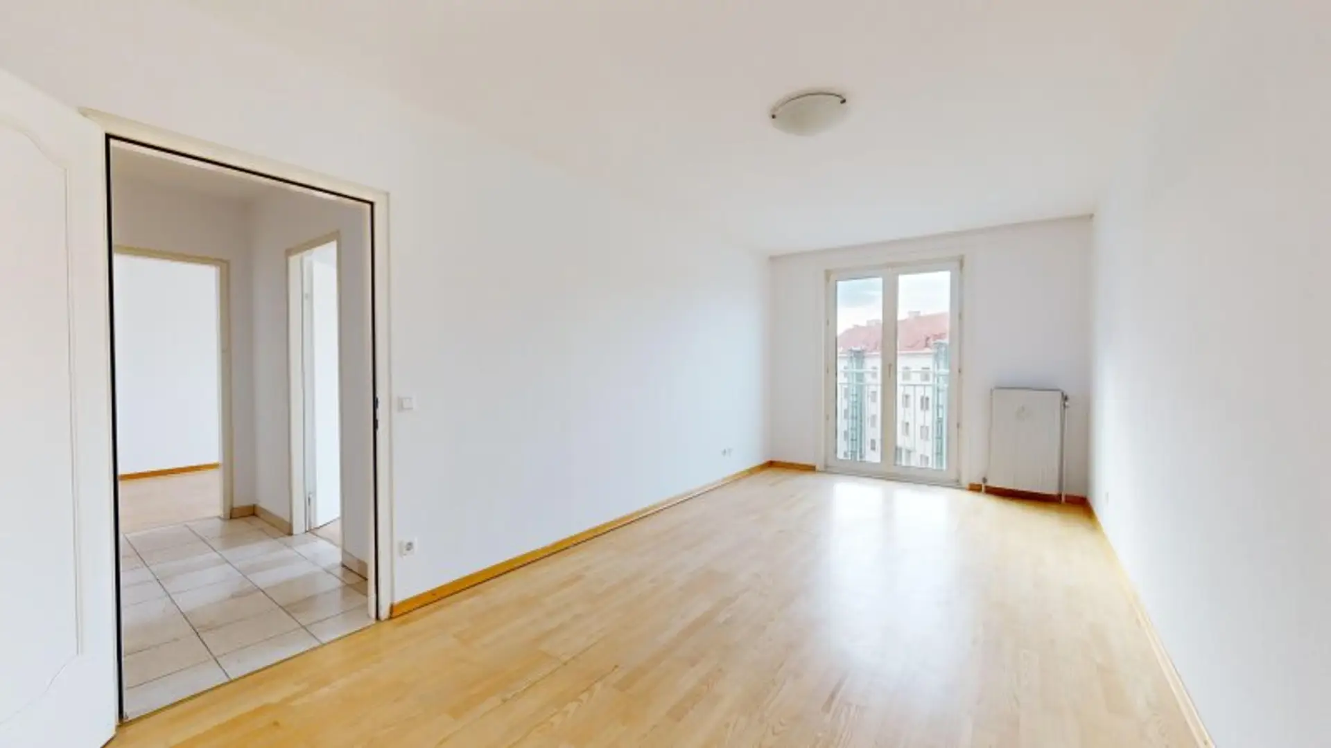 Großzügige, zentral begehbare 4-Zimmerwohnung. Sehr großes 44m² Wohnzimmer plus 3 Schlafzimmer. Separate Küche mit allen elektrischen Geräten, Badezimmer mit Eckbadewanne und Waschmaschinen-Anschluss, separate Toilette und Abstellraum. Praktischer, strapazierfähiger Fliesenboden in allen Räumen außer den Schlafzimmern in denen sich Parkettböden befinden. Angenehme französische Balkone und damit helle Fensterfronten in allen Zimmern.