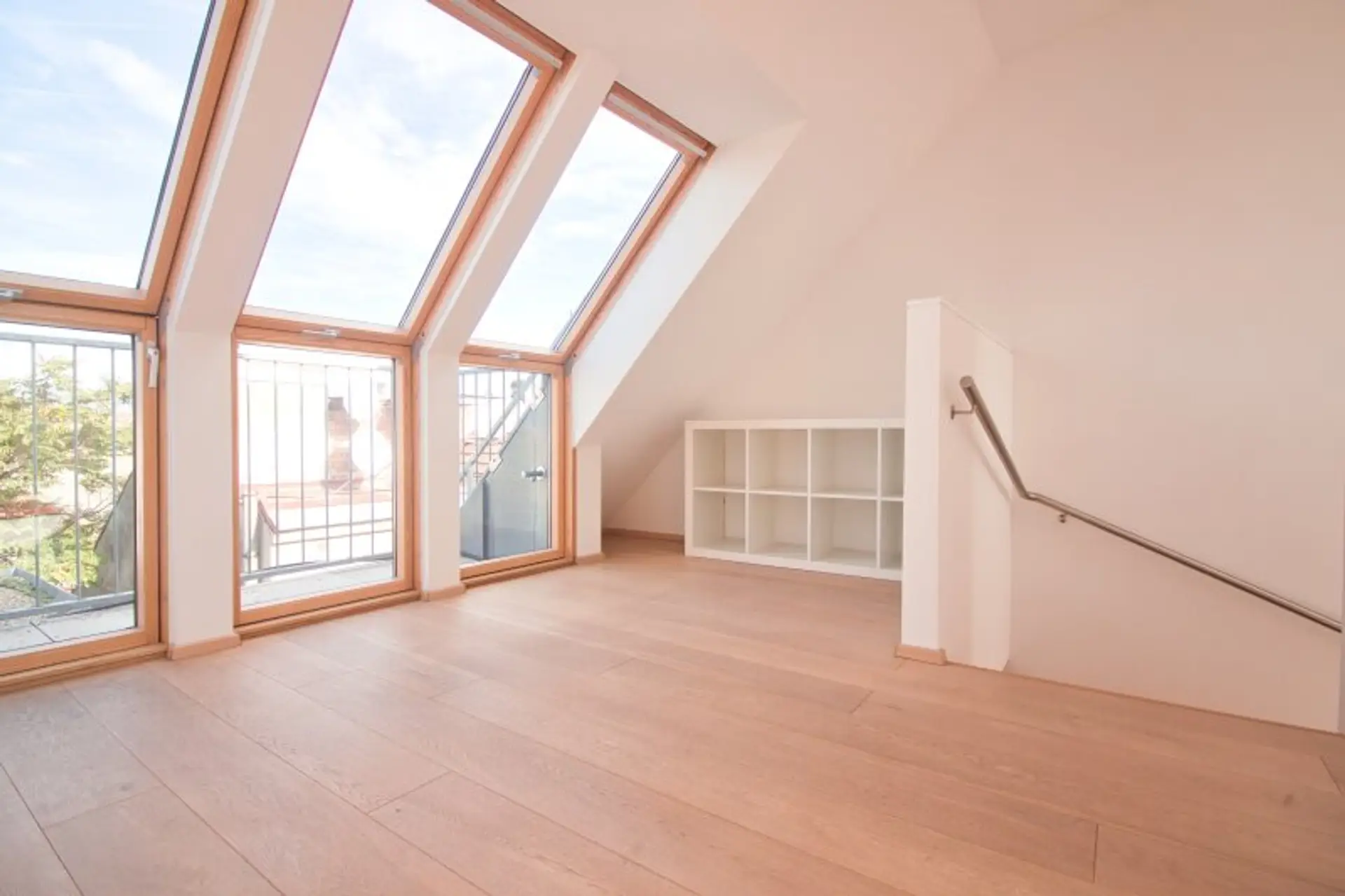Über eine geschmackvolle Holztreppe gelangt man in das obere Geschoss der Wohnung. Hier erwartet Sie eine traumhafte Galerie mit rund 27 m² – aktuell als offener Raum gestaltet, könnte dieser Bereich bei Bedarf abgeteilt werden, um beispielsweise einen ruhigen Arbeitsplatz oder ein Gästezimmer zu schaffen. Von hier aus betreten Sie auch die kleine, feine Terrasse mit herrlichem Weitblick über die Dächer Wiens.