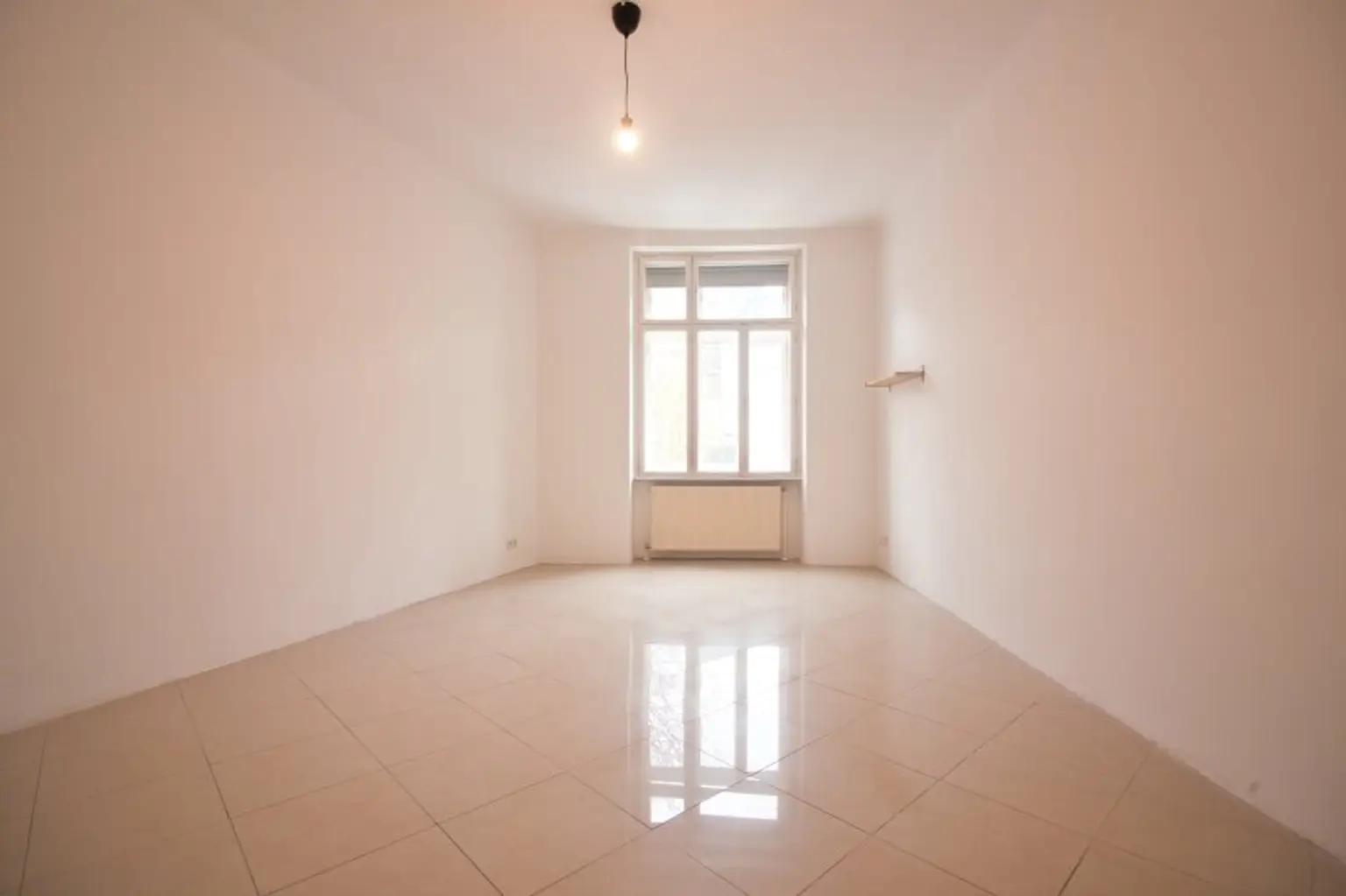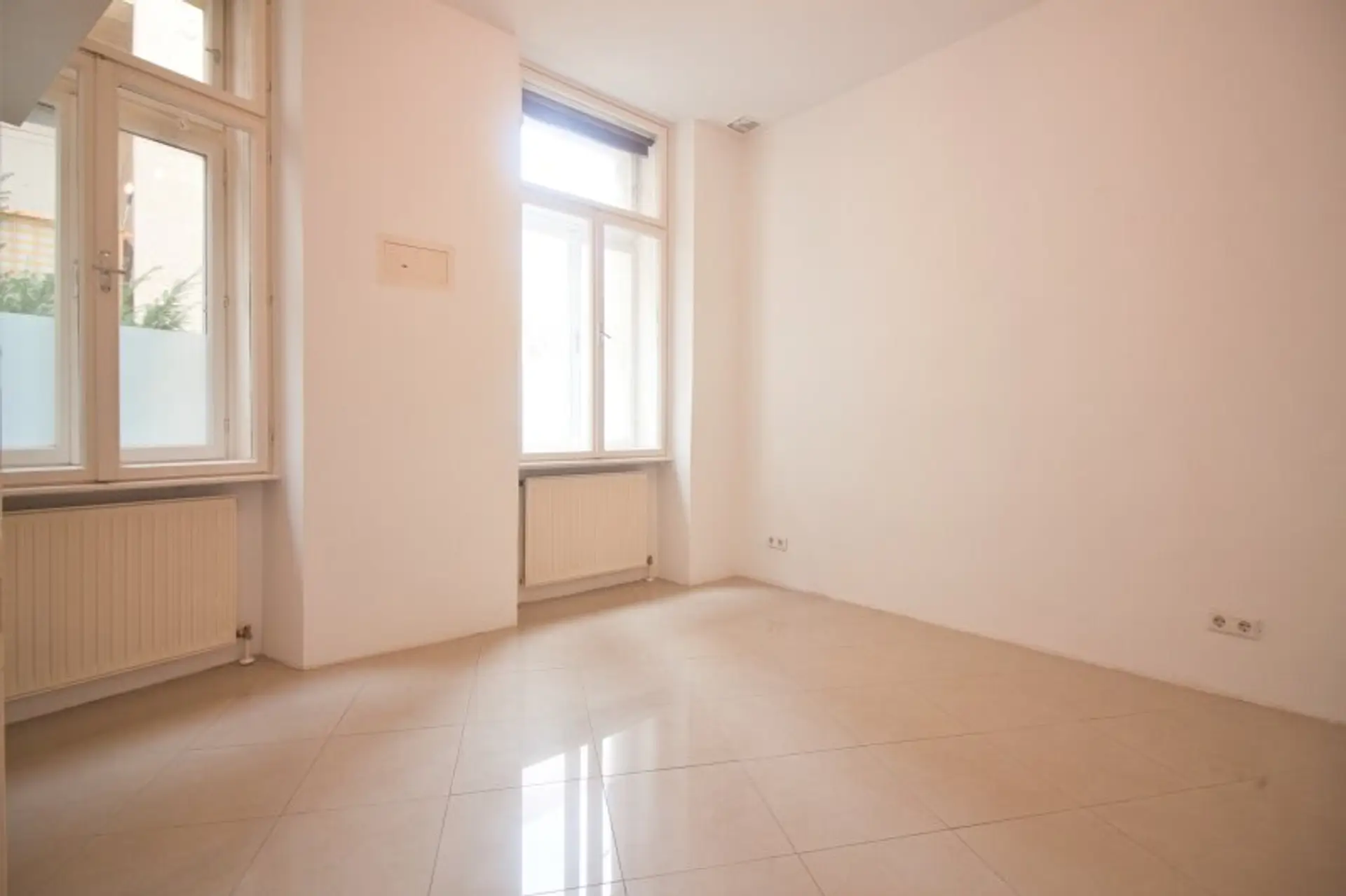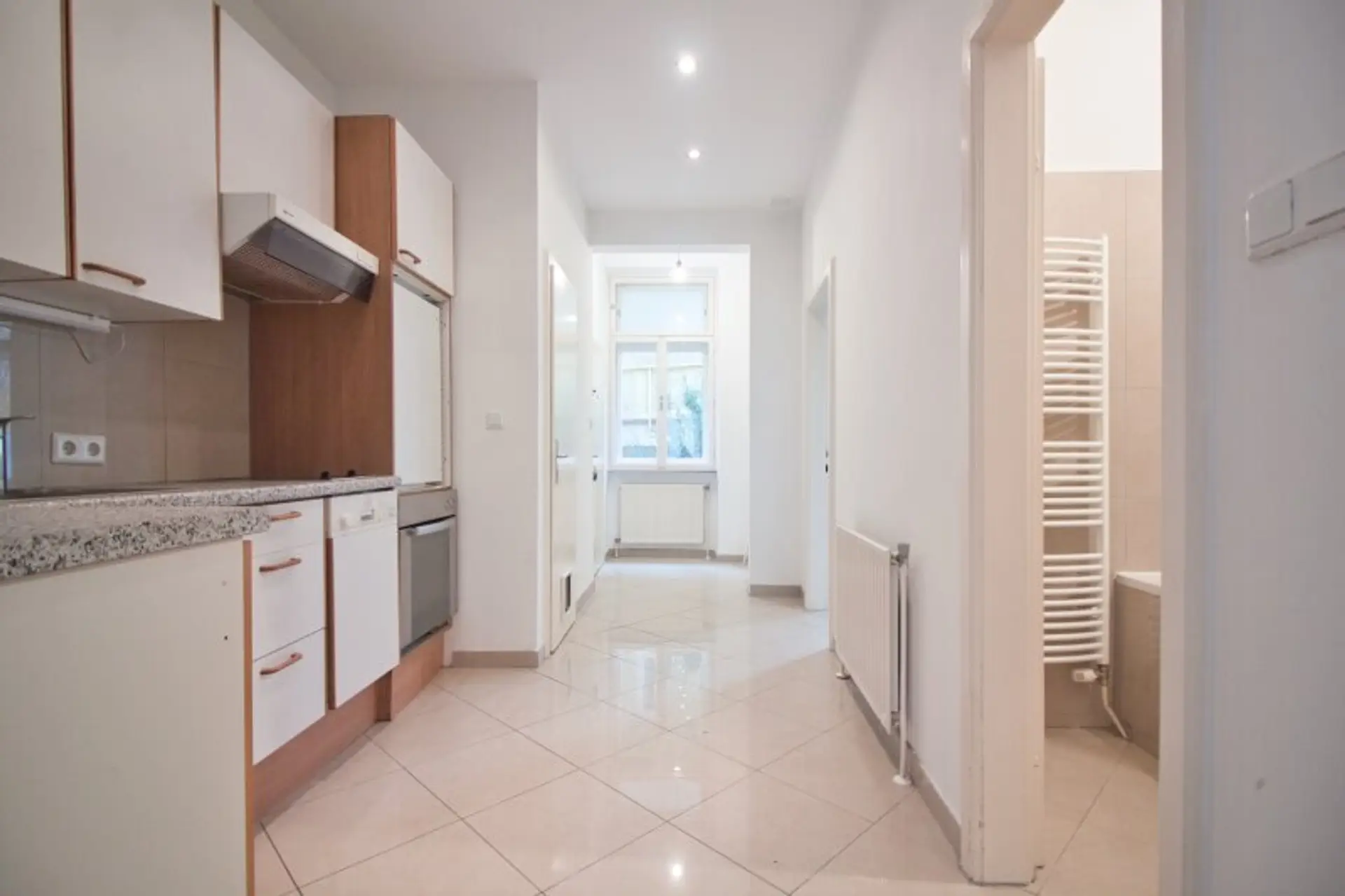 Der verlängerte Vorraum verfügt über eine separate Küche und erschließt ein großzügiges Badezimmer mit Waschtisch, Badewanne, Handtuchheizkörper und Waschmaschinenanschluss sowie ein westseitig und in eine ruhige Seitengasse (Greinergasse) ausgerichtetes, gut geschnittenes Wohnzimmer.