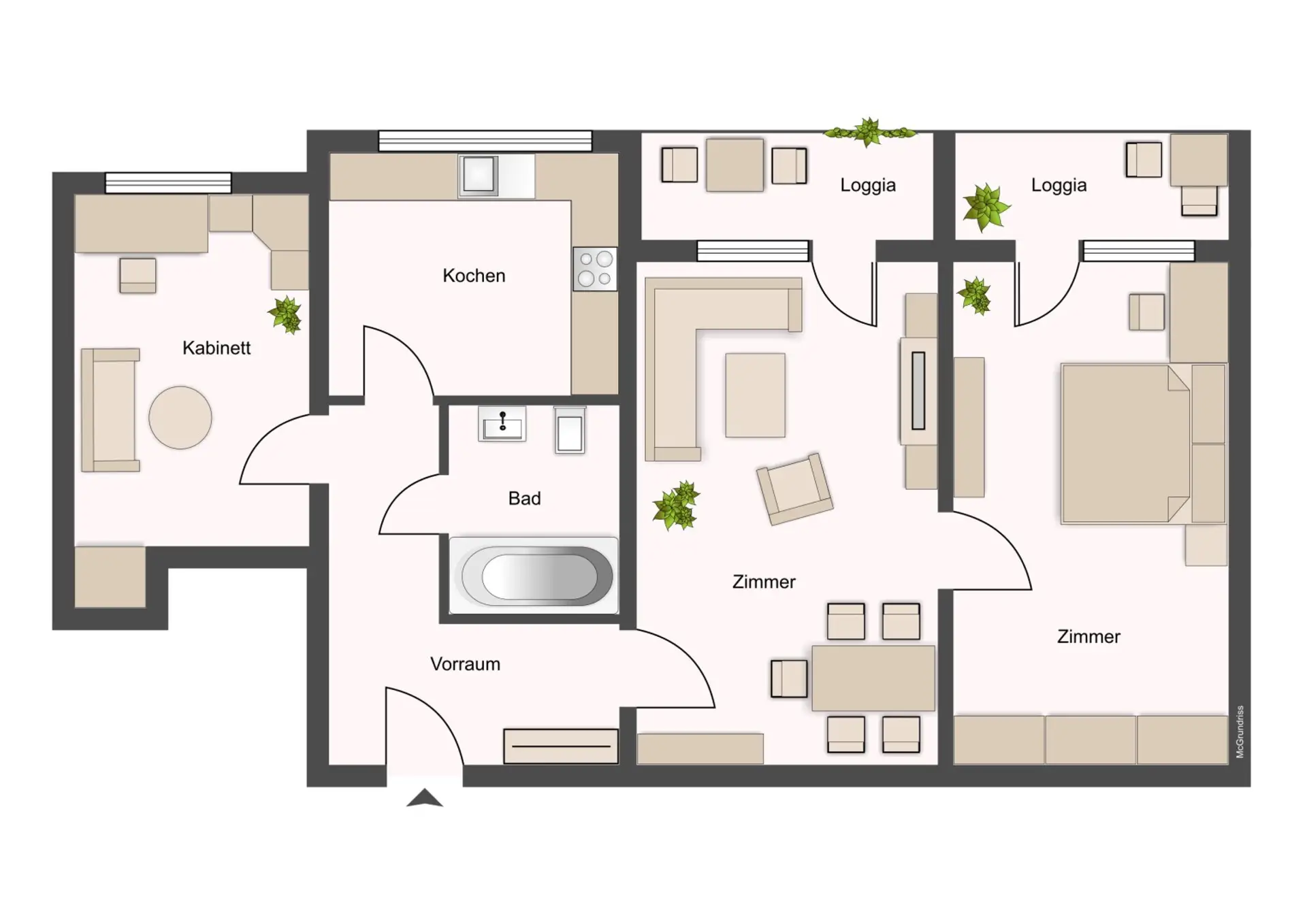 Die Wohnung verfügt über drei geräumige Zimmer, darunter zwei helle Schlafzimmer und ein modern ausgestattetes Badezimmer.