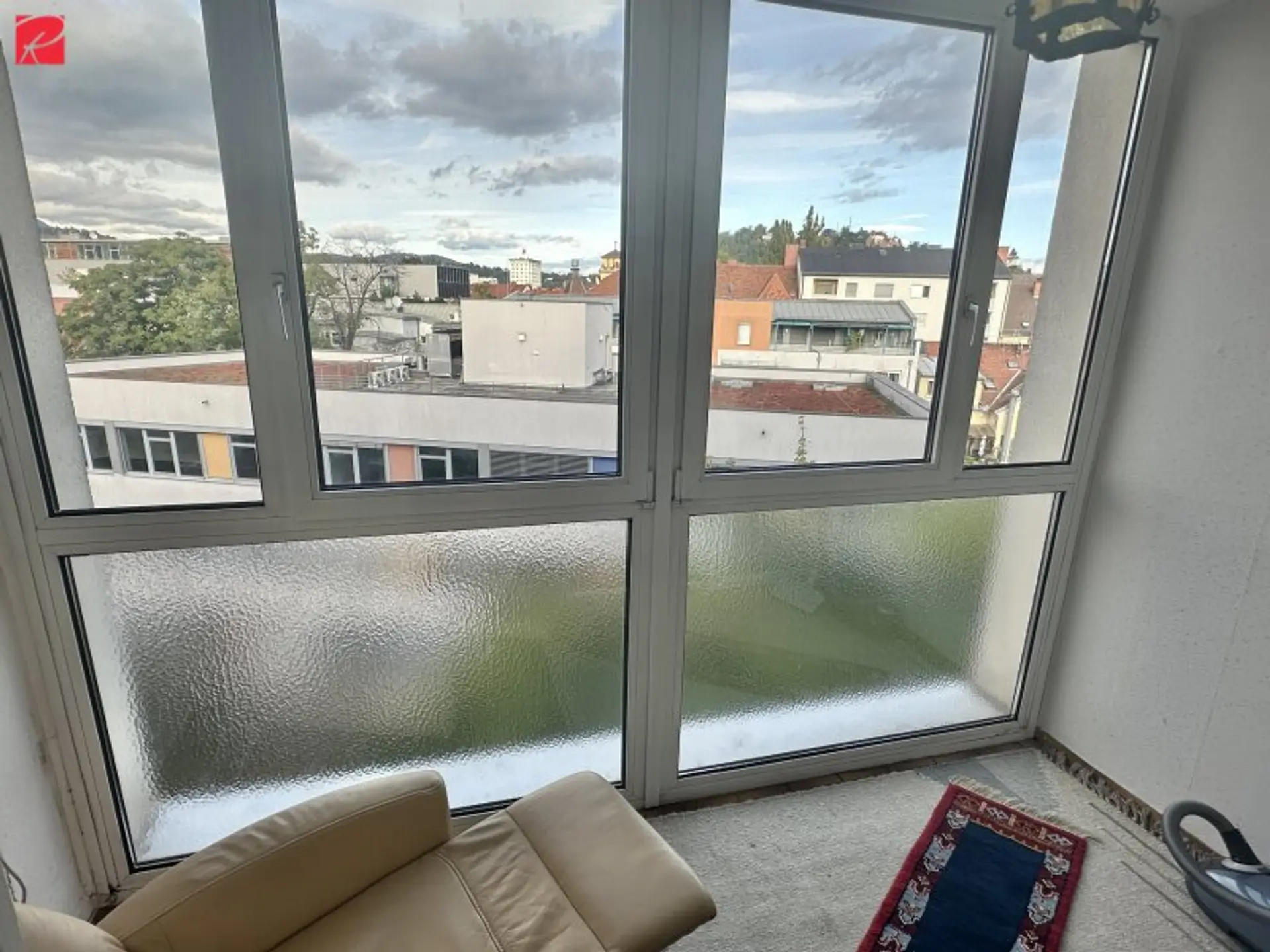 Geschlossene Loggia mit Blick auf Schlossberg, Schöckl & Graz