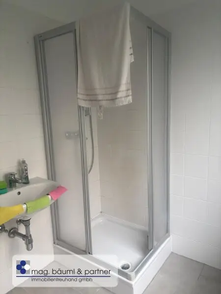 * Badezimmer mit Dusche , Fenster und Waschmaschinenanschluss