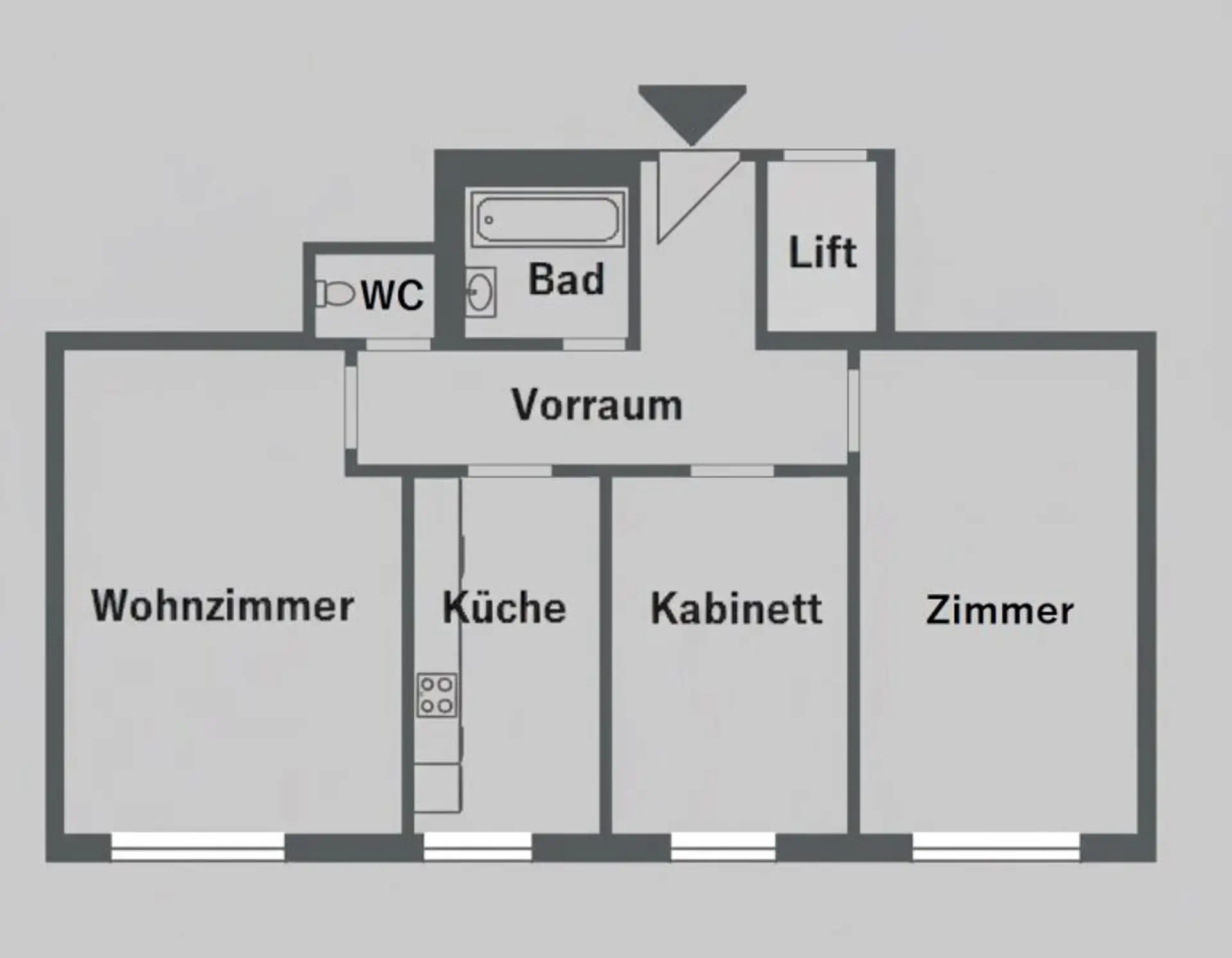 Die Wohnung verfügt über ein ca.20 m² großes Wohnzimmer, einer Küche direkt neben dem Wohnzimmer mit einem Gasdurchlauferhitzer für das Warmwasser, einem ca. 11,16 m² Kabinett, einem Schlafzimmer mit ca. 17,24 m², einem Bad mit Wanne und Waschbecken, einem separaten WC und einem Vorraum, von dem aus alle Räume zentral begehbar sind. Alle Zugangstüren zum Haus sind automatisch zu öffnen, vom Eingang zum Lift gibt es ein paar Stufen mit einer elektrischen Rampe, der Zugang zur Wohnung ist also Barrierefrei. Alle Zimmer sind zur Johnstraße ausgerichtet, also in Richtung Osten. Es können im Hof des Hauses auch Parkplätze angemietet werden.