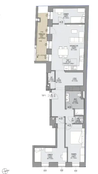 Sie betreten die Wohnung und befinden sich im Vorraum. Links gelangen Sie in eine großzügige Wohnküche mit Anschlüssen für eine offene Küche und es gibt Zugang zu der schönen Terrasse. Gleich neben der Wohnküche befindet sich das Kabinett. Beim Eingang rechts gelangen Sie zu den zwei Schlafzimmern. Der Abstellraum mit Waschmaschinenanschluss, das Badezimmer mit Dusche, WC und Doppelwaschbecken sowie ein separates WC befinden sich im Vorraum.