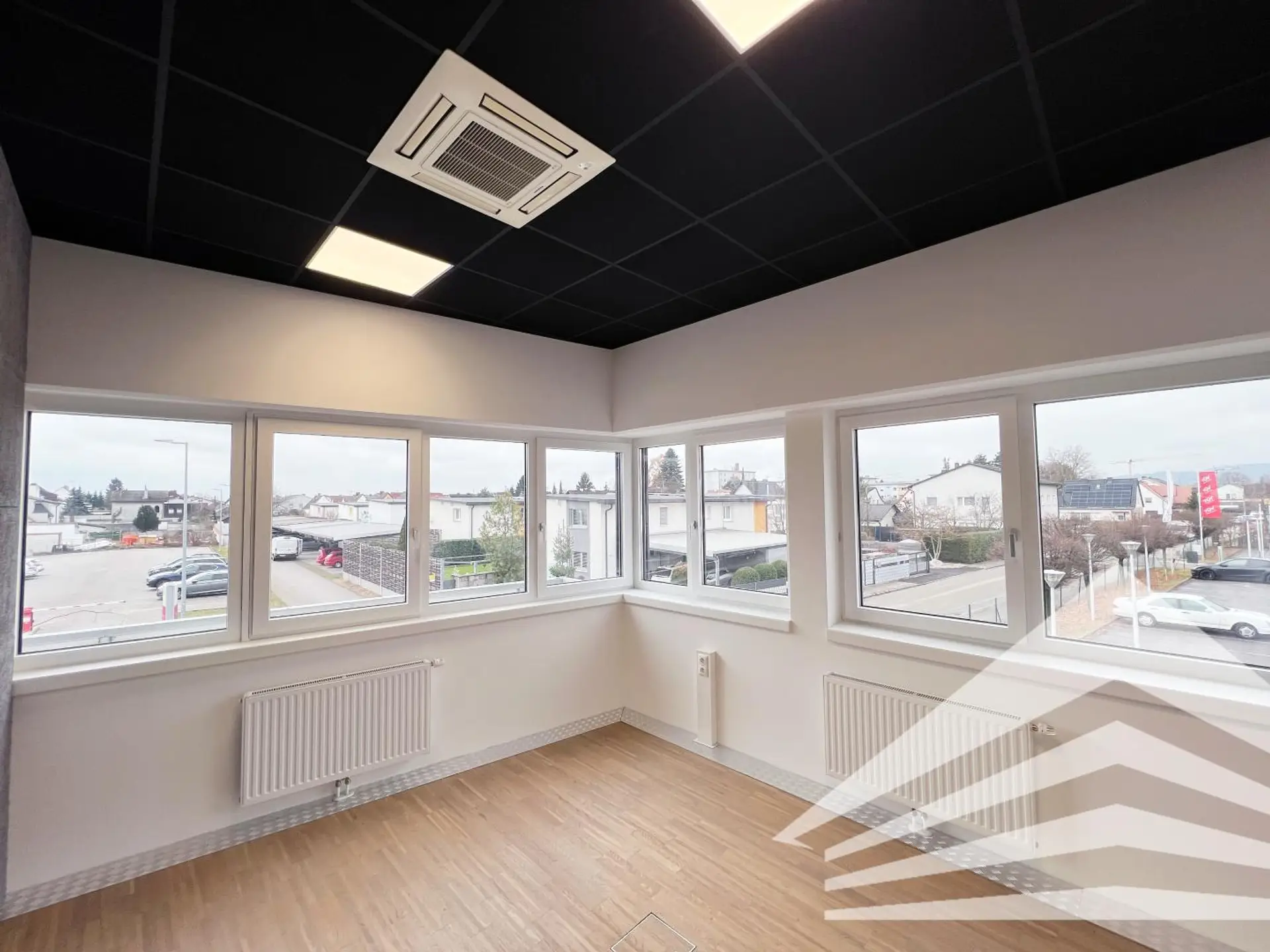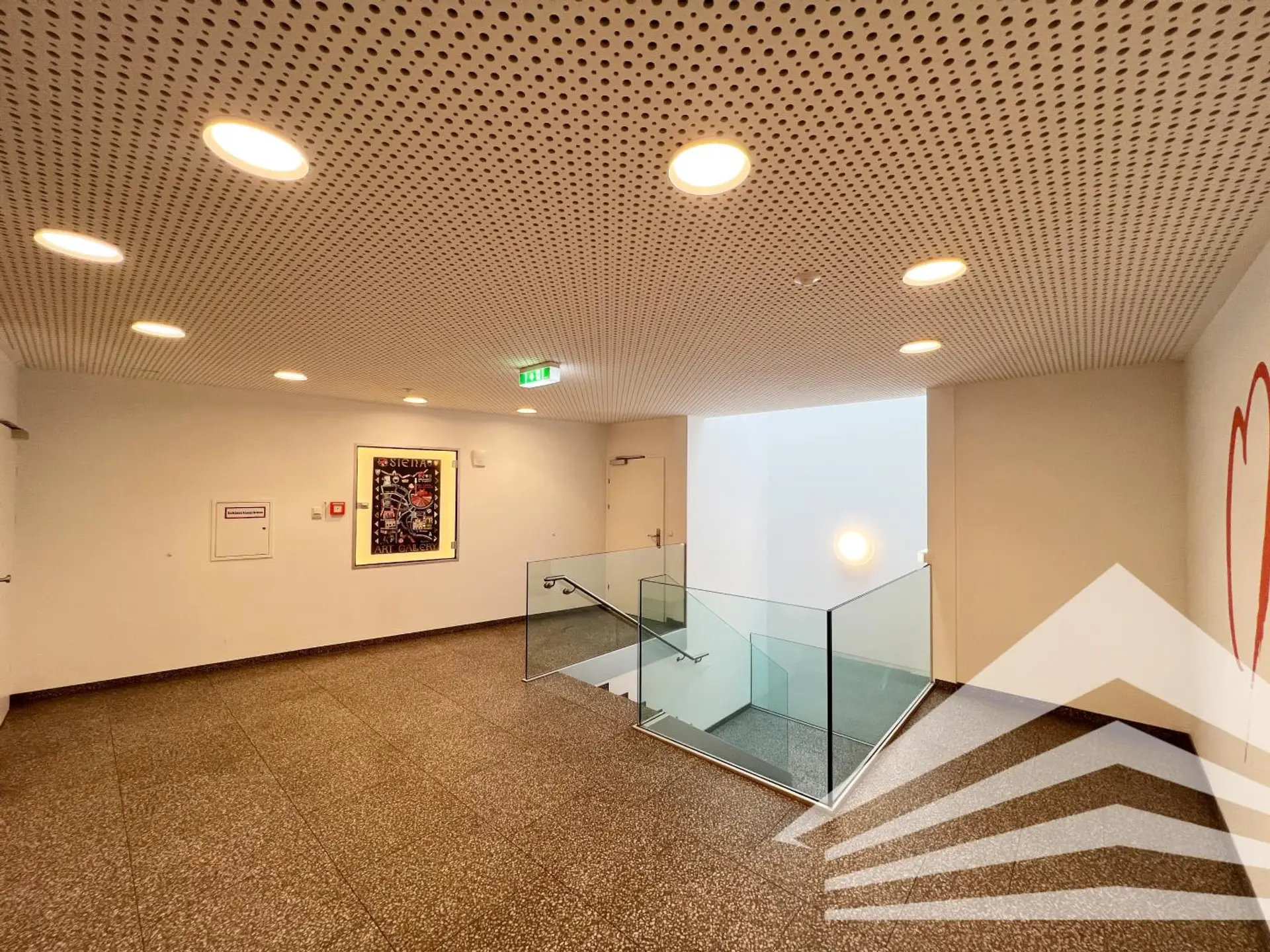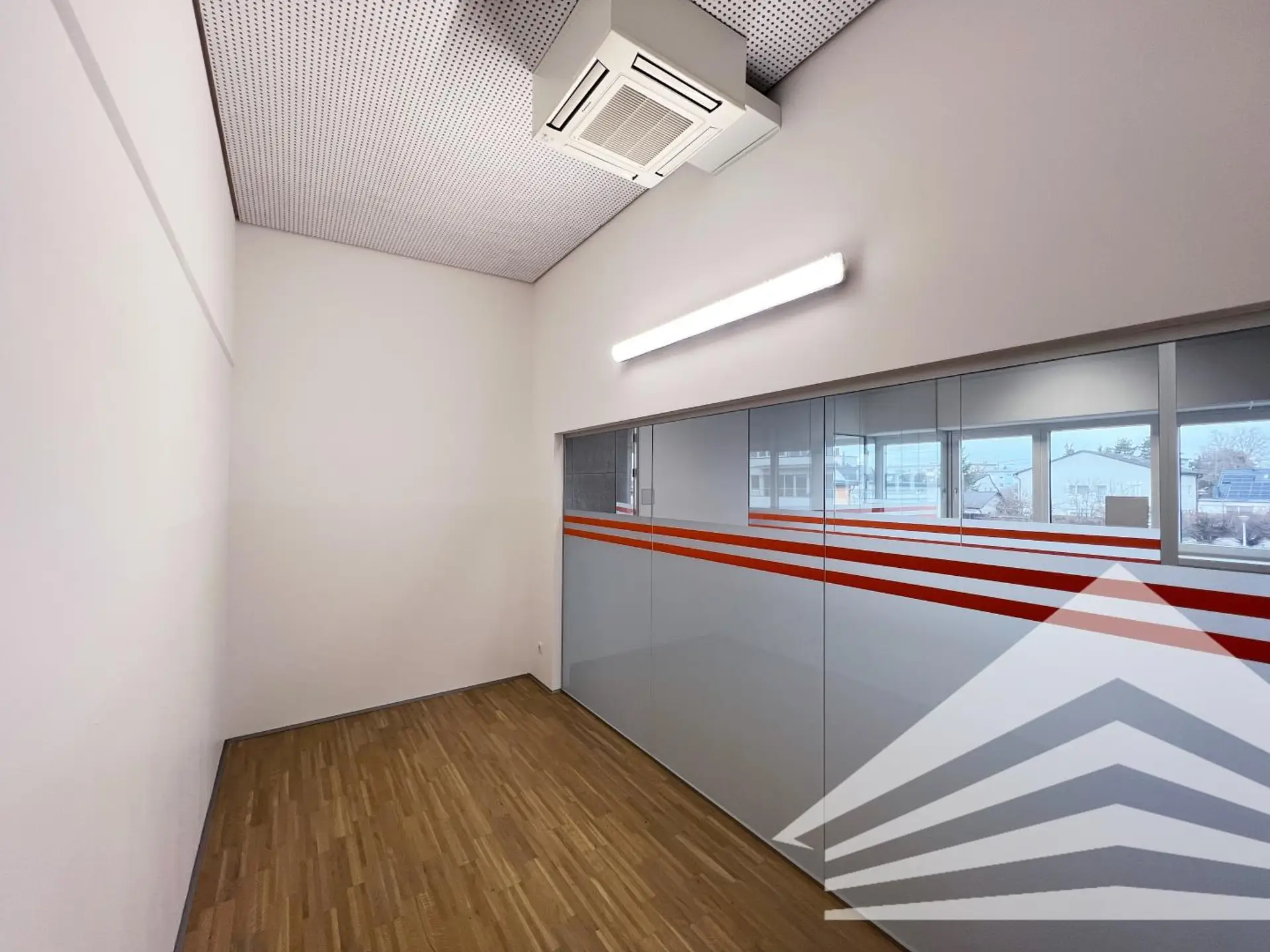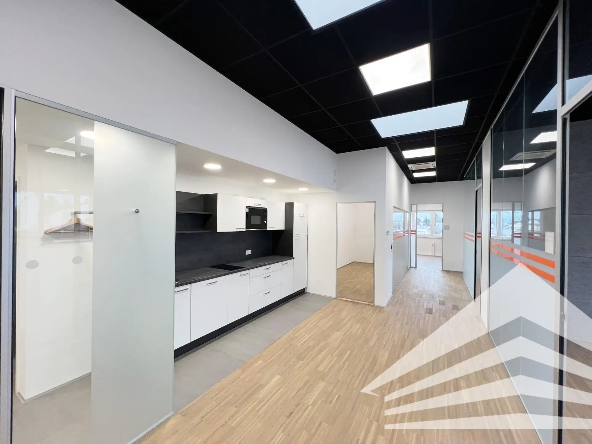 Dieses ca. 128 m² große Büro im ersten Stock des Doppl Centers ist gut aufgeteilt und bietet neben einer offenen Teeküche im zentralen Bereich 5 Büroräume, einen Besprechungsraum und einen abgetrennten Serverraum. Besonders attraktiv gestaltet ist die Raumaufteilung durch den Einsatz von Glastrennwänden. Selbstverständlich sind die Räumlichkeiten klimatisiert. Zu erwähnen ist die im Sanitärbereich integrierte Dusche.